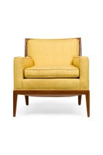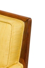 American Mid-Century square back yellow fabric upholstered a\rmchairs with piping on the edges with a seat cushion, ending on tapered and splayed wooden legs. (RETROWOOD FURNITURE) (5 side chairs 064288C; 2 sofas 064288A)(PRICED EACH).
