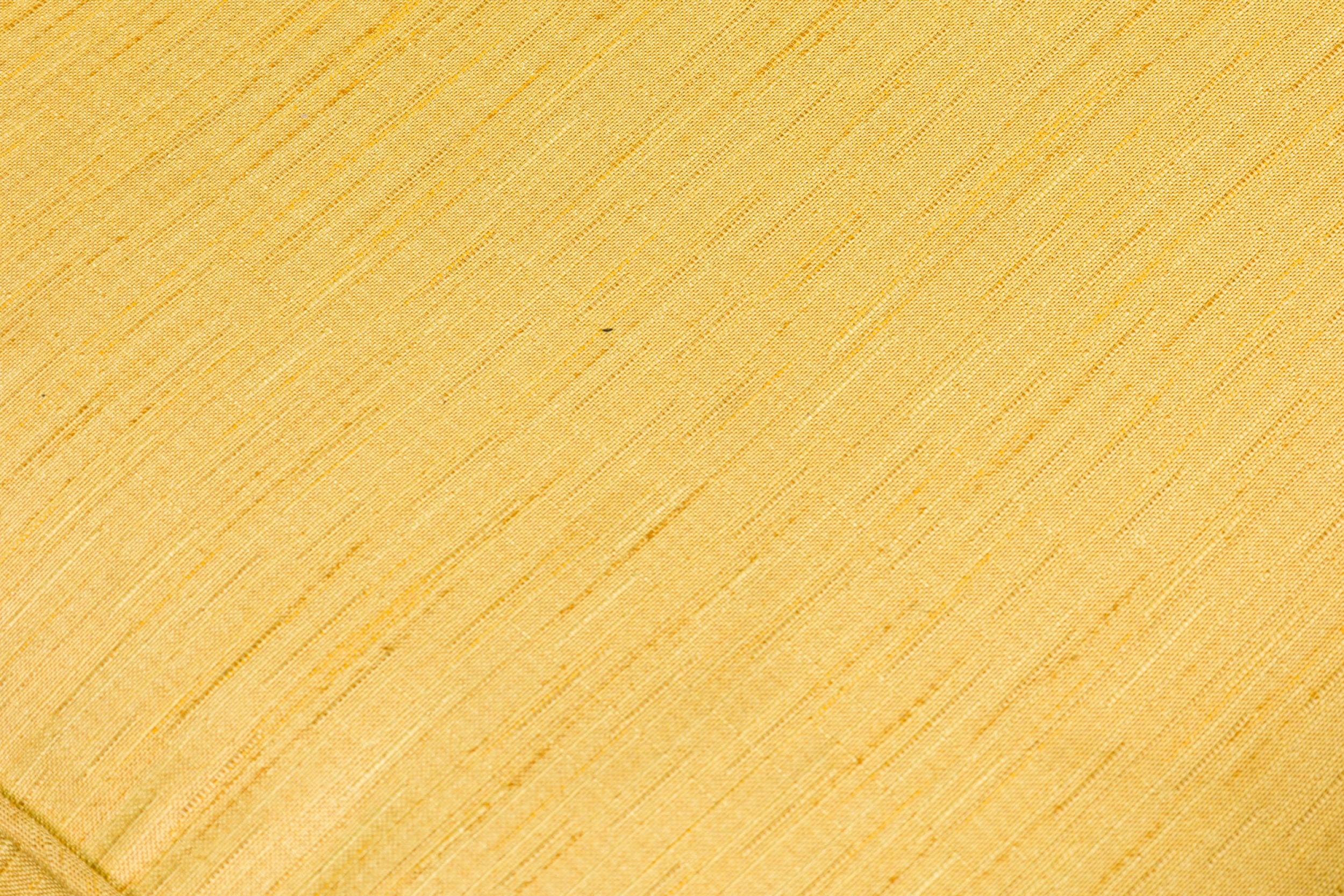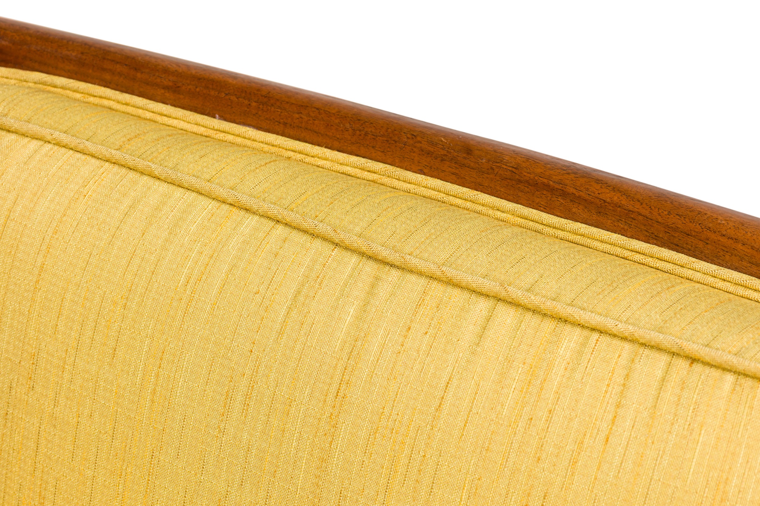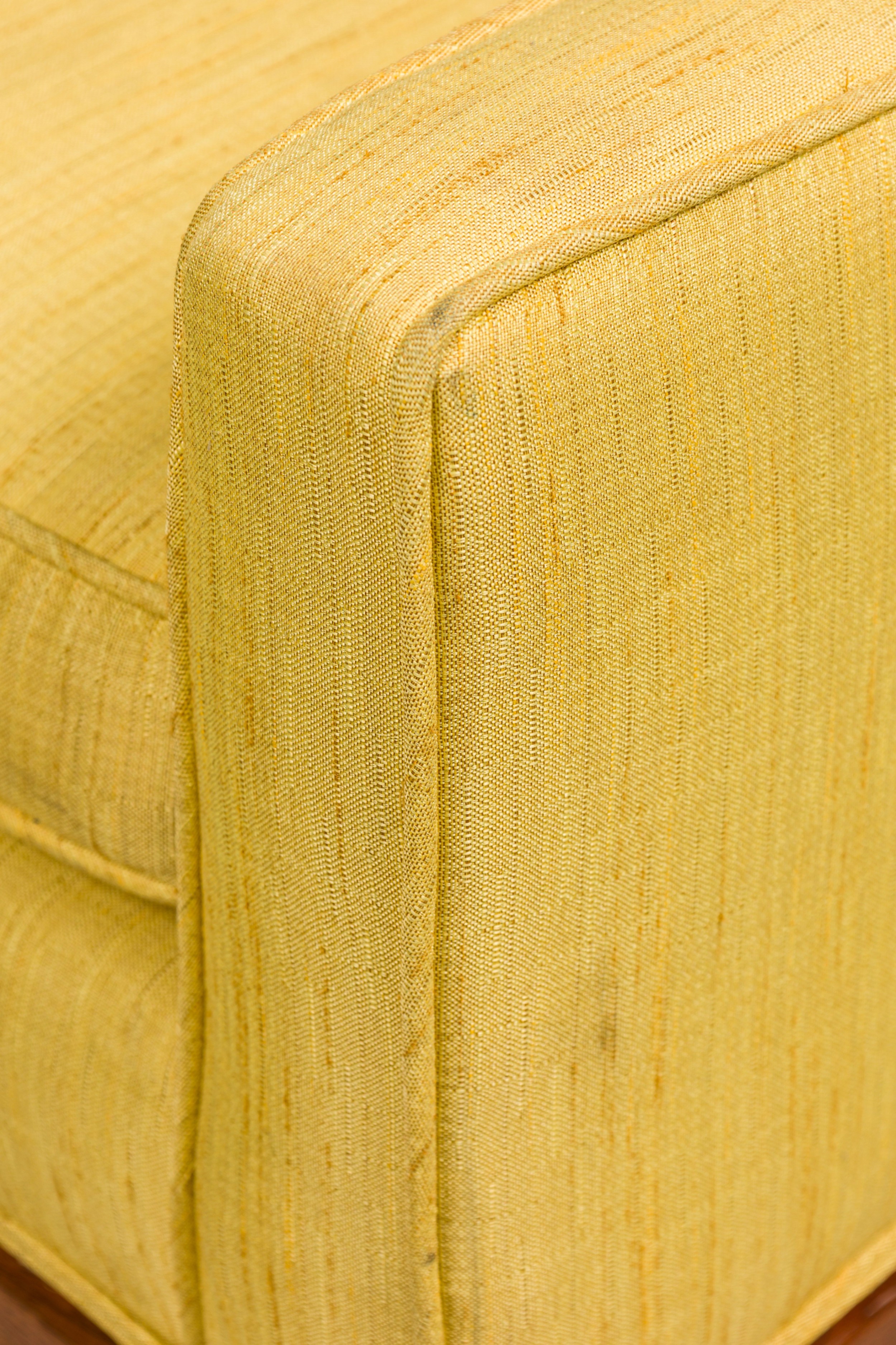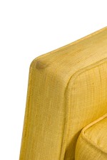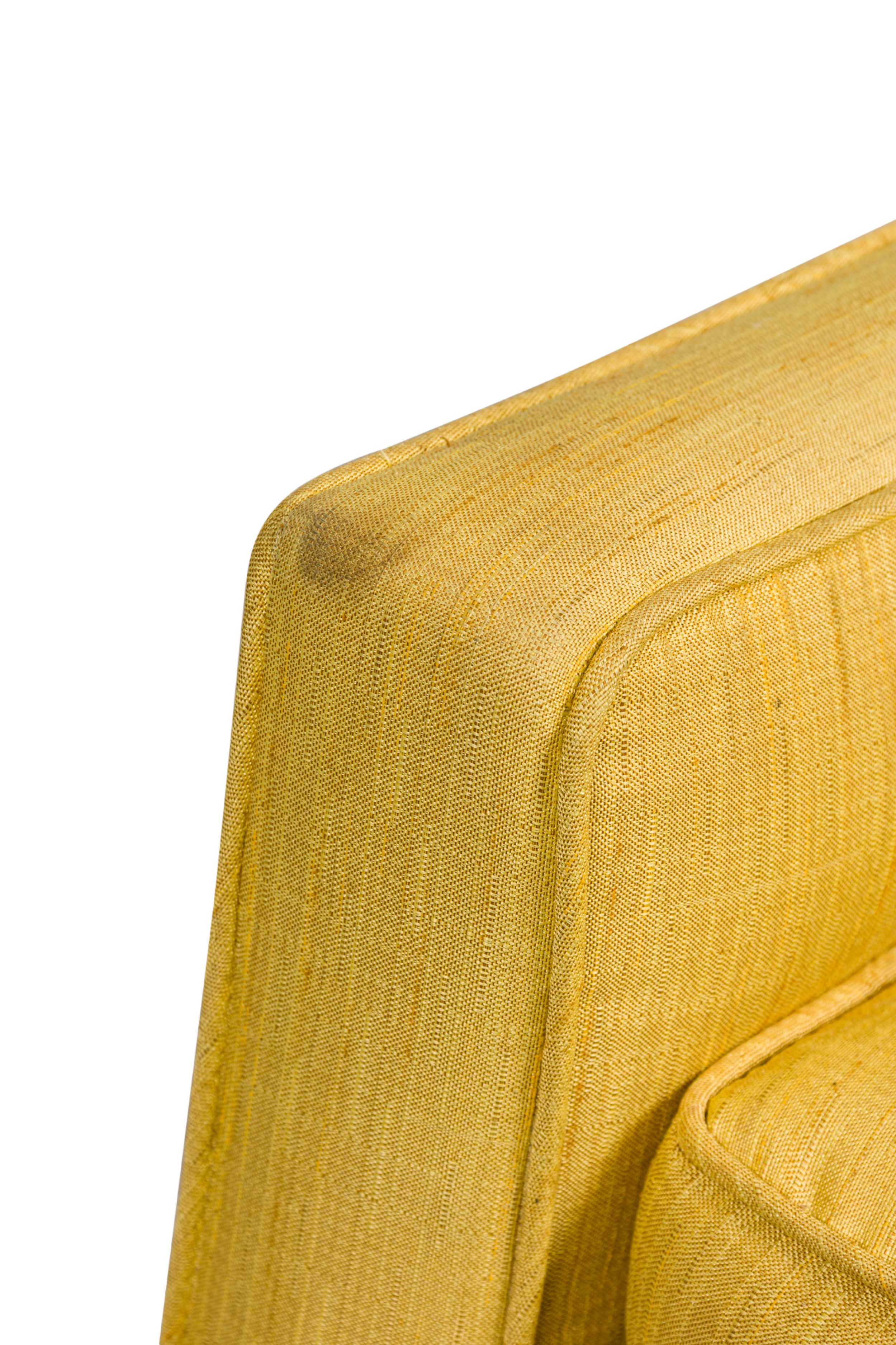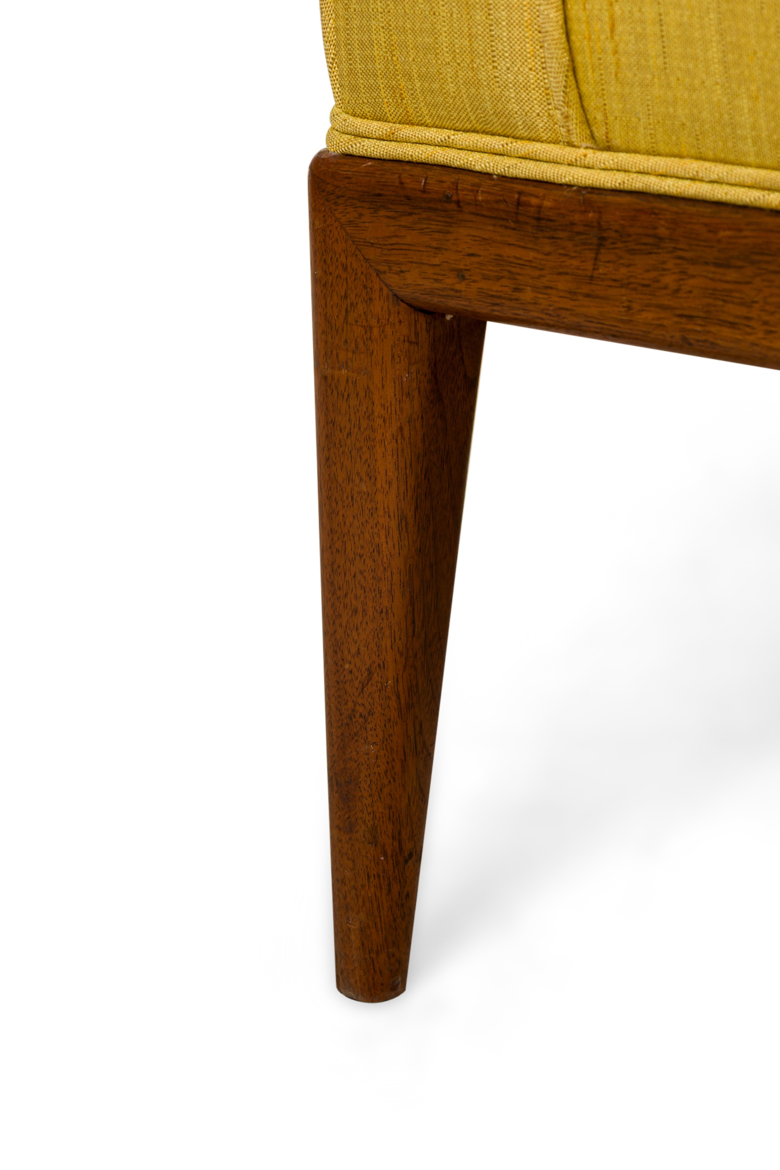 American Mid-Century square back yellow fabric upholstered a\rmchairs with piping on the edges with a seat cushion, ending on tapered and splayed wooden legs. (RETROWOOD FURNITURE) (5 side chairs 064288C; 2 sofas 064288A)(PRICED EACH)