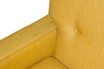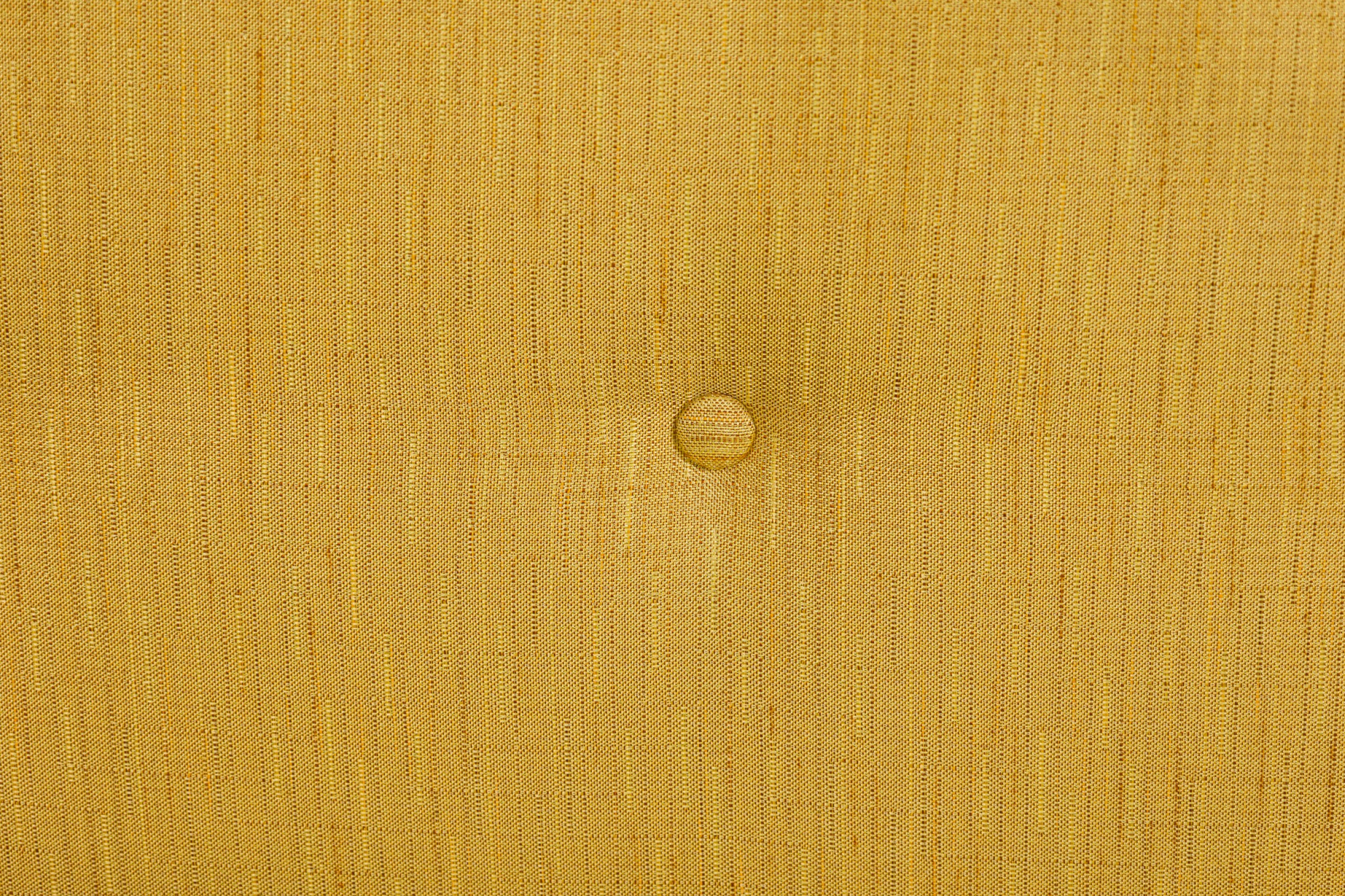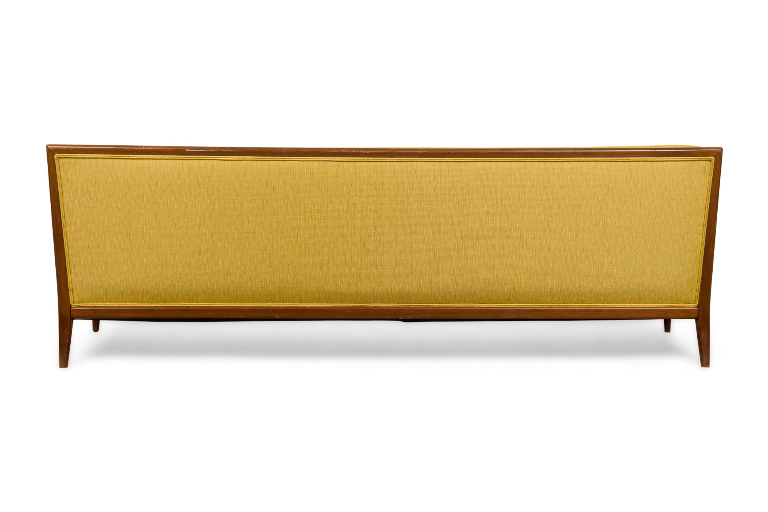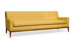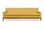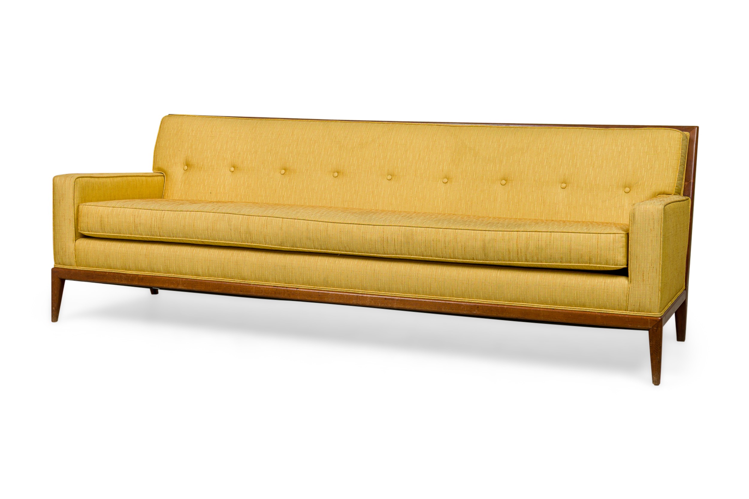 2 American Mid-Century yellow fabric upholstered sofas having button tufted backrests and piping on the edges with a large single seat cushion resting on tapered and splayed wooden legs. (PRICED EACH).