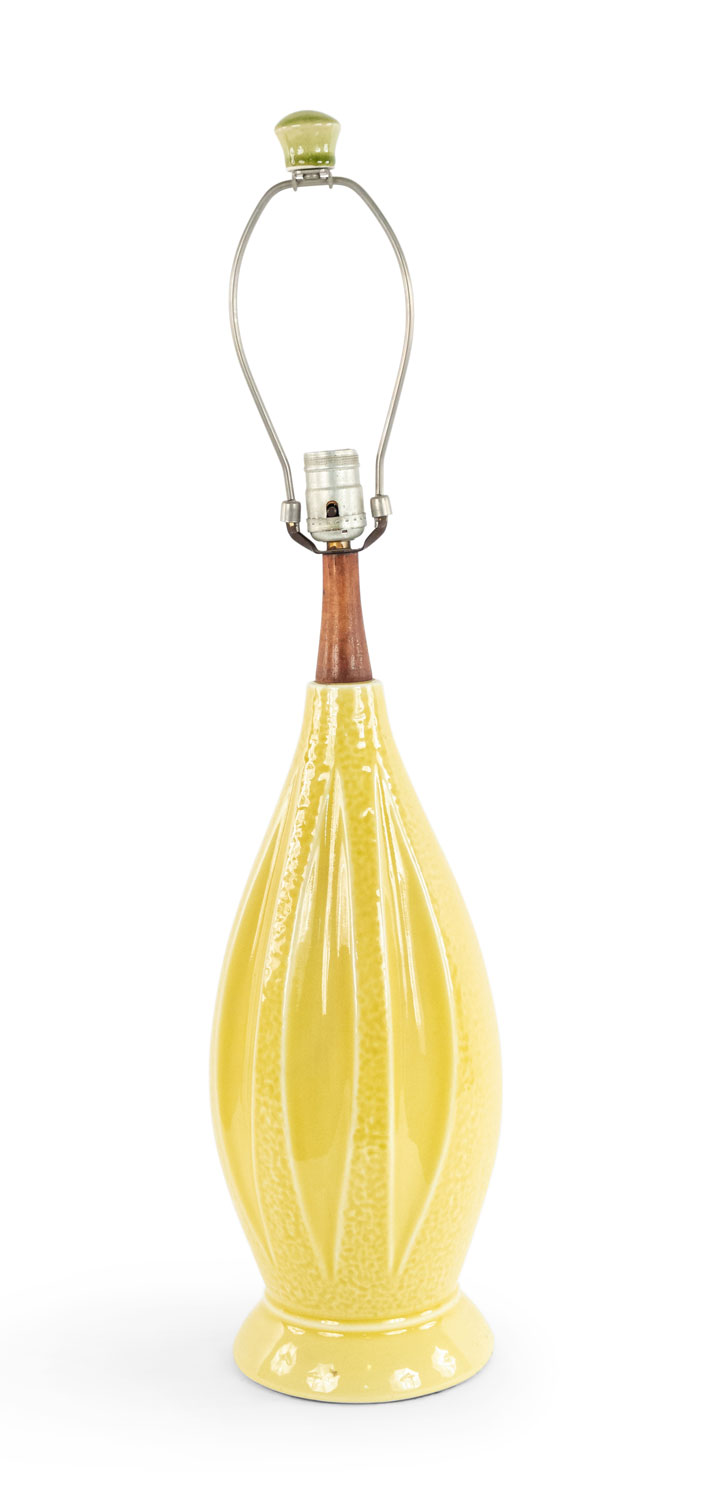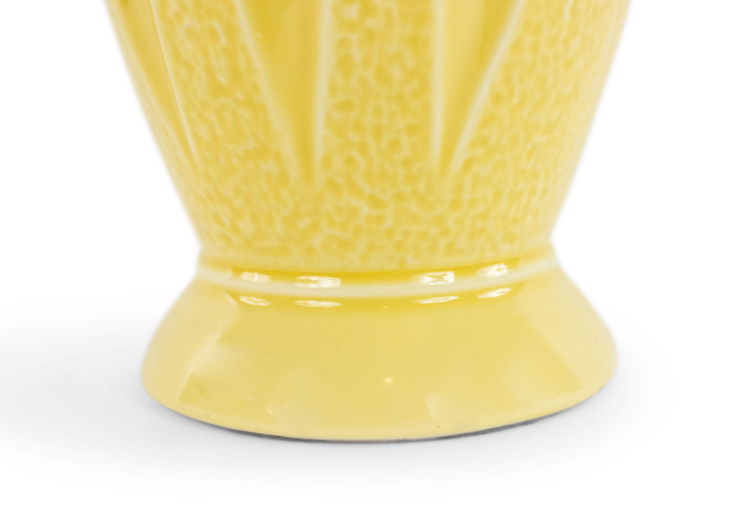 American Mid-Century yellow porcelain table lamp with tapered form having a shaped fluted design on a round base..