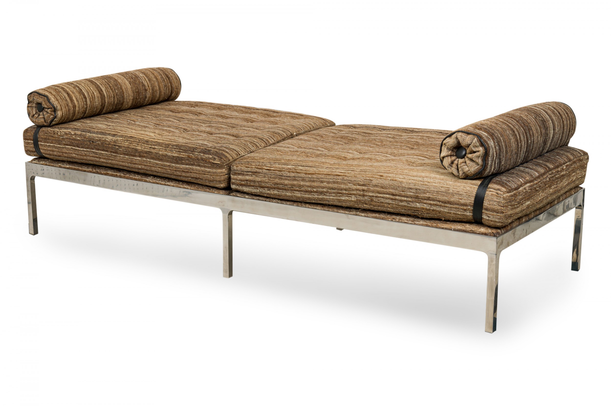 J. Wade American Modern console table for Brueton (1985) with a rectangular chrome top resting on a cantilevered travertine base. (By J. Wade)