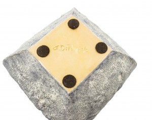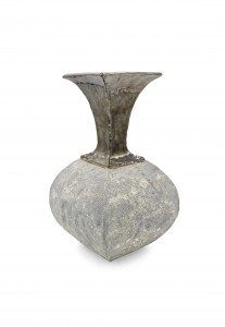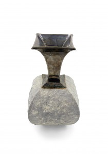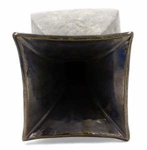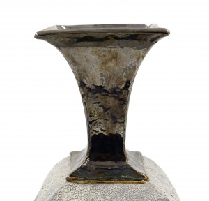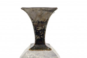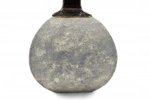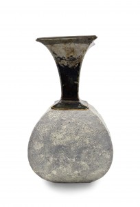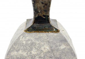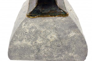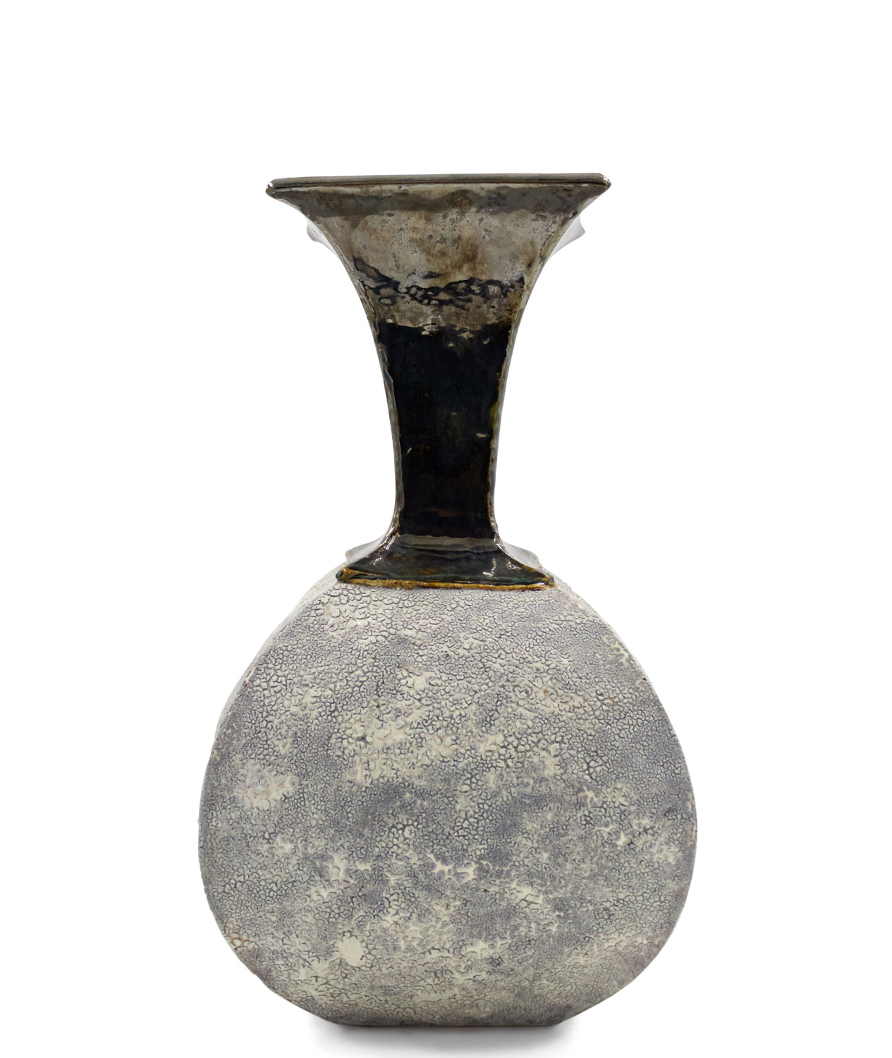 American Post-War Design grey and white textured bulbous square base vase with a glazed tapered and flared neck (signed: GARY DIPASQUALE)