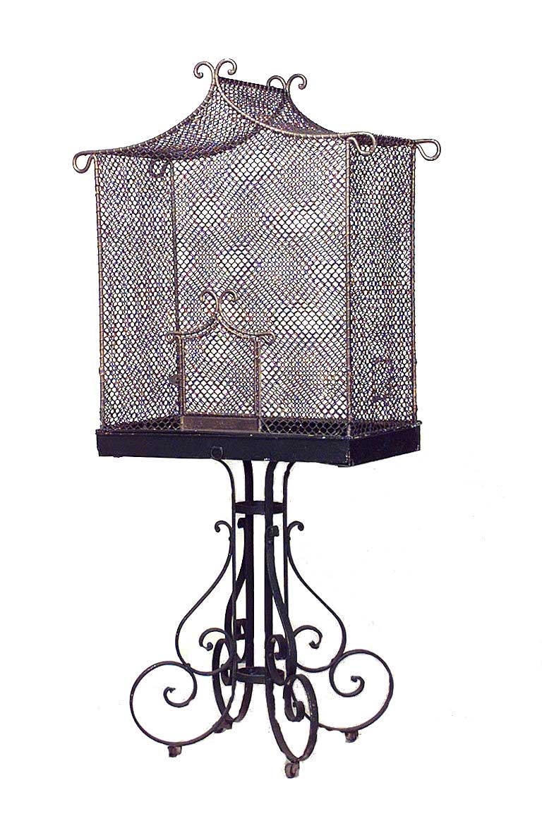 American Victorian green painted bird cage with pagoda top and rectangular iron scroll base..