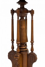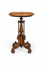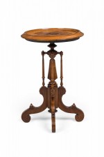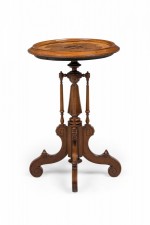 Style: American Materials & Techniques: Carved, inlaid, turned, wood Category: Tables Condition: Slight wear to finish on top from age, top slightly slanted. Good; Wear consistent with age and use