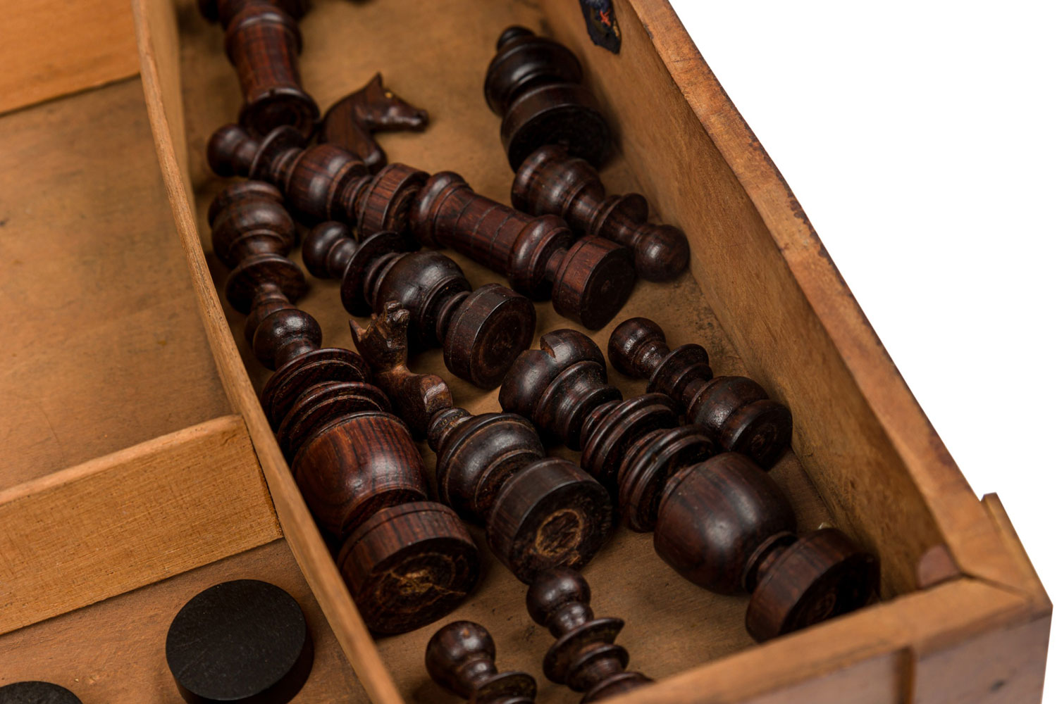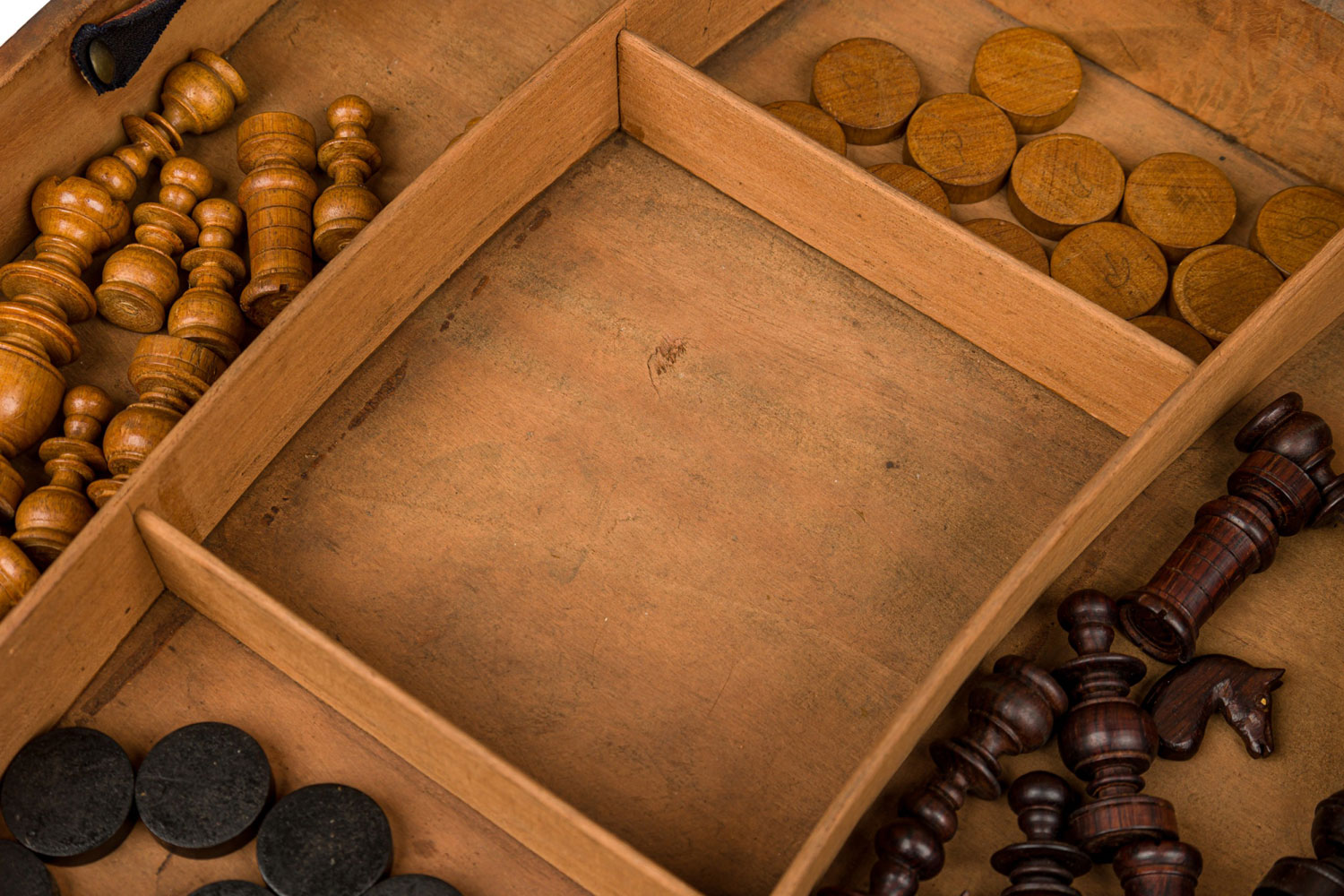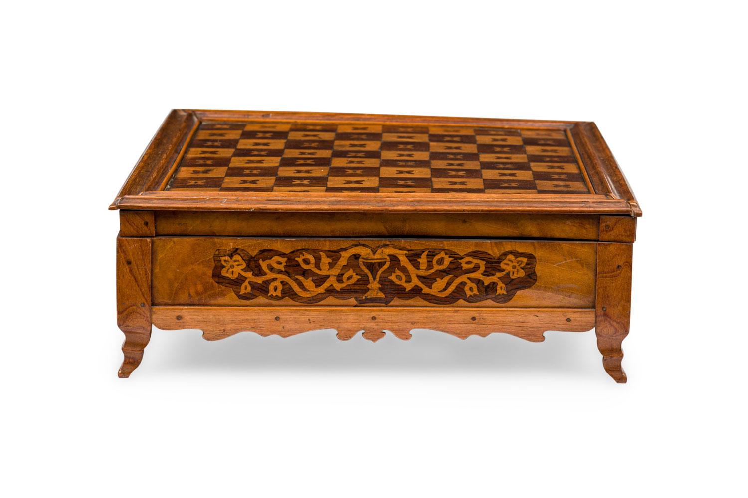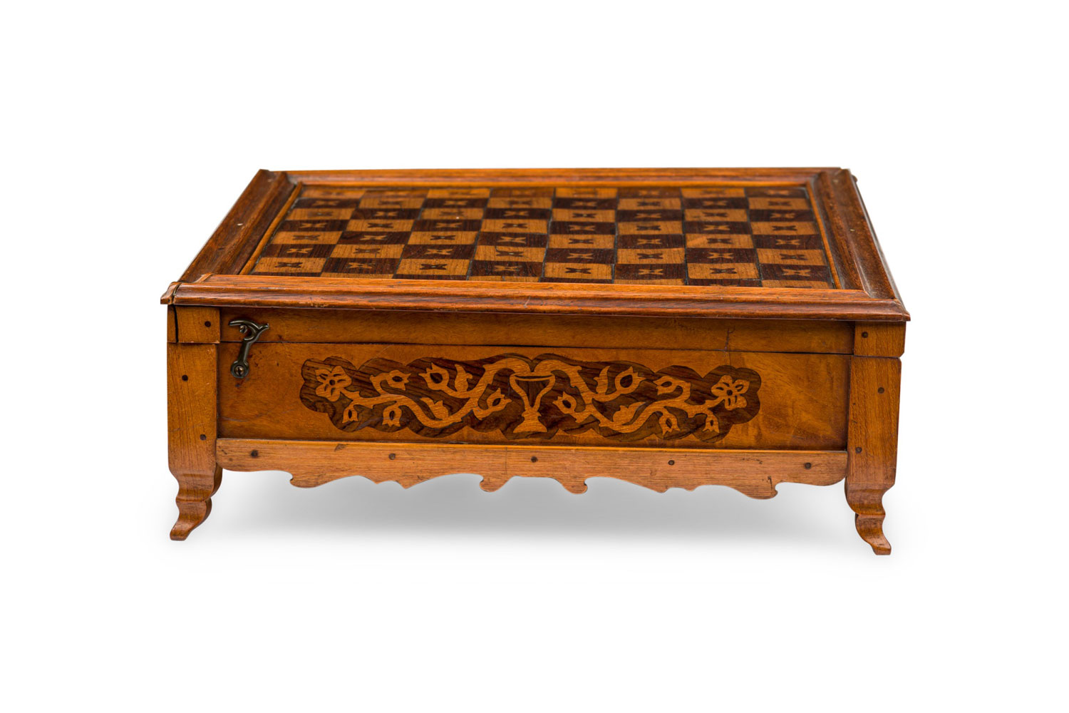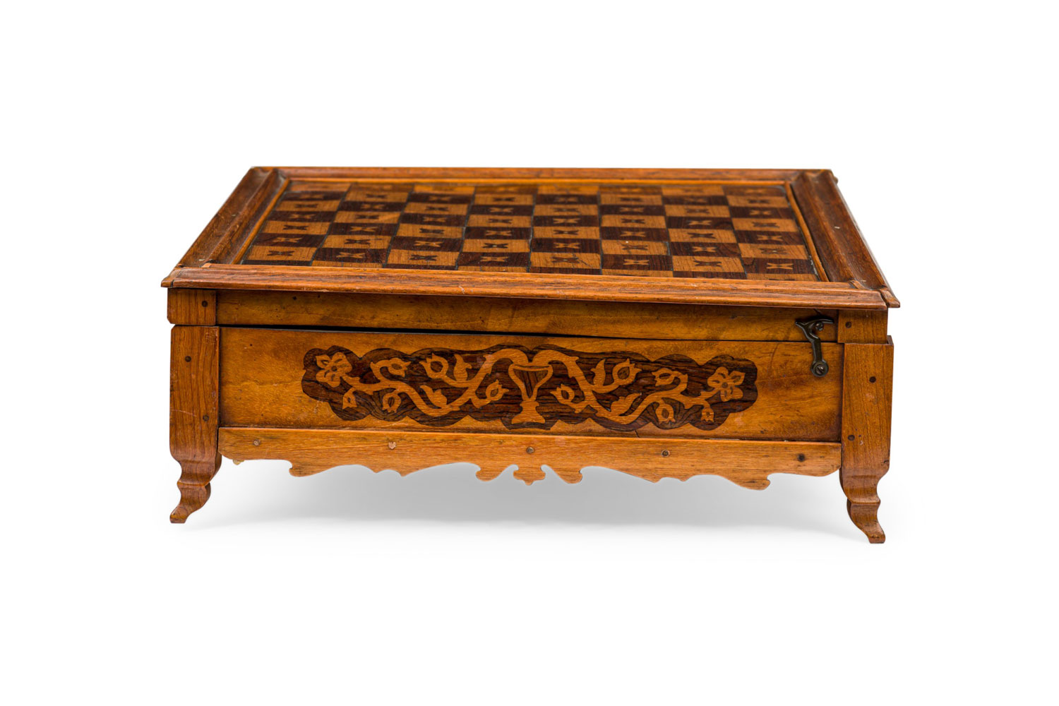 Early-20th Century (1917) wood hinged game box including 24 checkers and 32 chess pieces, hand carved, featuring game board parquetry on the cover, framed by a molded border with evenly spaced inlaid mother-of-pearl dots (also embedded along the bottom apron), an asymmetrically curved 5-compartment interior, scroll & foliate parquetry surrounding the sides, resting on 4 splayed legs..