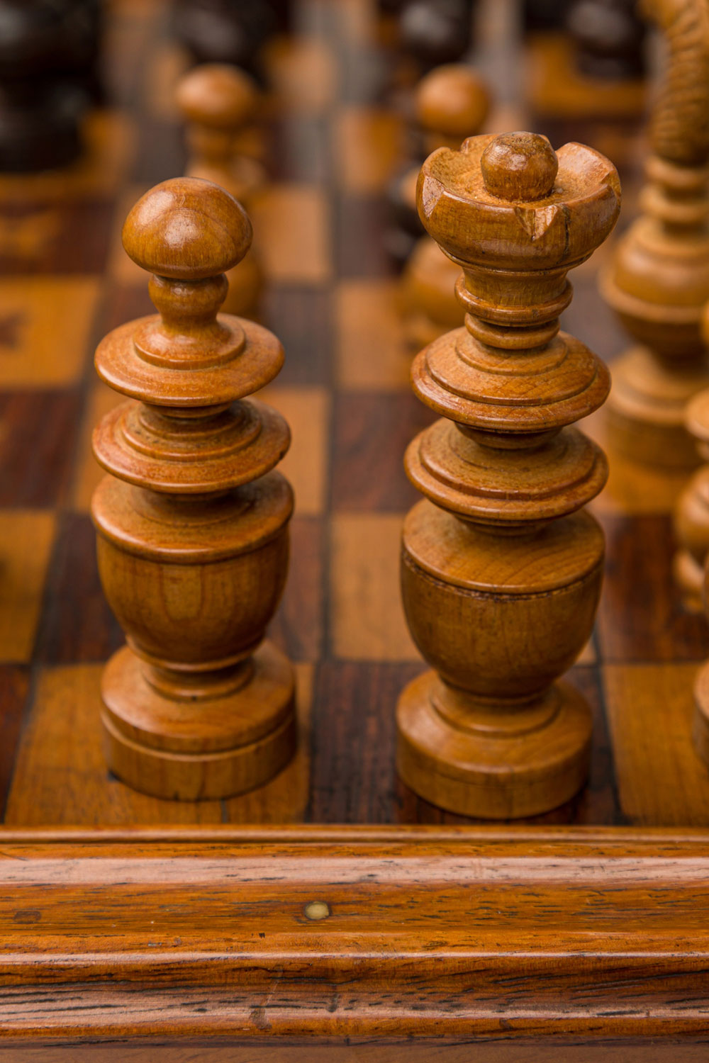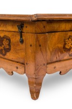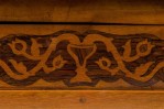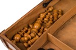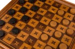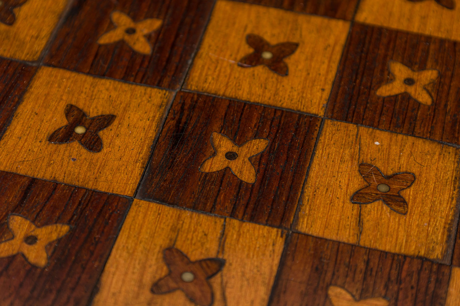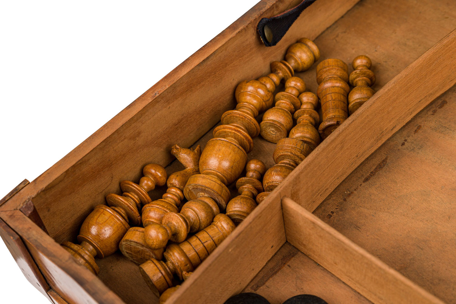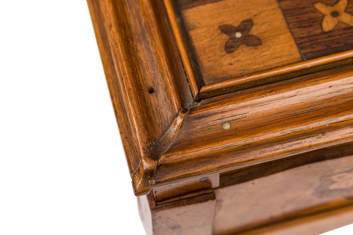 Early-20th Century (1917) wood hinged game box including 24 checkers and 32 chess pieces, hand carved, featuring game board parquetry on the cover, framed by a molded border with evenly spaced inlaid mother-of-pearl dots (also embedded along the bottom apron), an asymmetrically curved 5-compartment interior, scroll & foliate parquetry surrounding the sides, resting on 4 splayed legs..