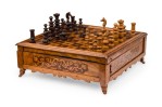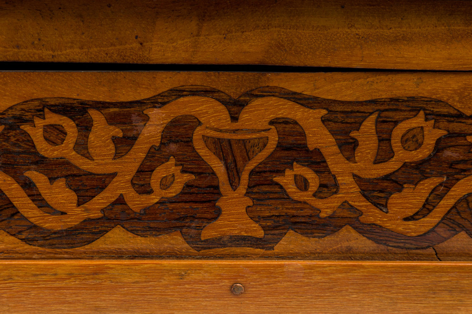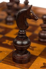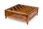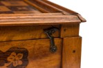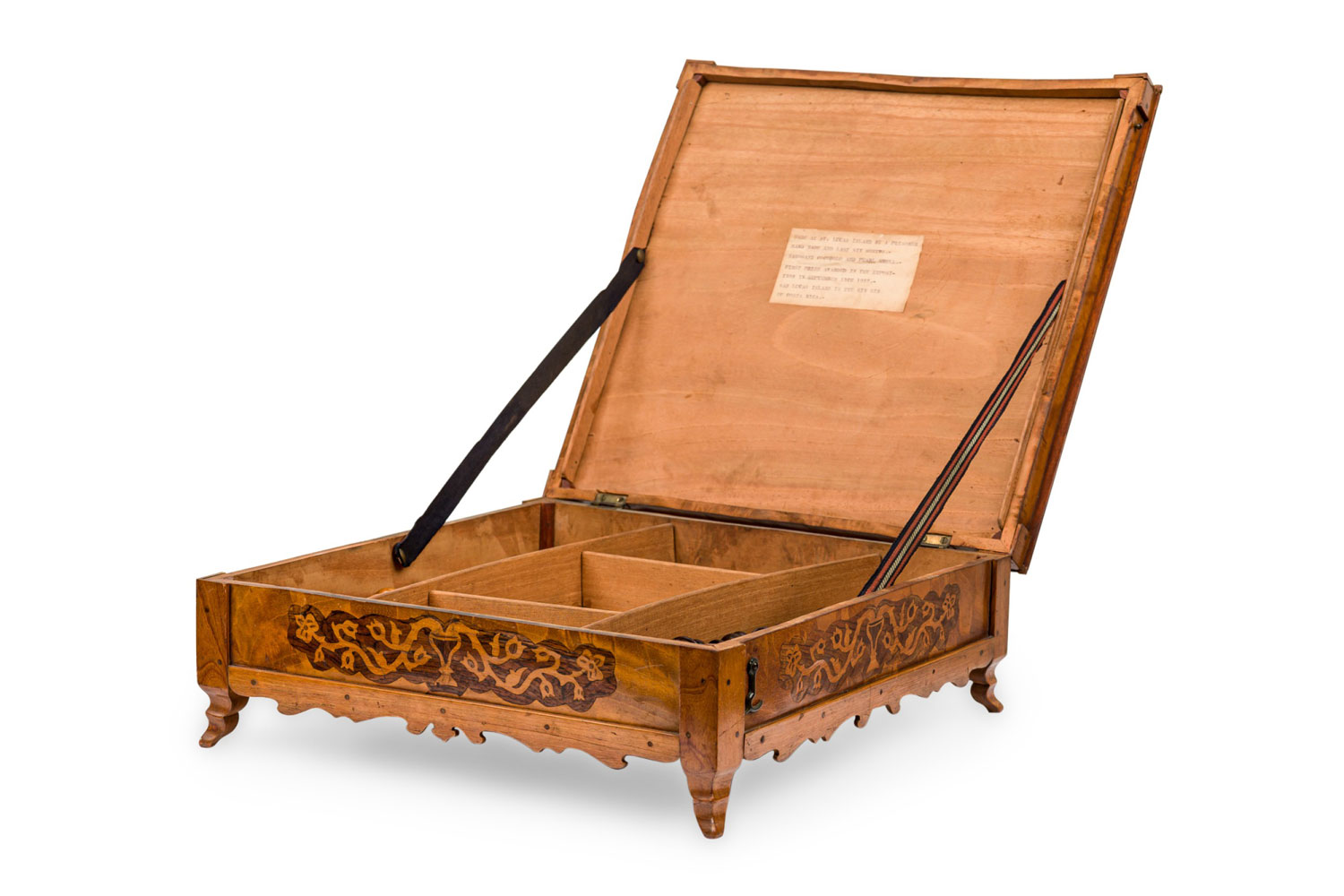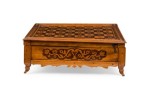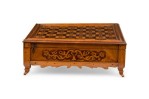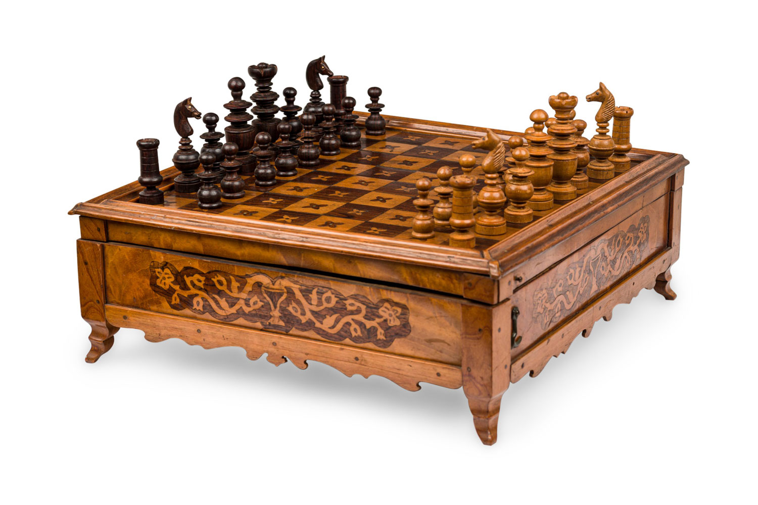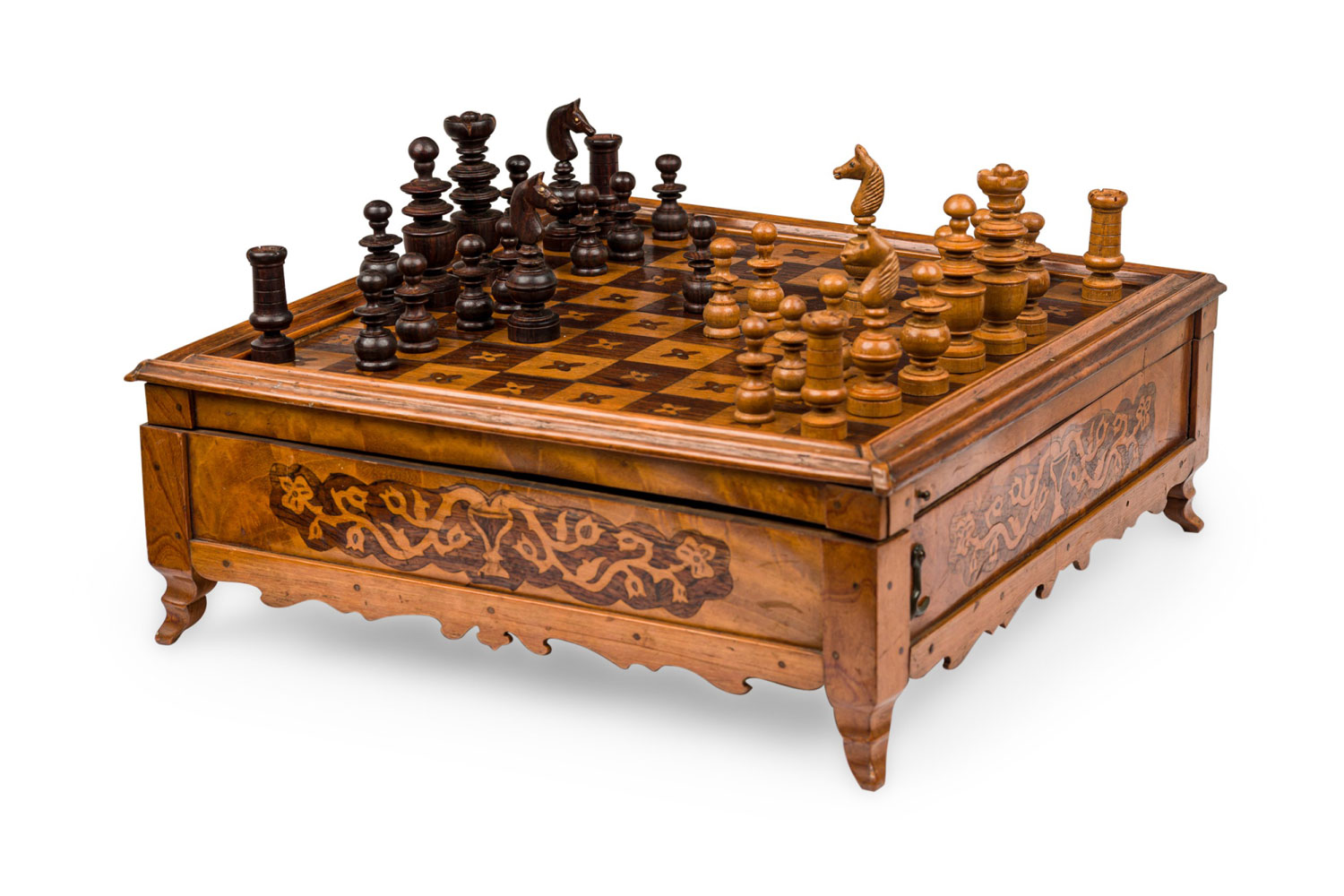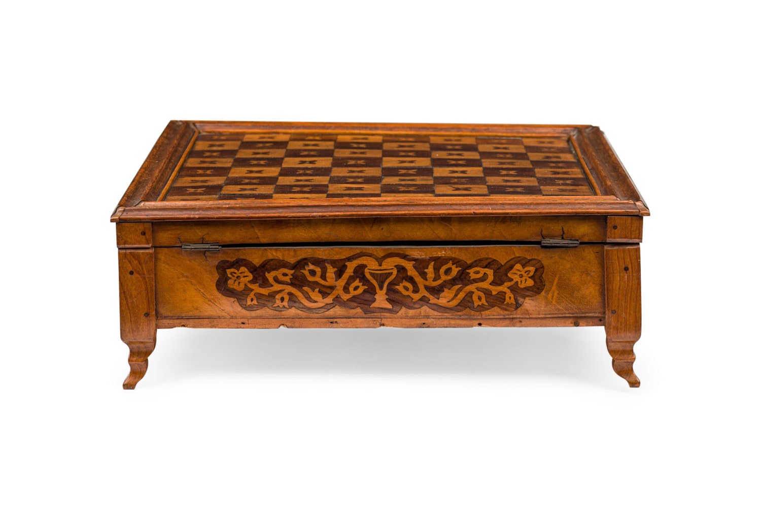 Early-20th Century (1917) wood hinged game box including 24 checkers and 32 chess pieces, hand carved, featuring game board parquetry on the cover, framed by a molded border with evenly spaced inlaid mother-of-pearl dots (also embedded along the bottom apron), an asymmetrically curved 5-compartment interior, scroll & foliate parquetry surrounding the sides, resting on 4 splayed legs.
