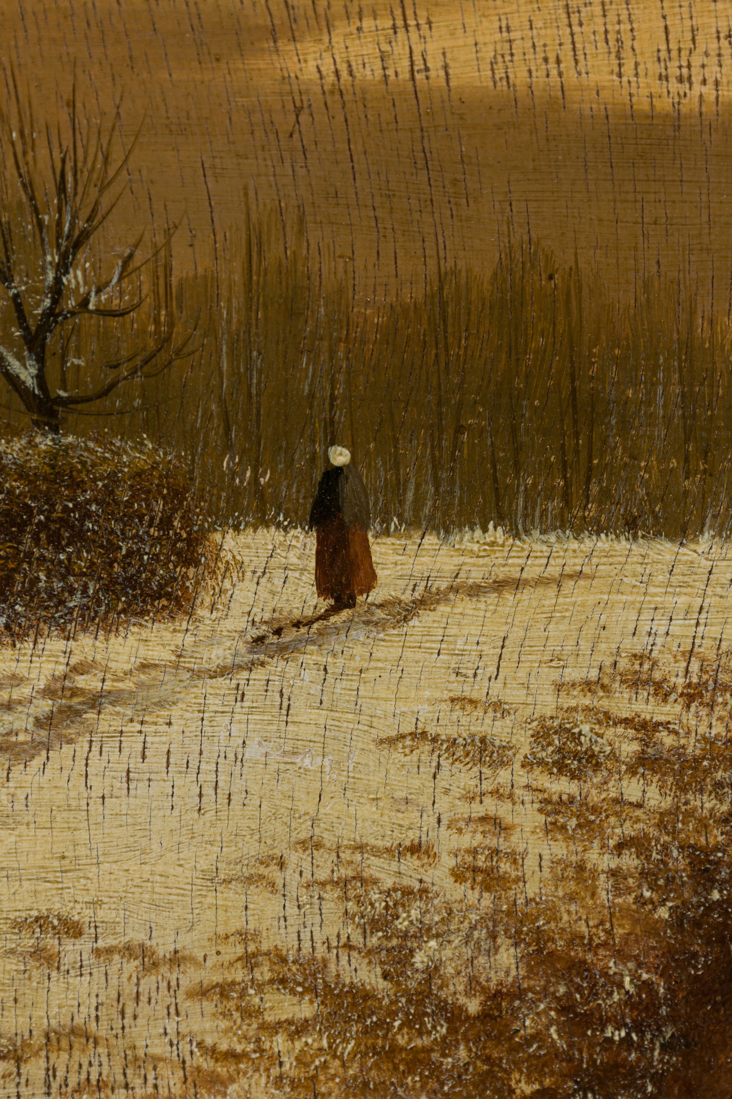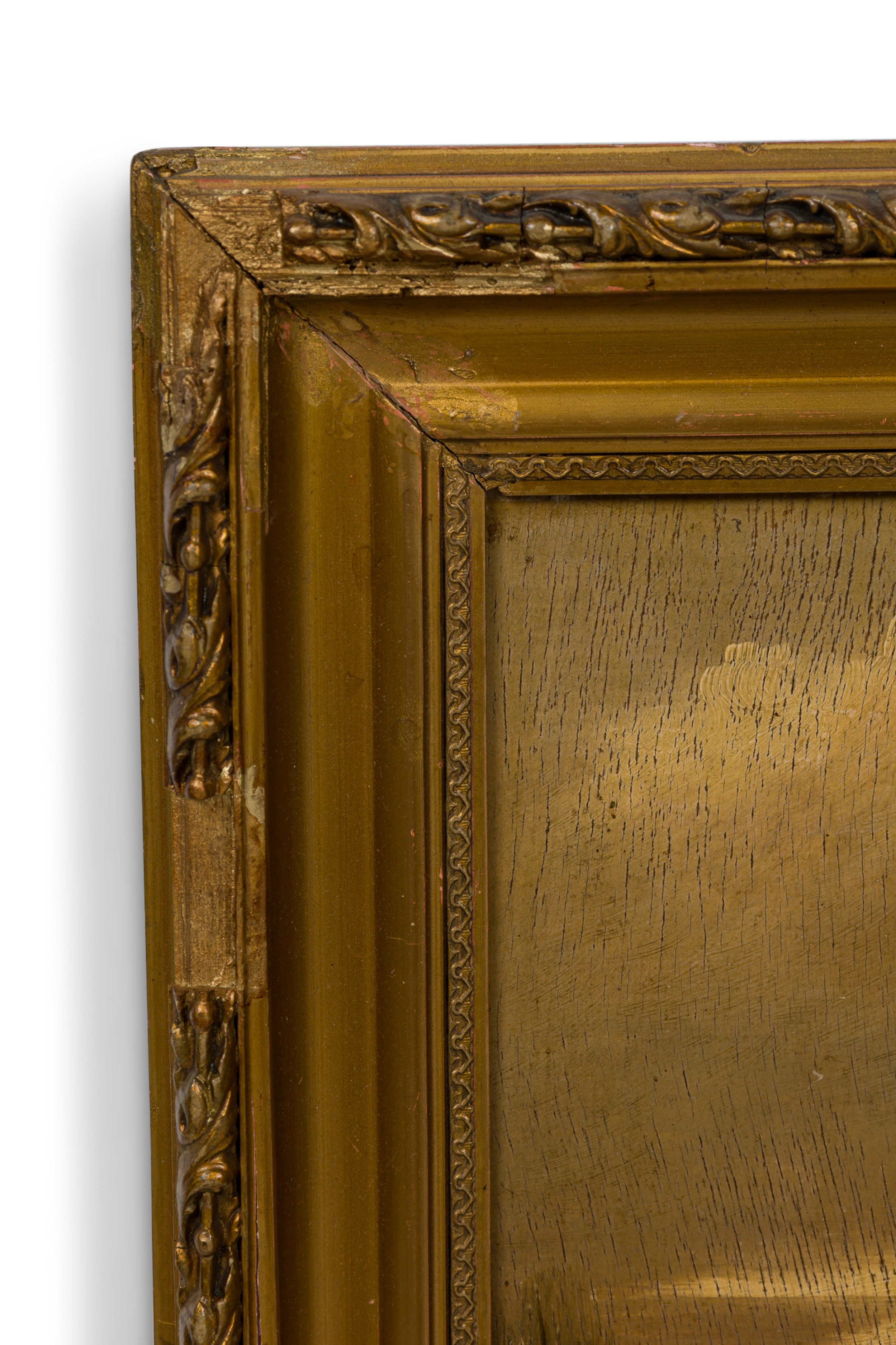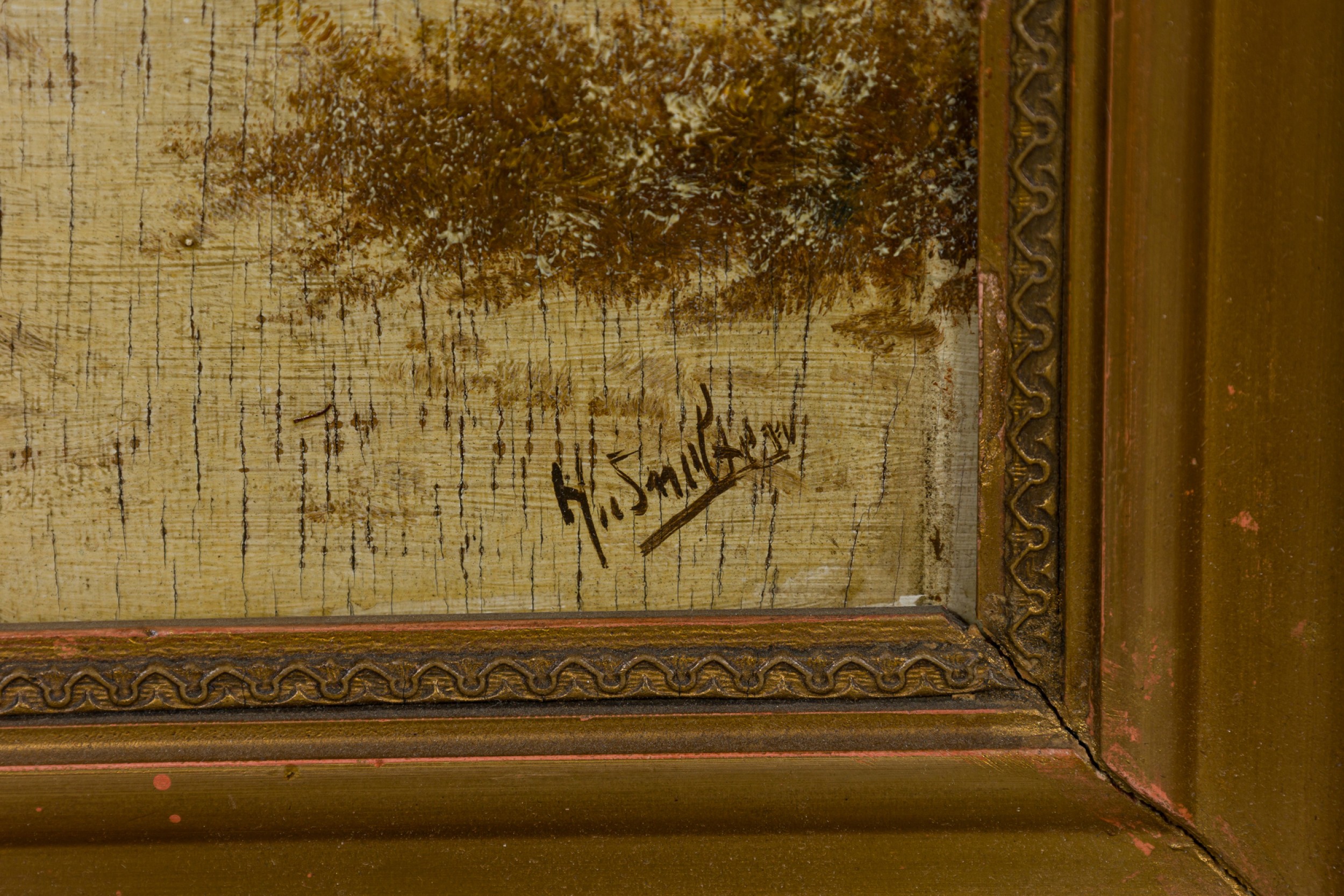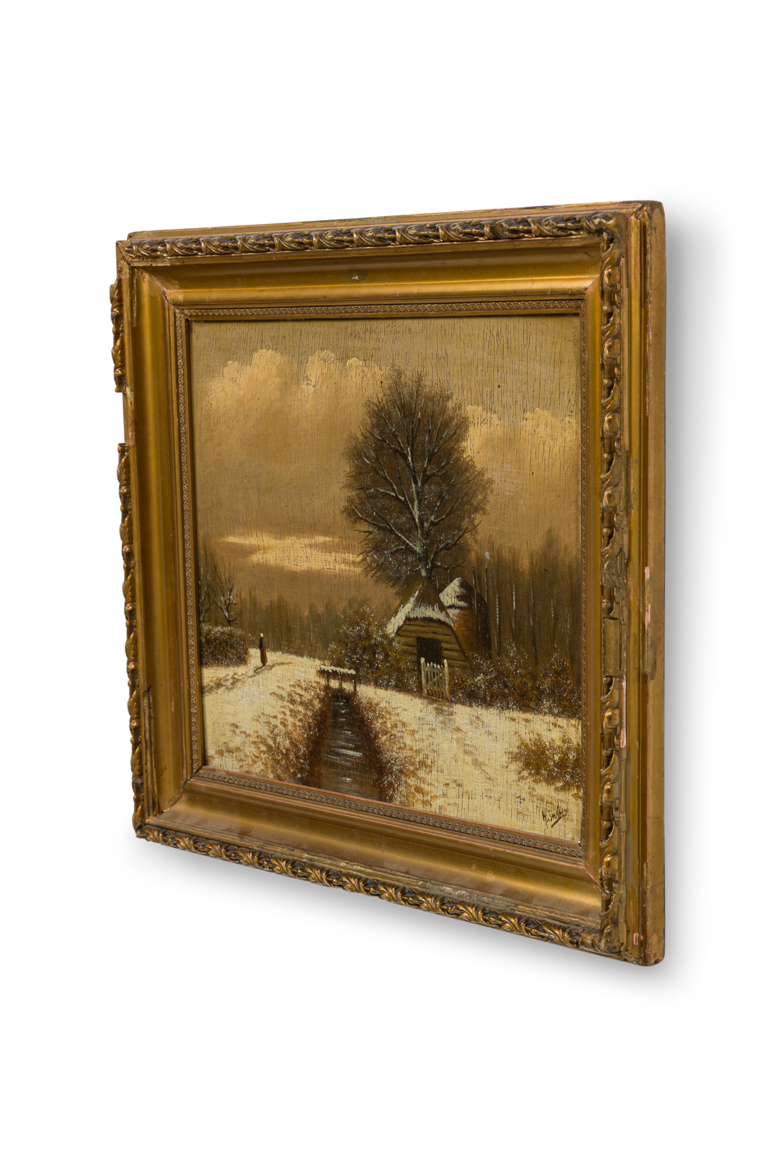 American Victorian style (20th Cent) old framed oil painting on board of landscape with stream and house with snow on ground..