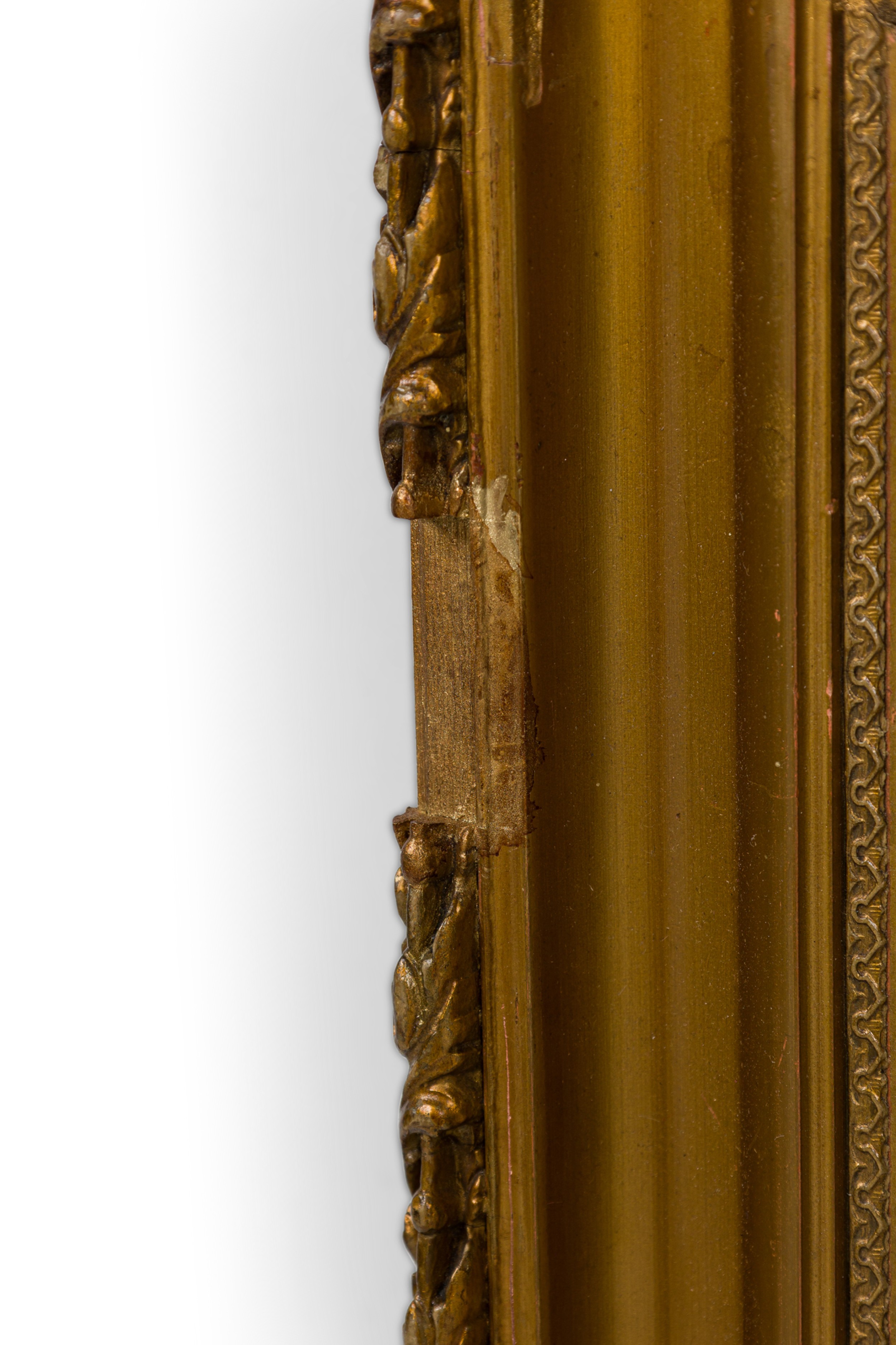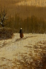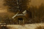 American Victorian style (20th Cent) old framed oil painting on board of landscape with stream and house with snow on ground.
