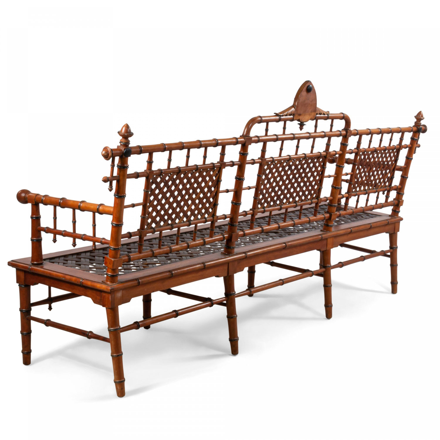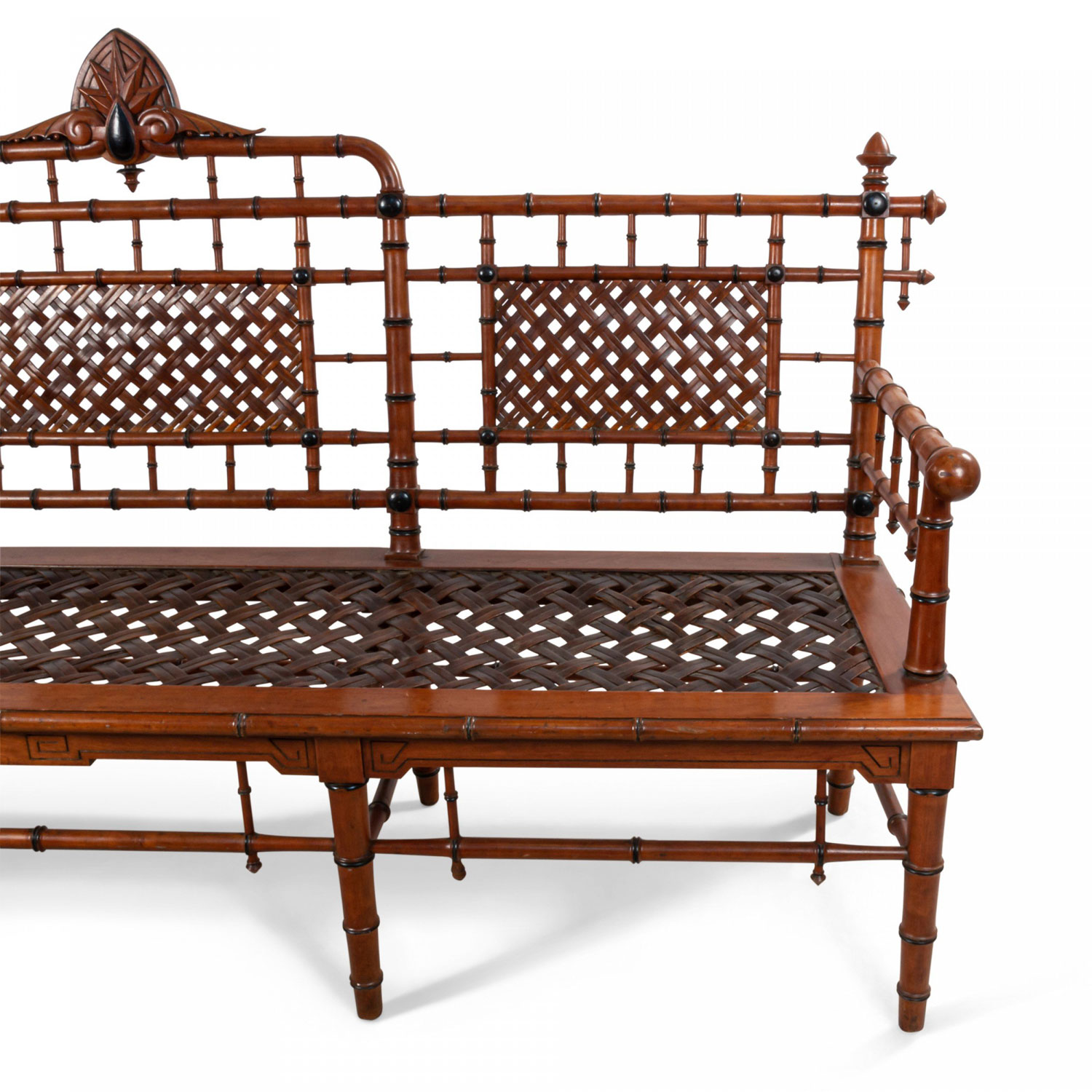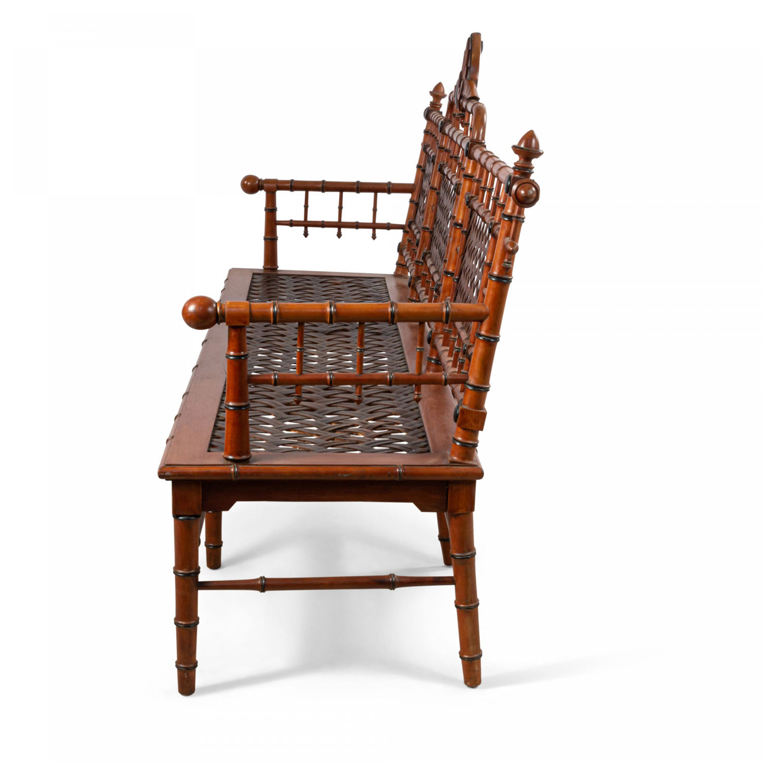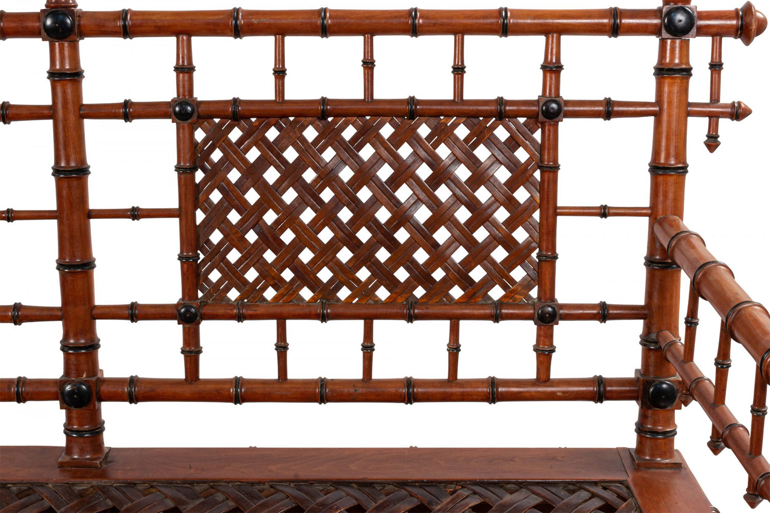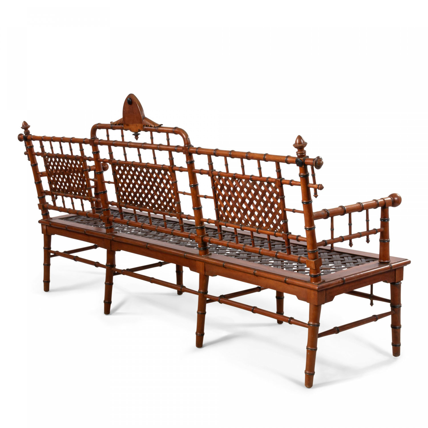 American Victorian faux bamboo mahogany settee with spindle trim and cross thatched seat with 3 inset panels in back. (att: Hunzinger)