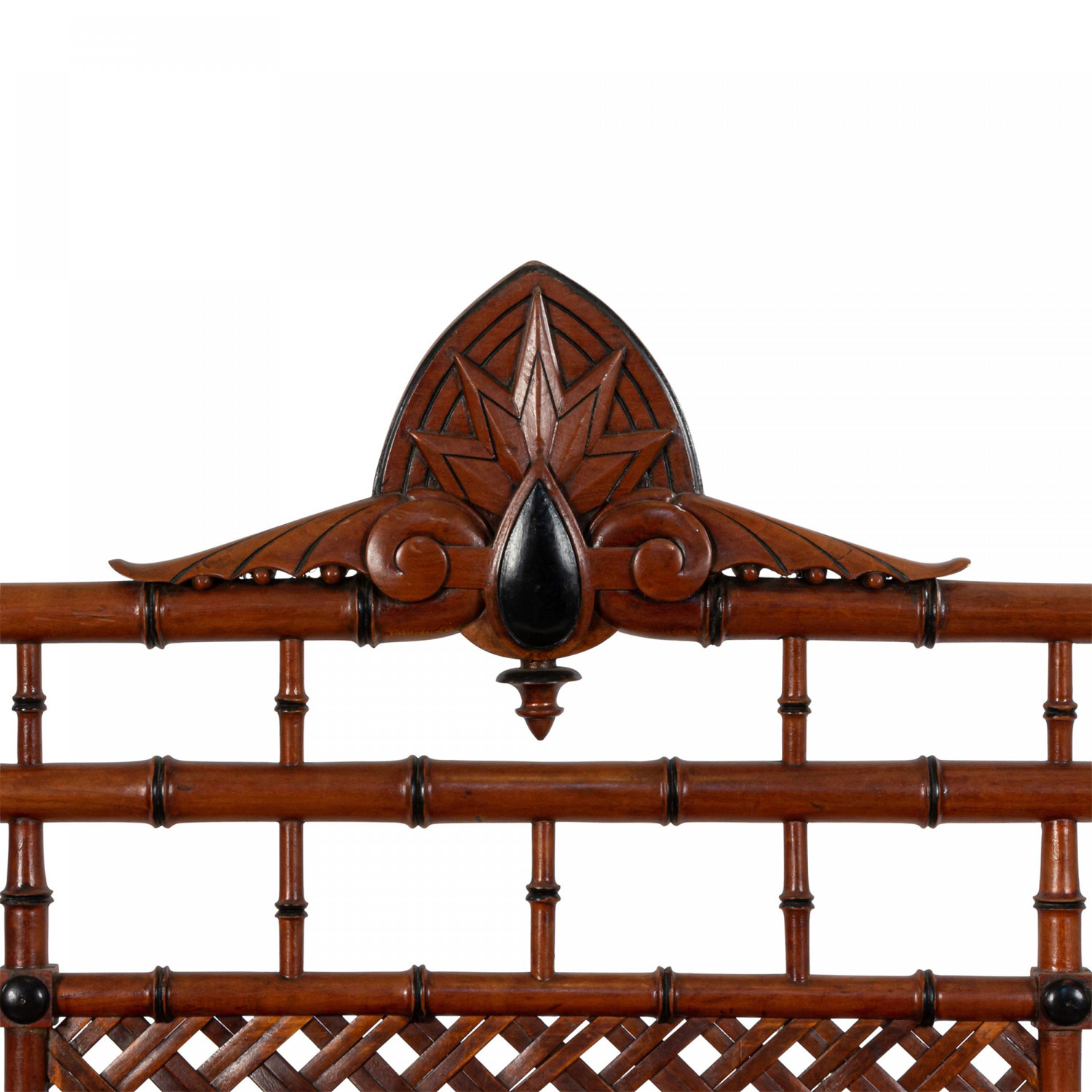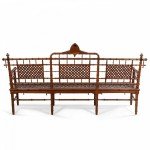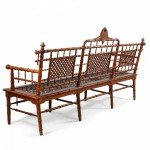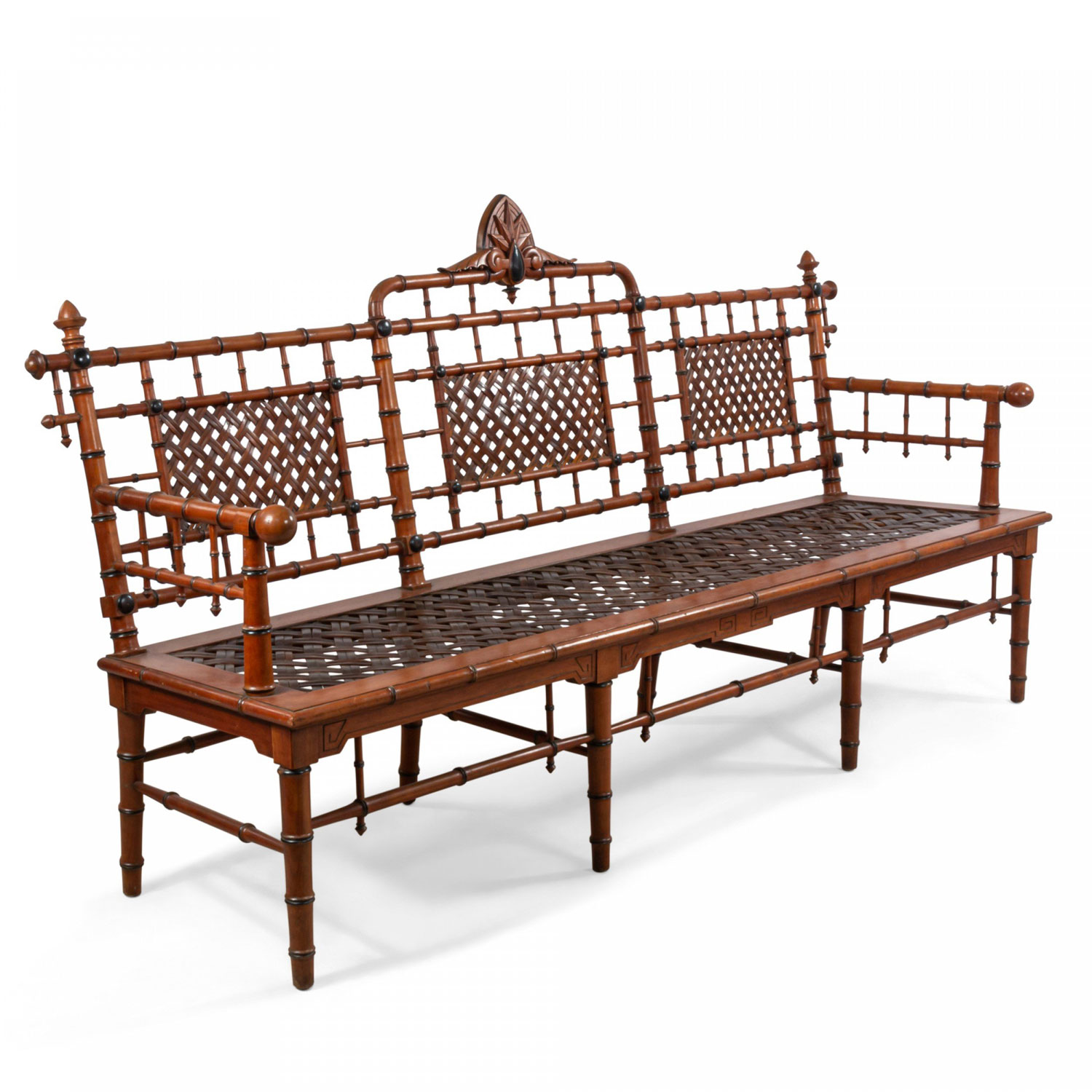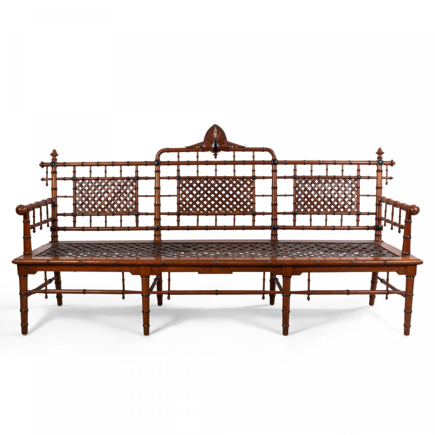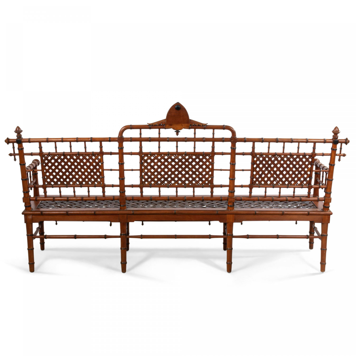 American Victorian faux bamboo mahogany settee with spindle trim and cross thatched seat with 3 inset panels in back. (att: Hunzinger)