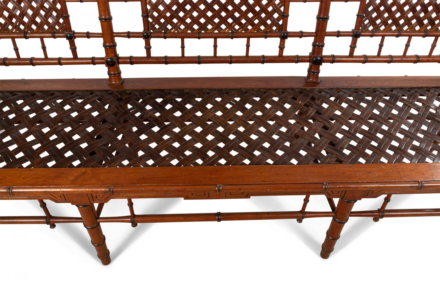 American Victorian faux bamboo mahogany settee with spindle trim and cross thatched seat with 3 inset panels in back. (att: Hunzinger).