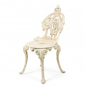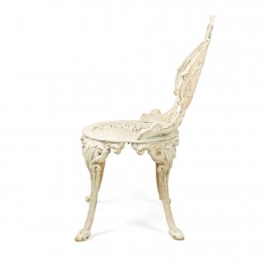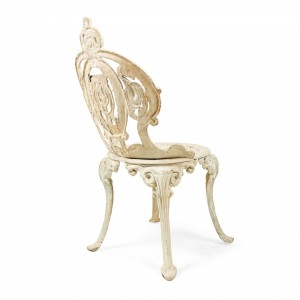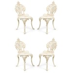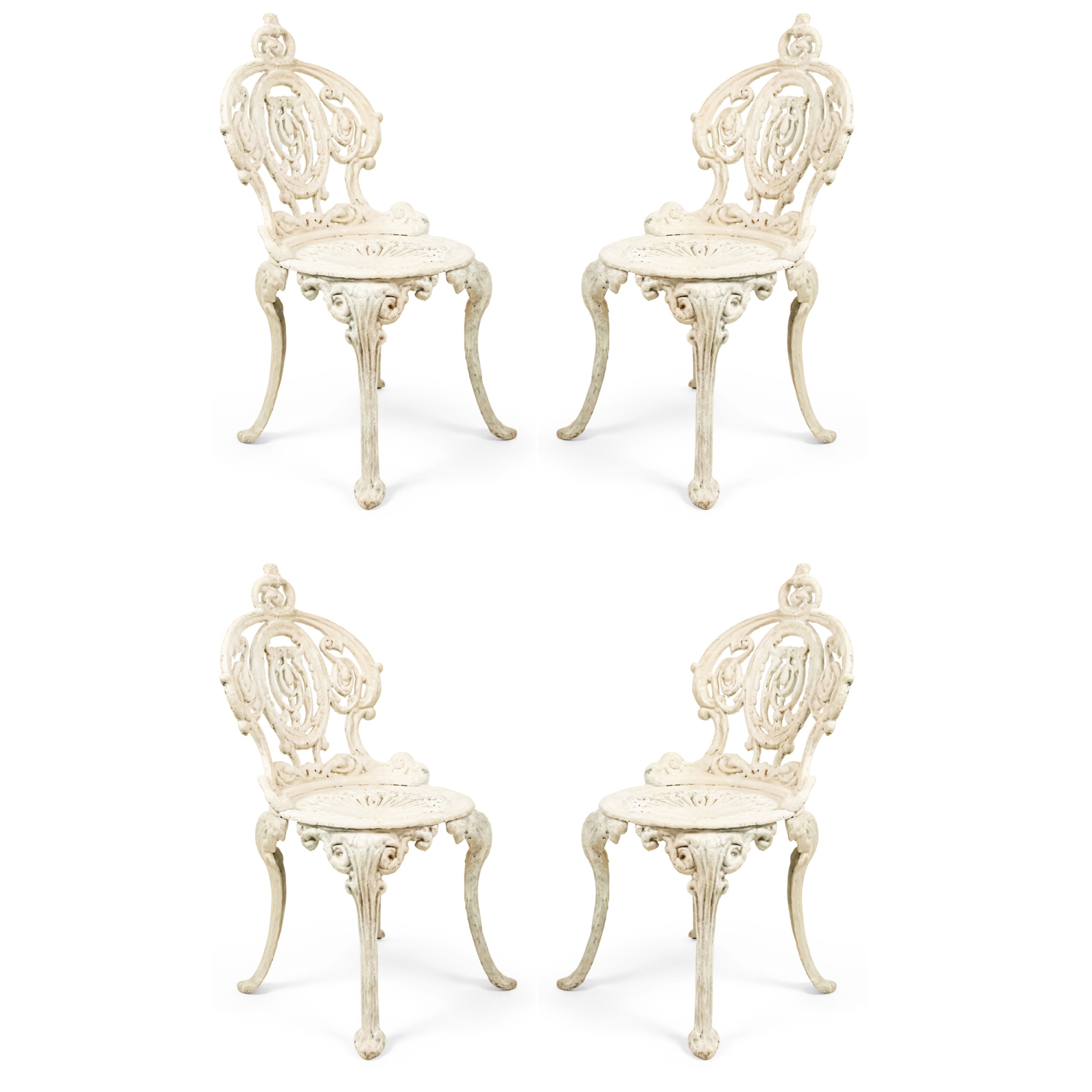 SET of 4 Outdoor American Victorian painted iron side chairs with oval scroll and filigree back and round seat