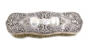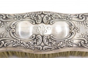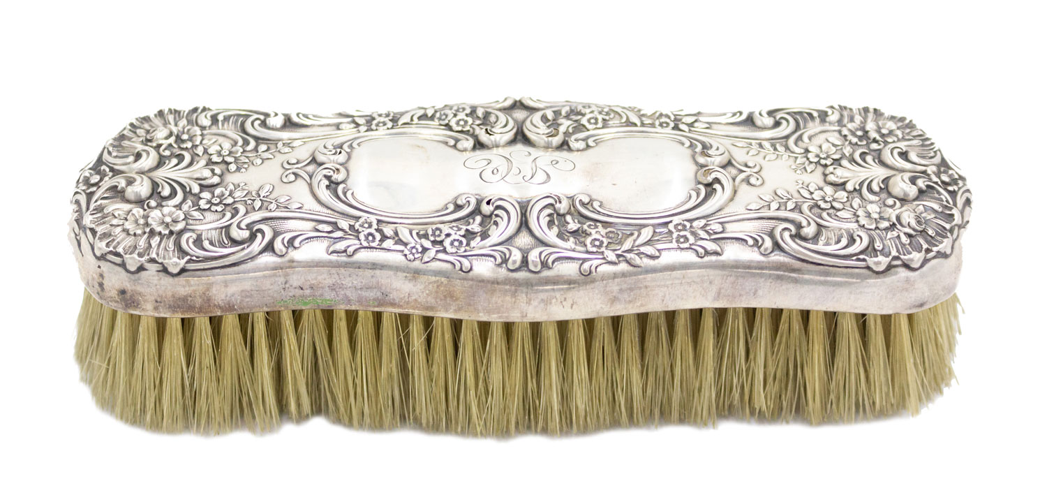 American Victorian silver plate brush with scroll design and initials.