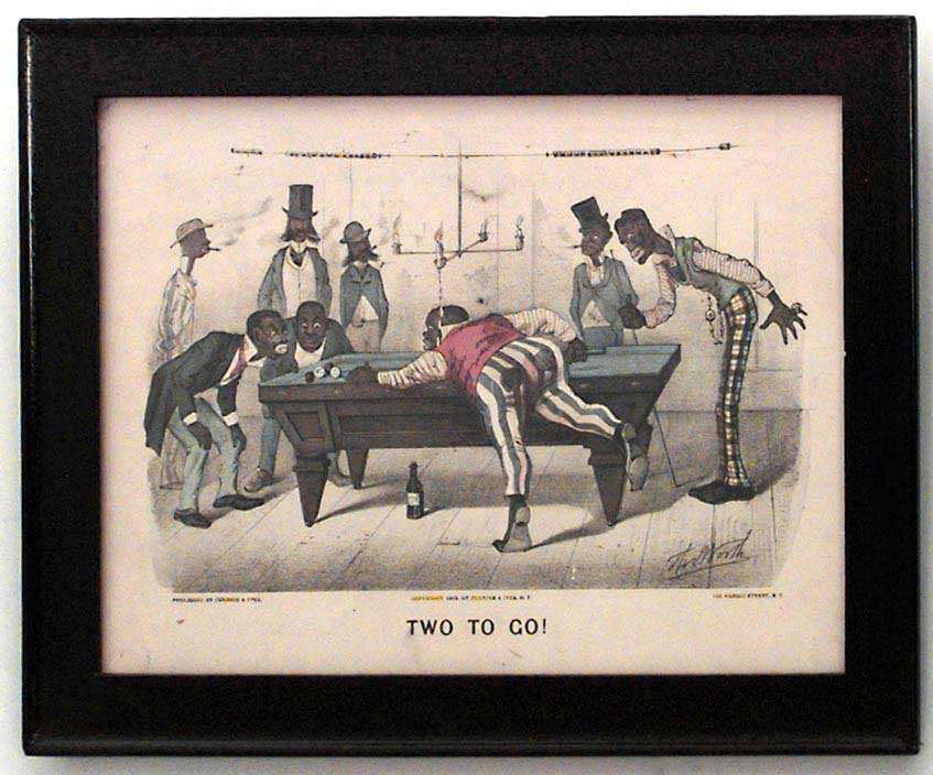 American Victorian (late 19th Century) ebonized-framed colored print of pool players titled "Two to Go" (Currier & Ives).