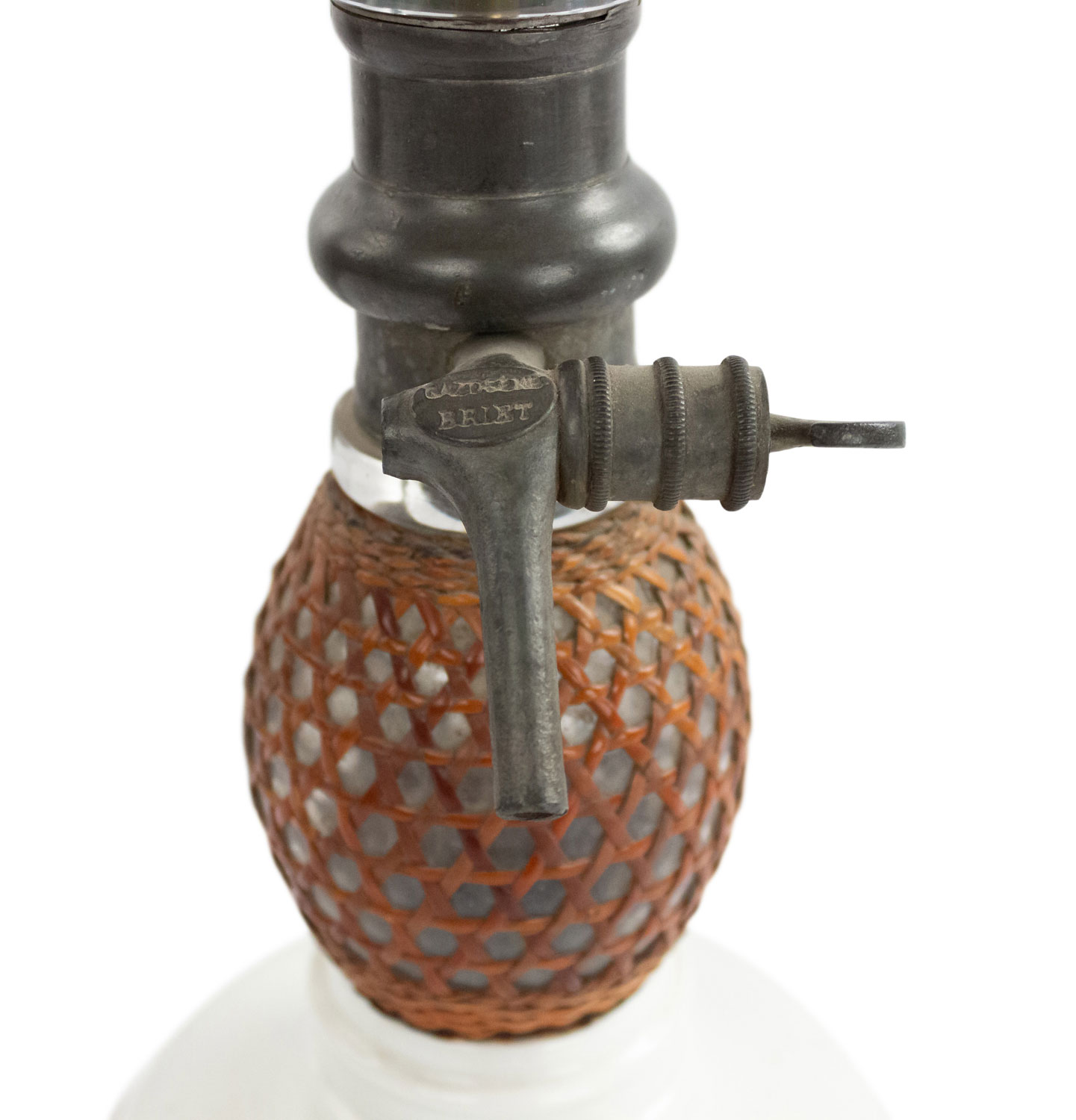American Victorian style table lamp of a woven wicker over 2 glass bottles with a faucet resting on a round white porcelain base.