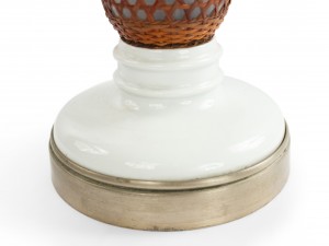 American Victorian style table lamp of a woven wicker over 2 glass bottles with a faucet resting on a round white porcelain base..