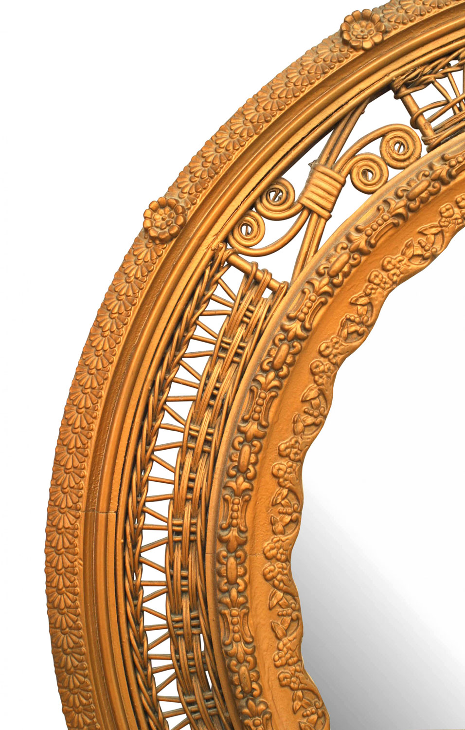 American Victorian round wicker wall mirror with filigree frame and "love me knot" motif border painted in original gold paint..