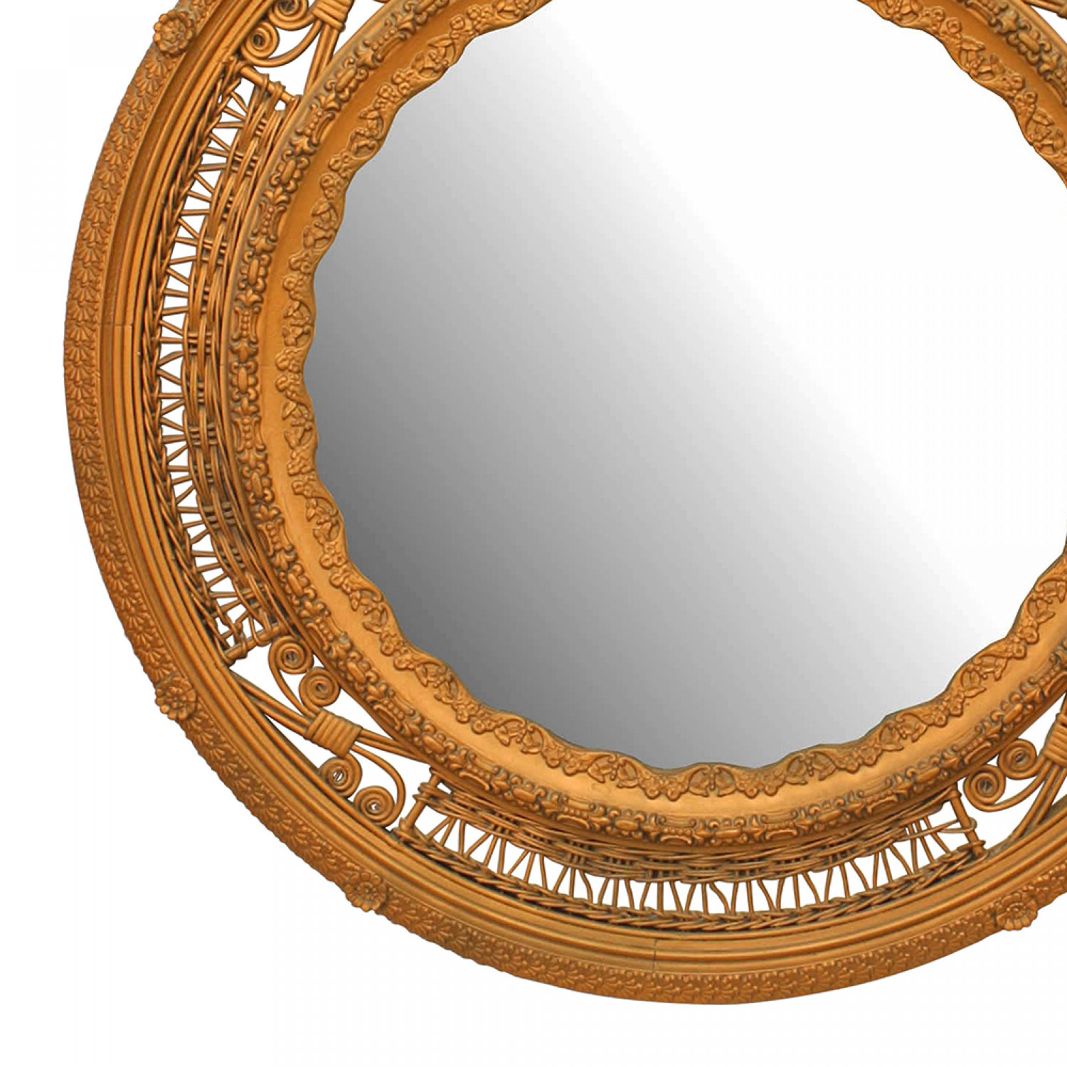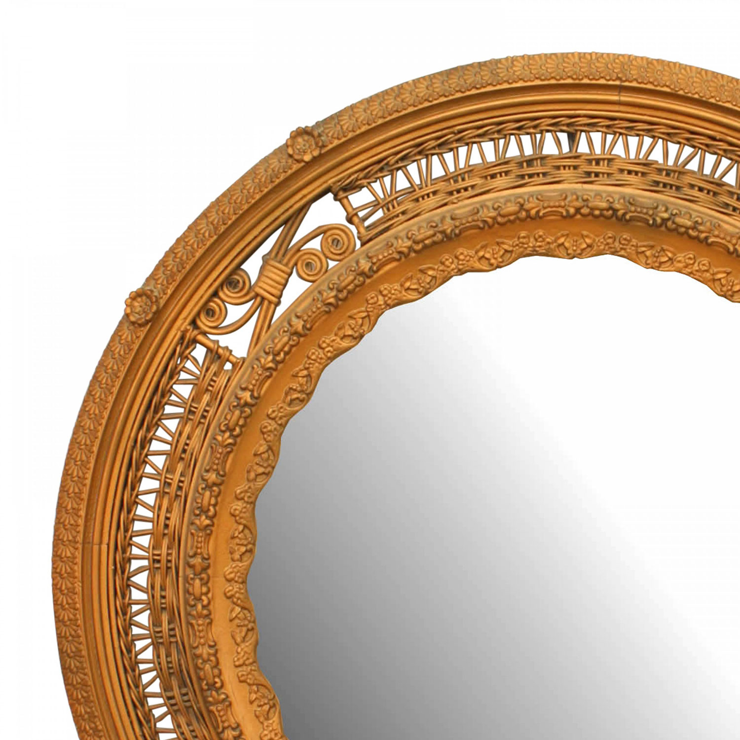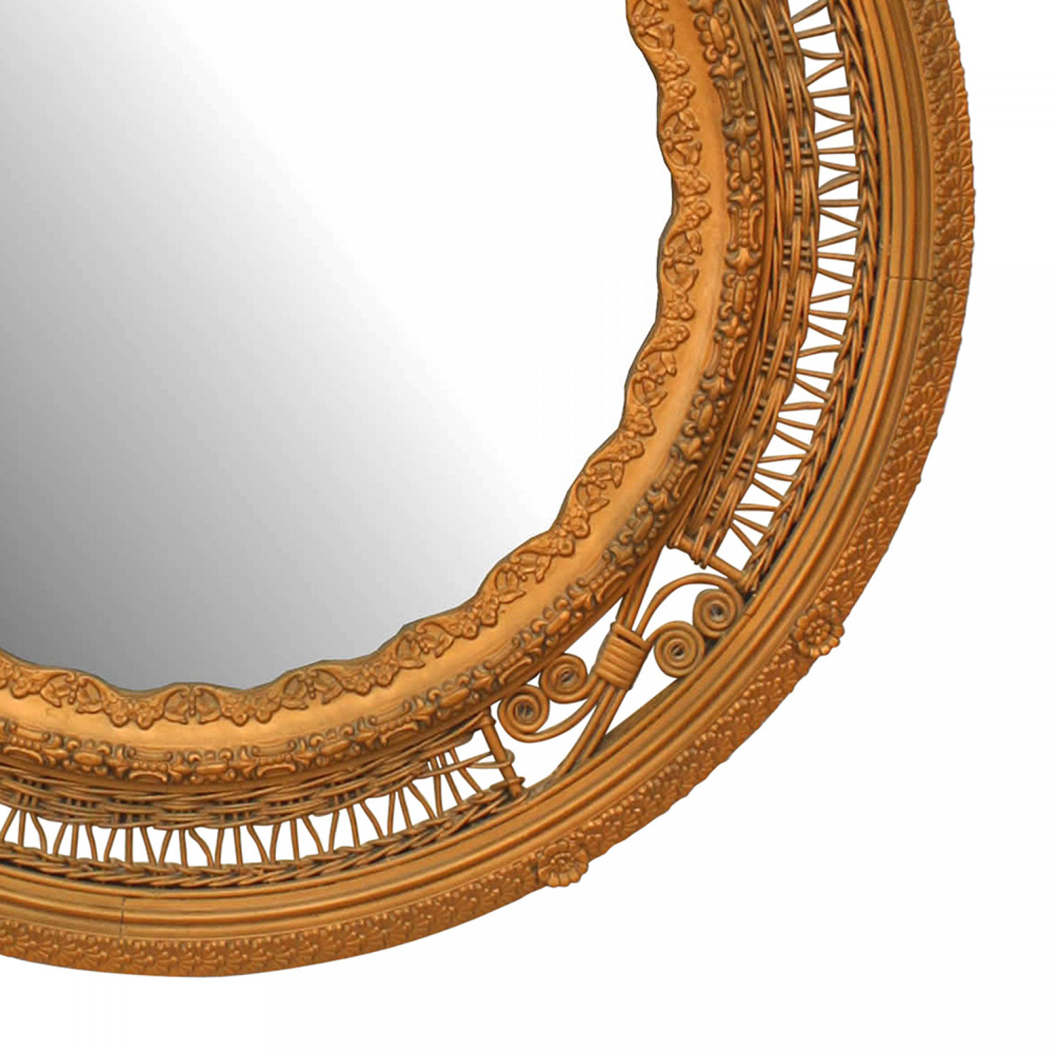 American Victorian round wicker wall mirror with filigree frame and "love me knot" motif border painted in original gold paint.