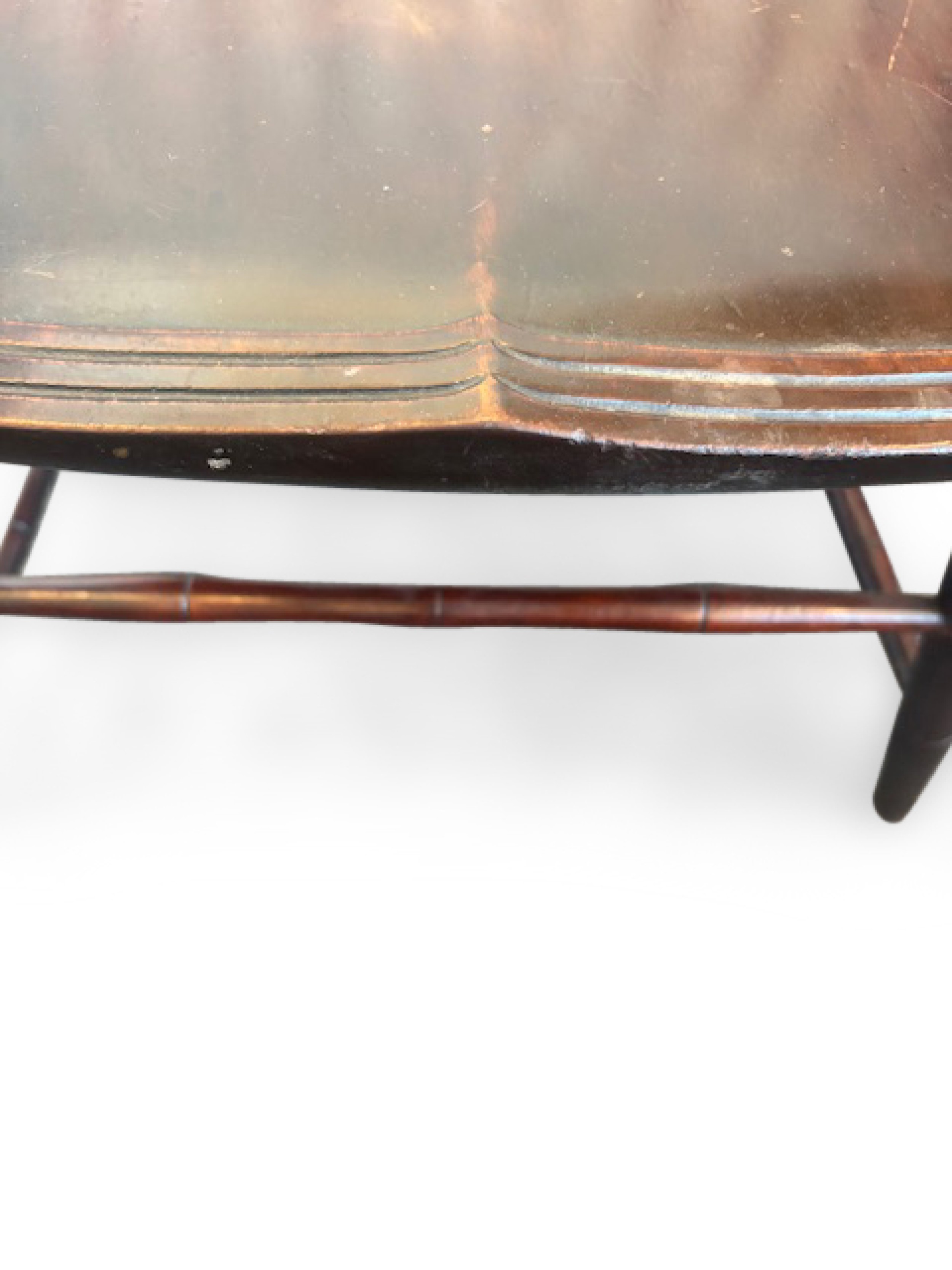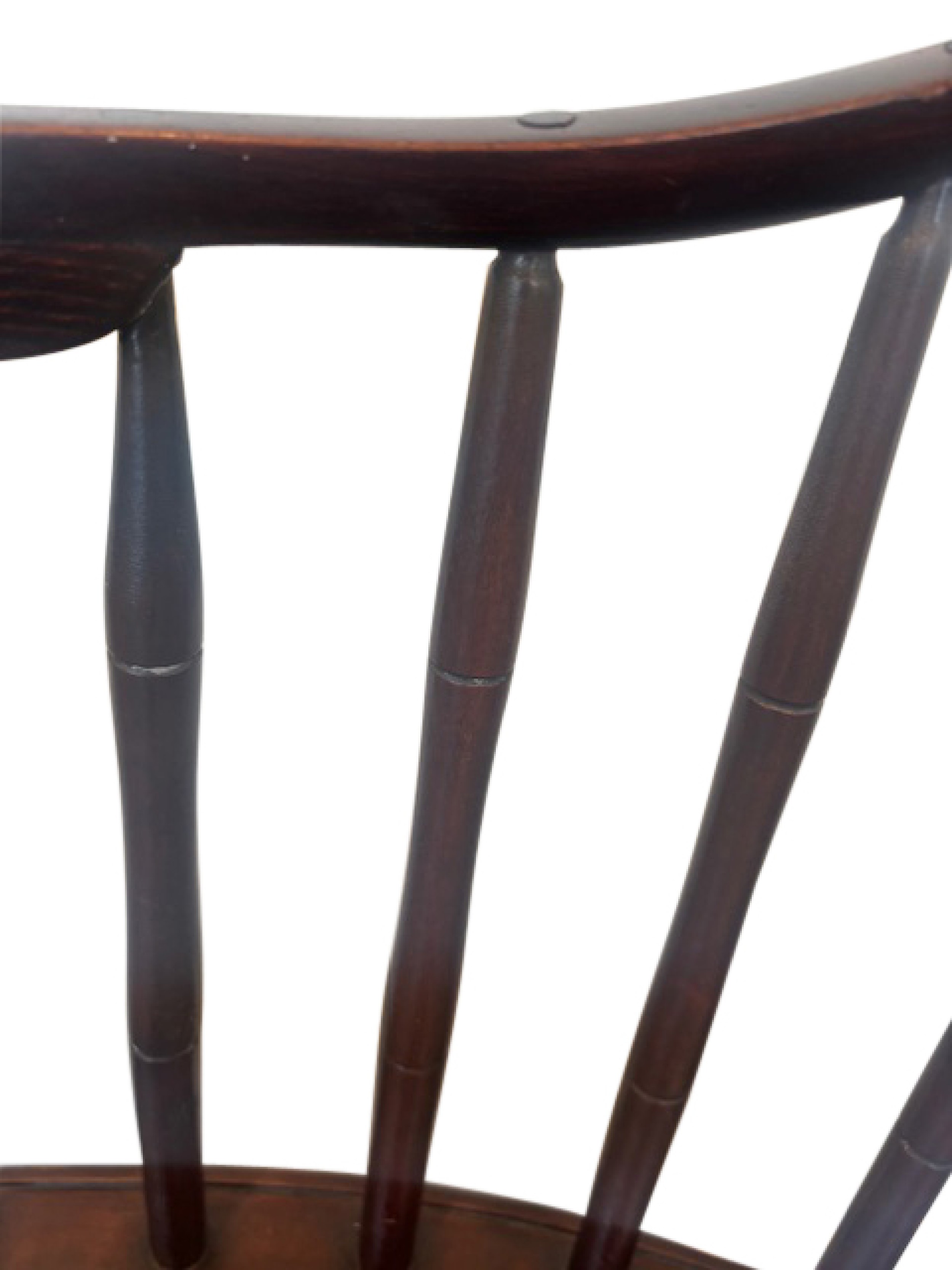 American Windsor style (19th Century) dark stained faux bamboo hoop shaped spindle back armchair ending with a scroll design front and having a shaped seat over a box stretcher