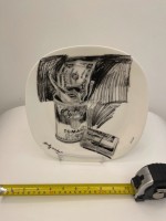 SET OF 12 Andy Warhol American Modern square shaped dinner plates featuring a black and white sketched Campbell's Soup can adjacent to a roll of dollars. (PRICED AS SET) AVAILABLE INDIVIDUALLY..