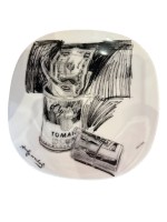 SET OF 4 Andy Warhol American Modern square shaped dinner plates featuring a black and white sketched Campbell's Soup can adjacent to a roll of dollars. (PRICED AS SET) AVAILABLE INDIVIDUALLY.