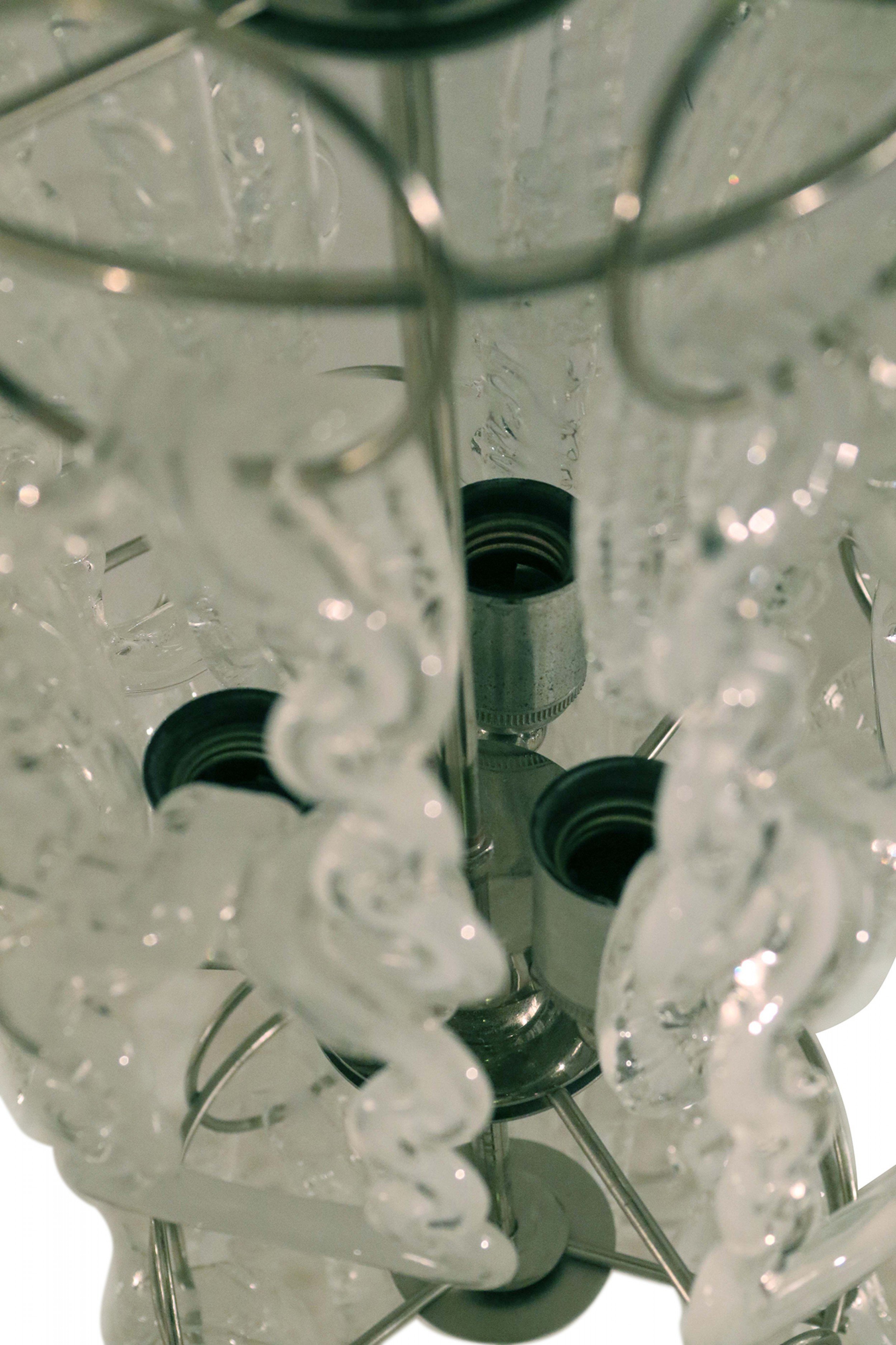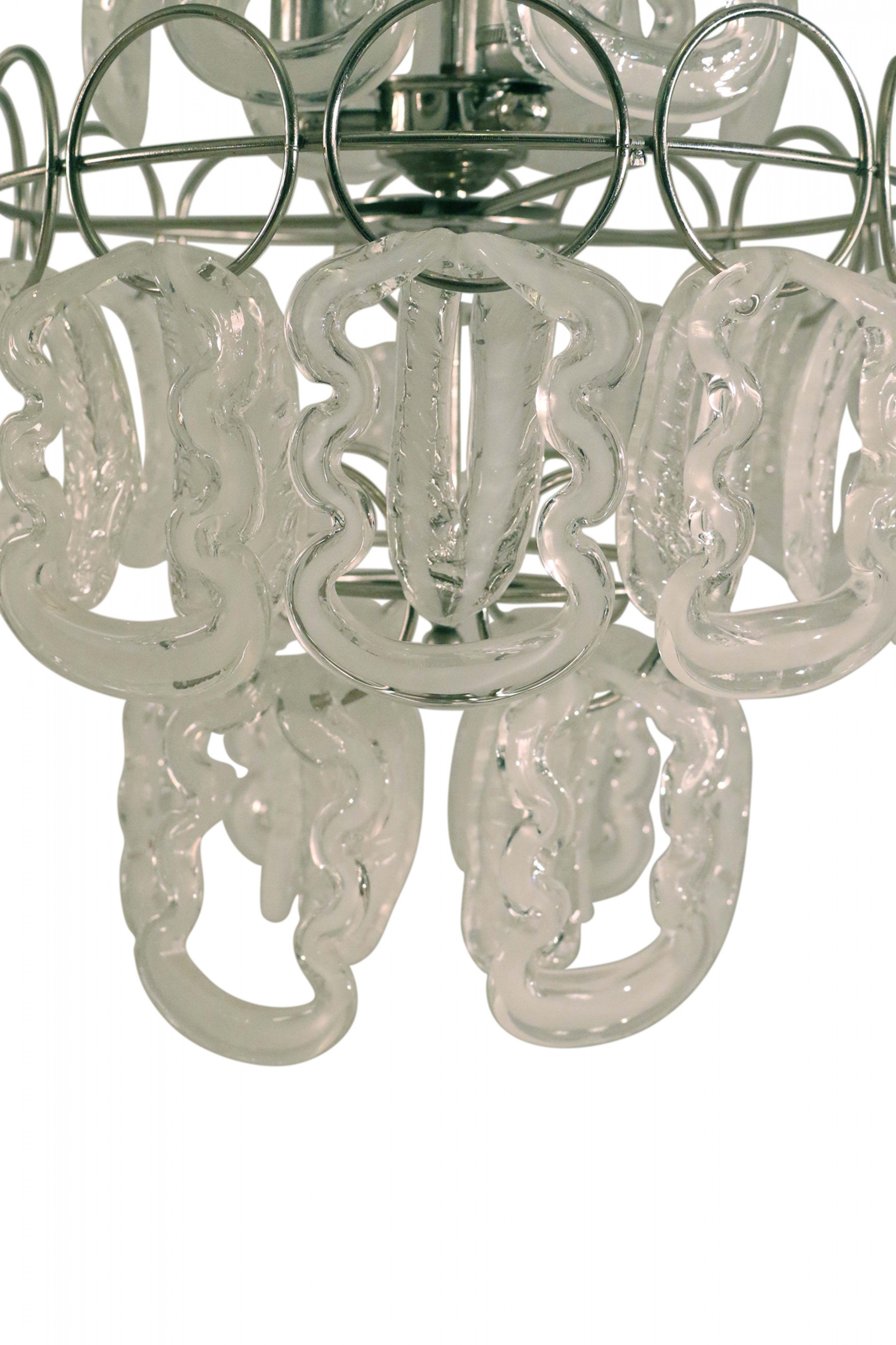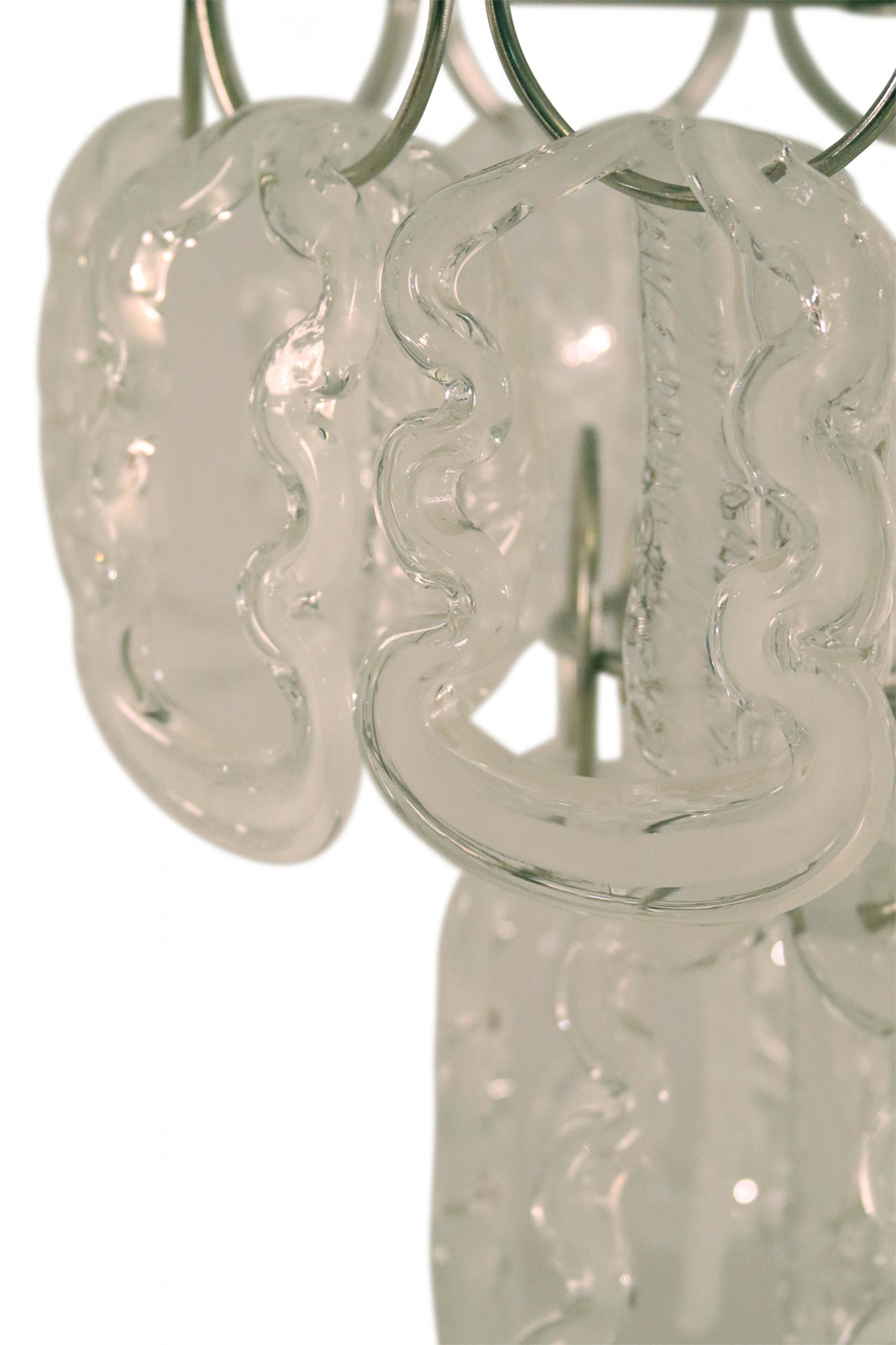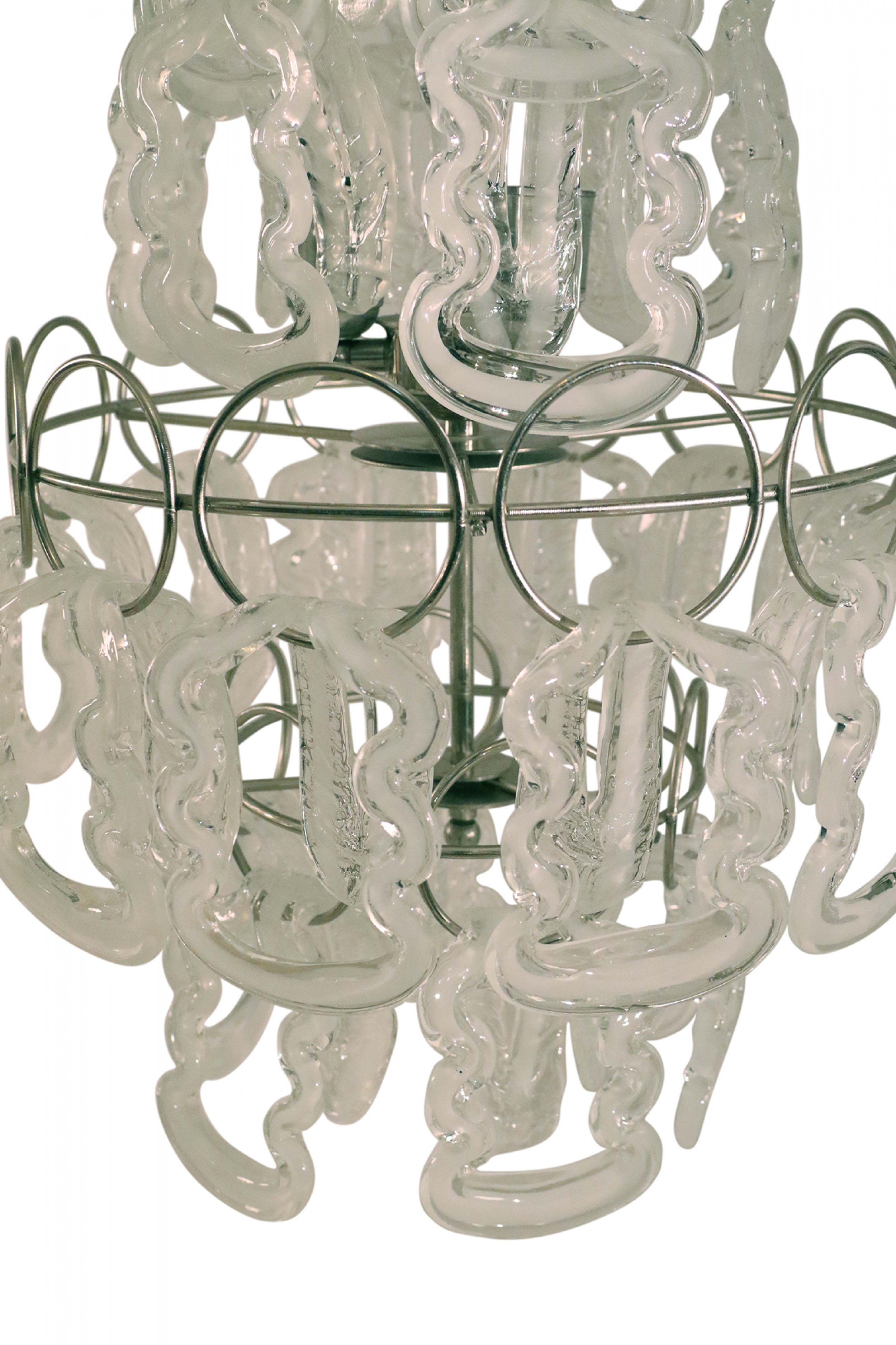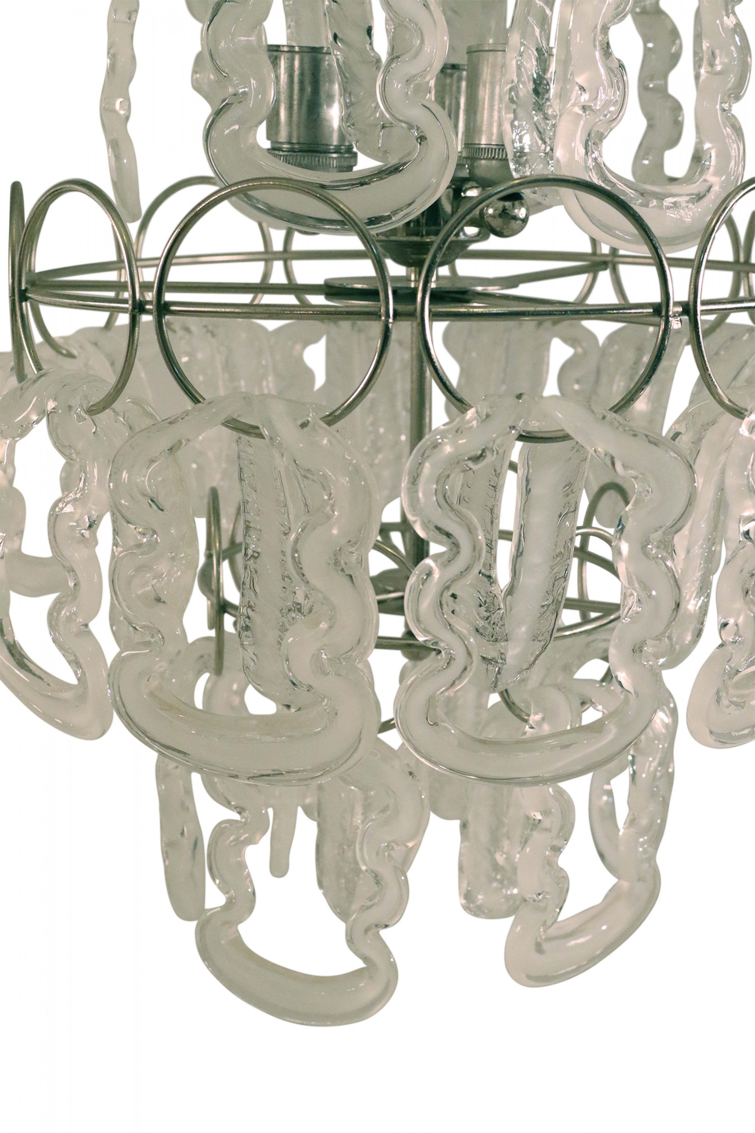 Mid-Century glass chandelier comprised of blown glass loops hanging from a silver metal tiered frame with decorative circular design. (ANGELO MANGIAROTTI)
