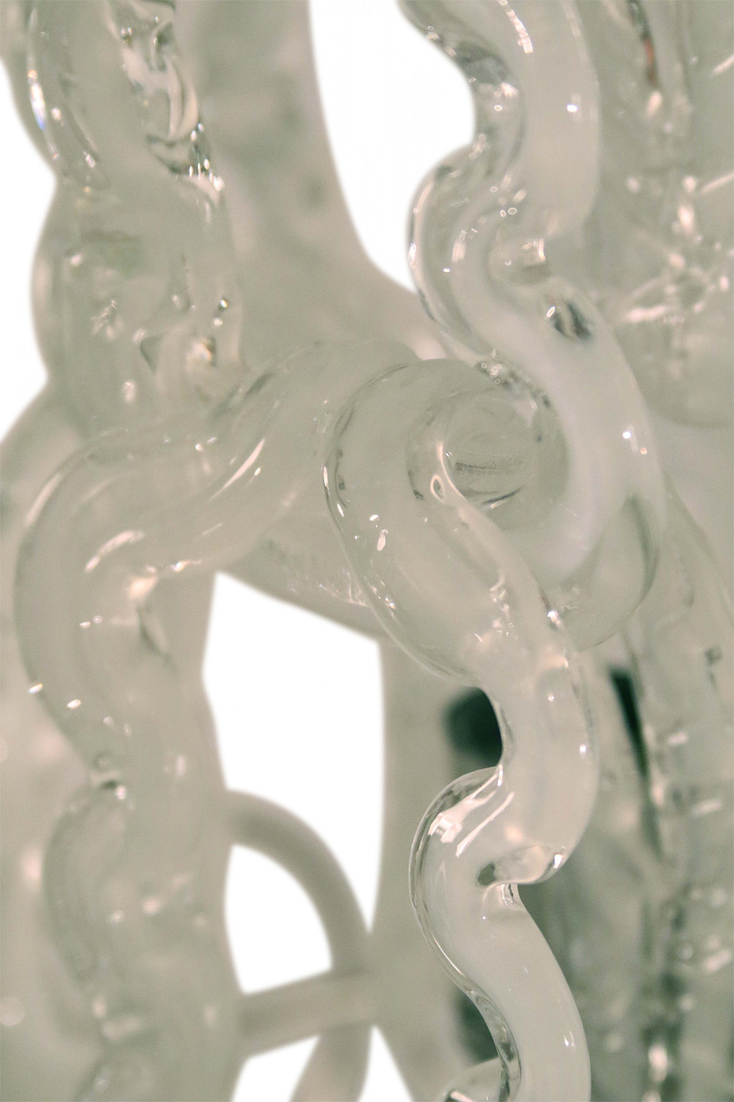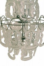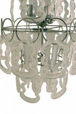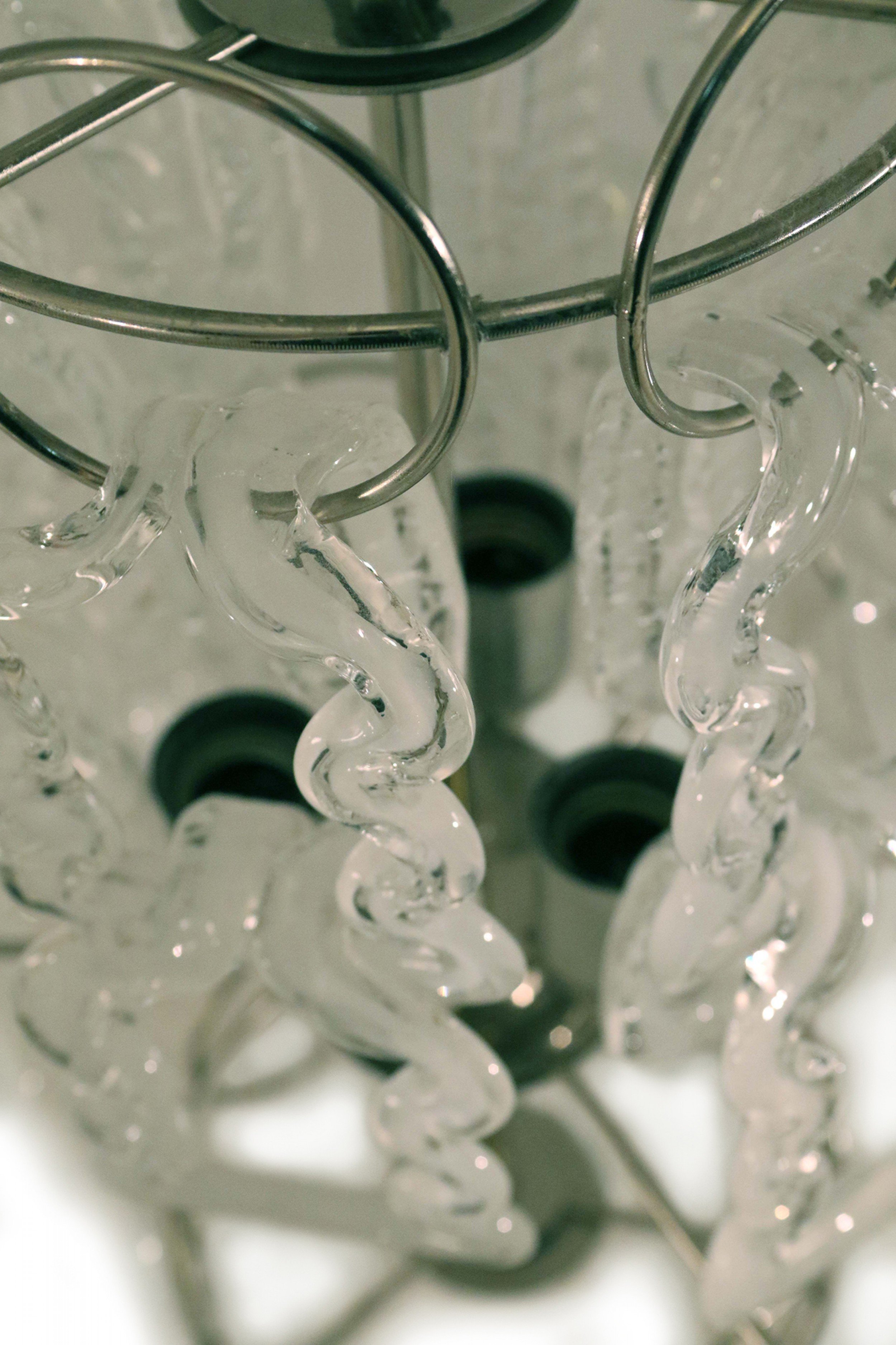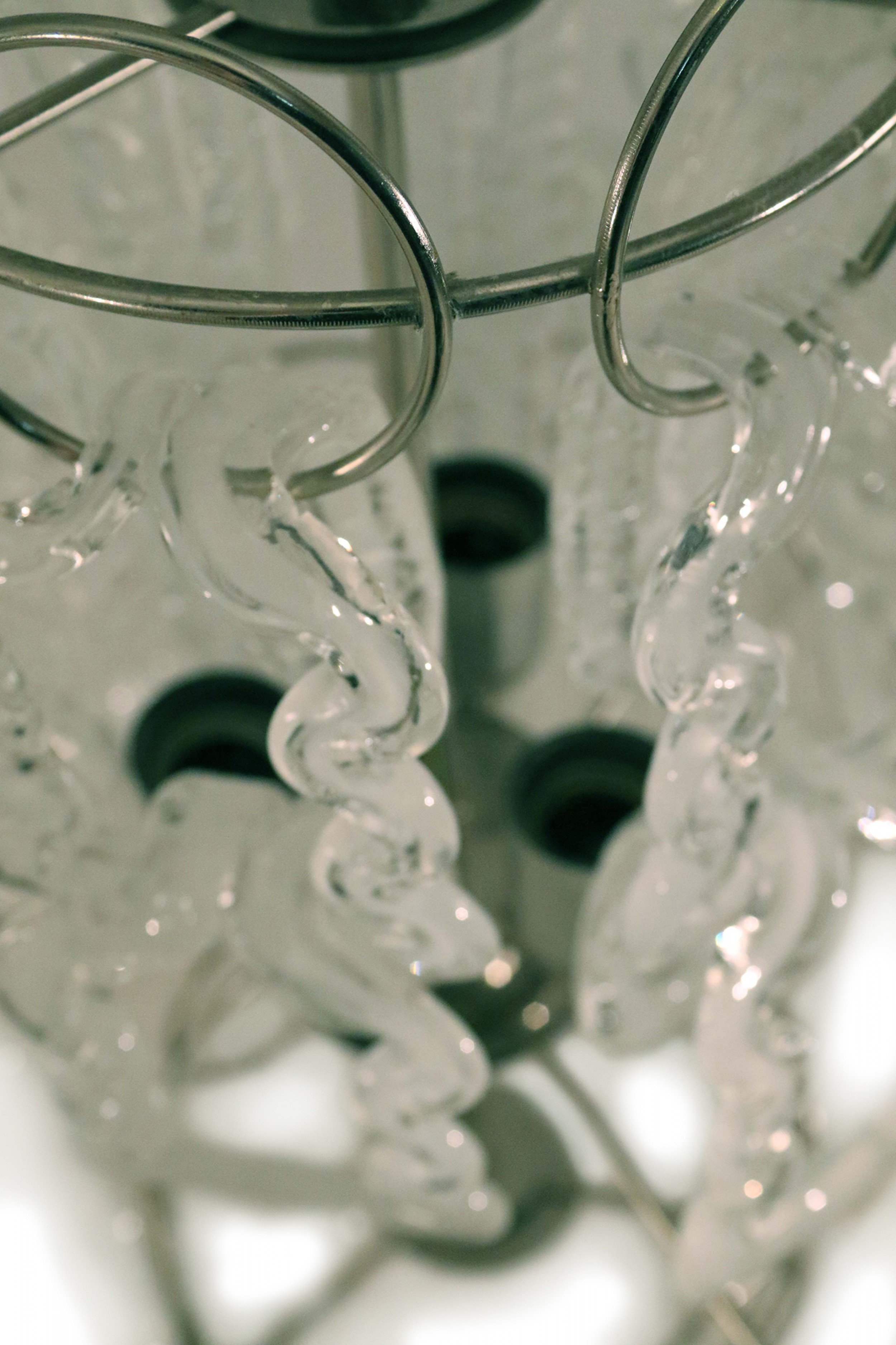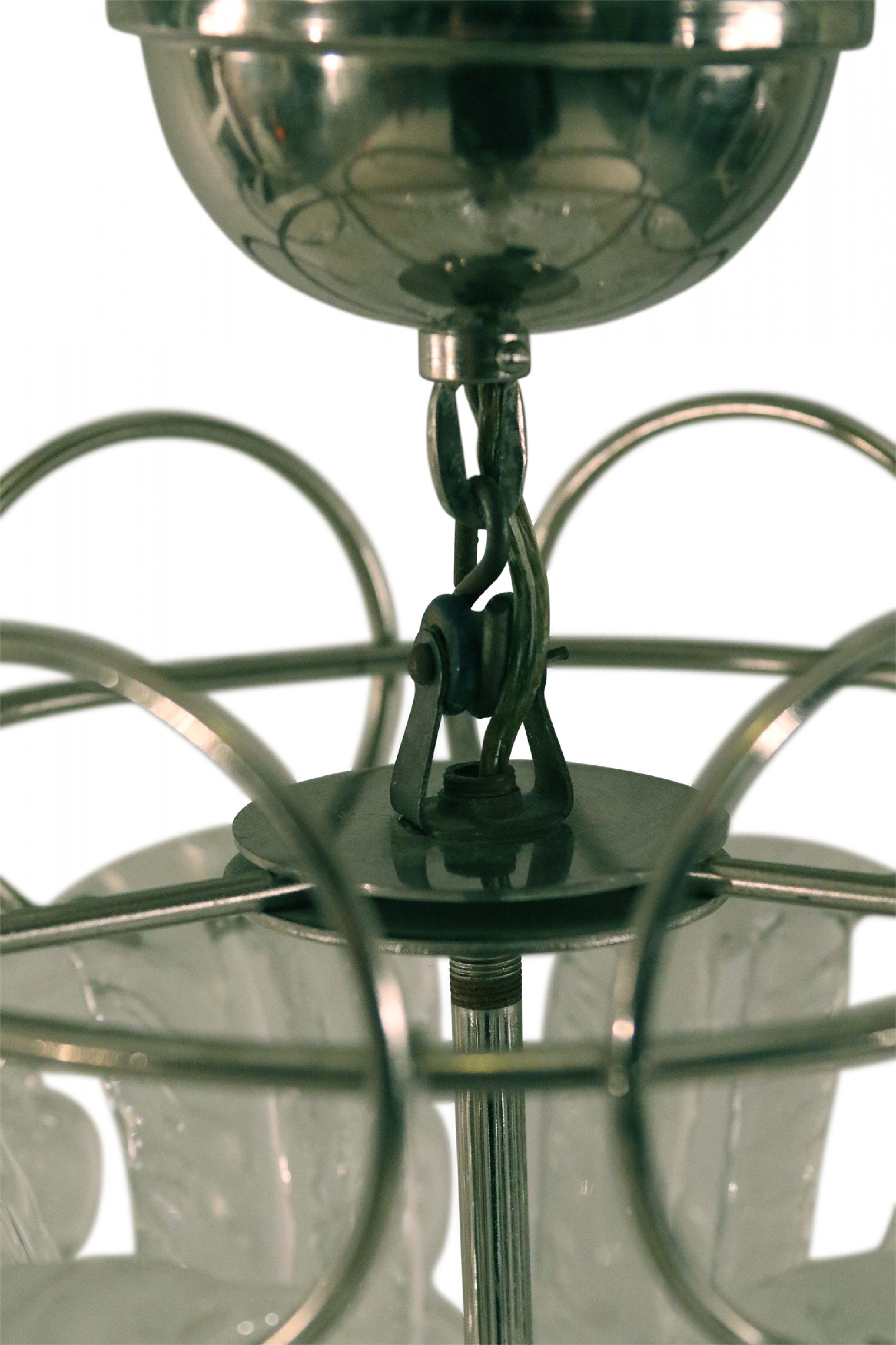 Mid-Century glass chandelier comprised of blown glass loops hanging from a silver metal tiered frame with decorative circular design. (ANGELO MANGIAROTTI)