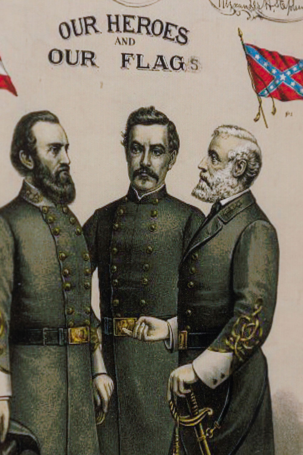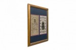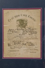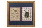 American 19th Century military discharge document matted next to a copy of a Civil War lithograph commemorating soldiers in a blue mat with a gold wooden frame..