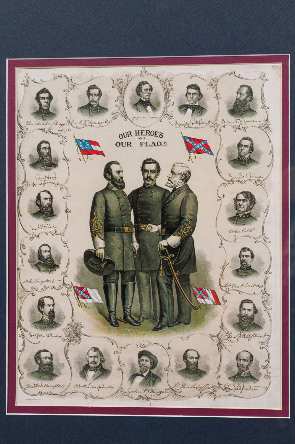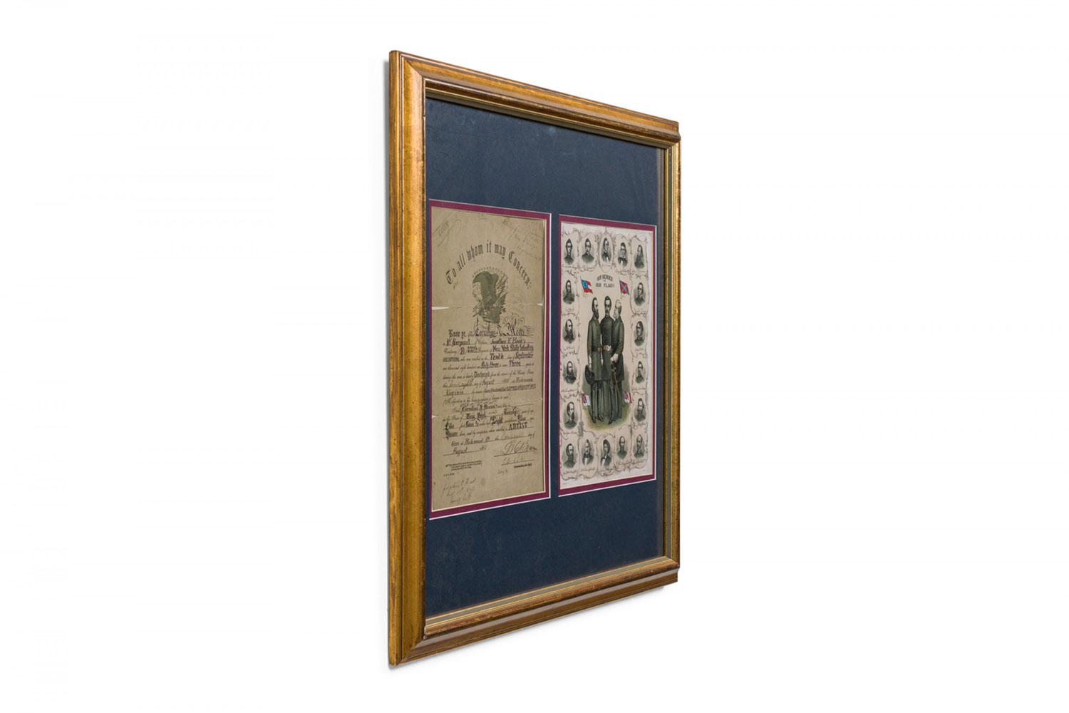 American 19th Century military discharge document matted next to a copy of a Civil War lithograph commemorating soldiers in a blue mat with a gold wooden frame.