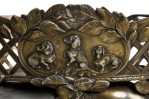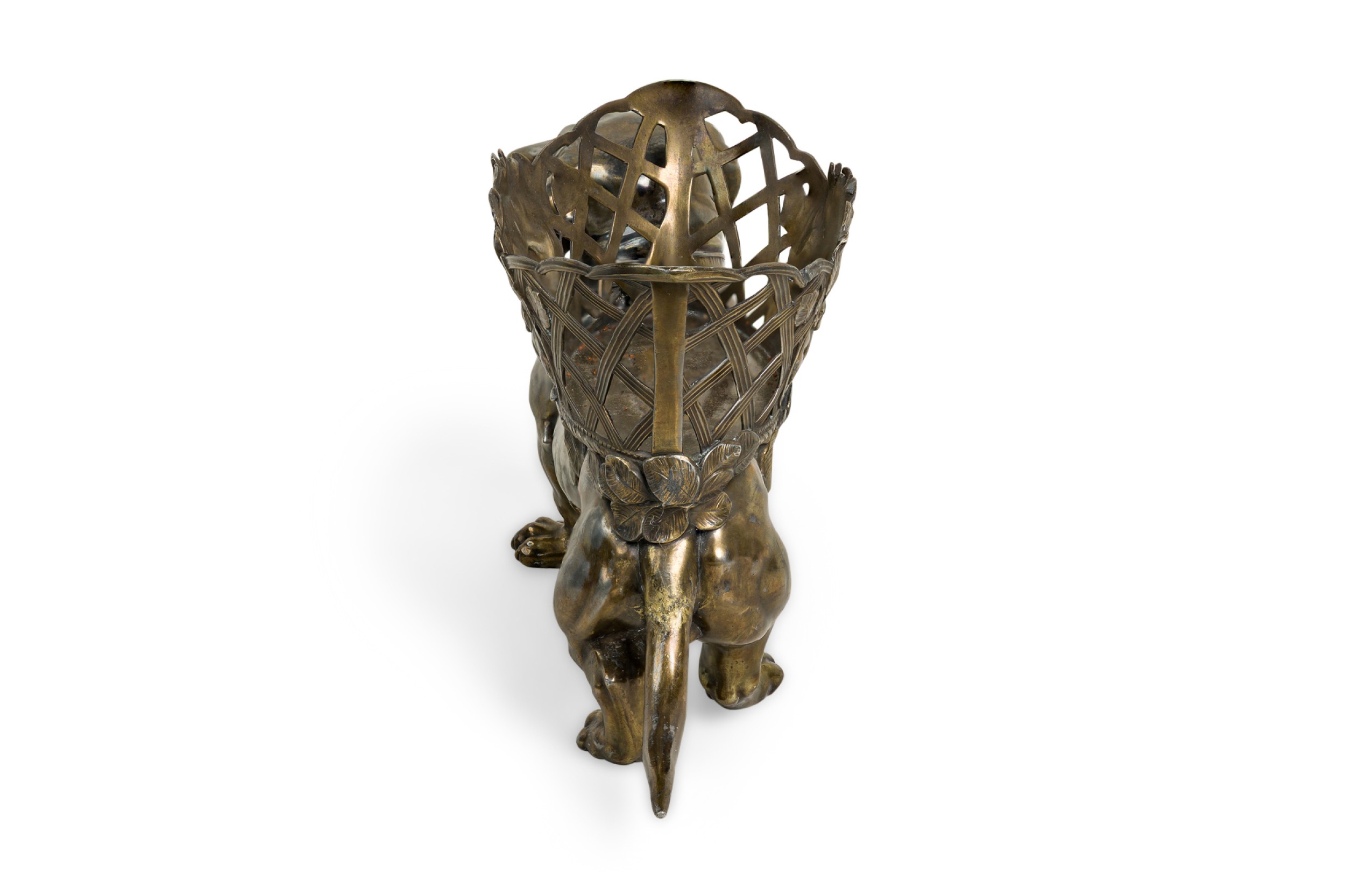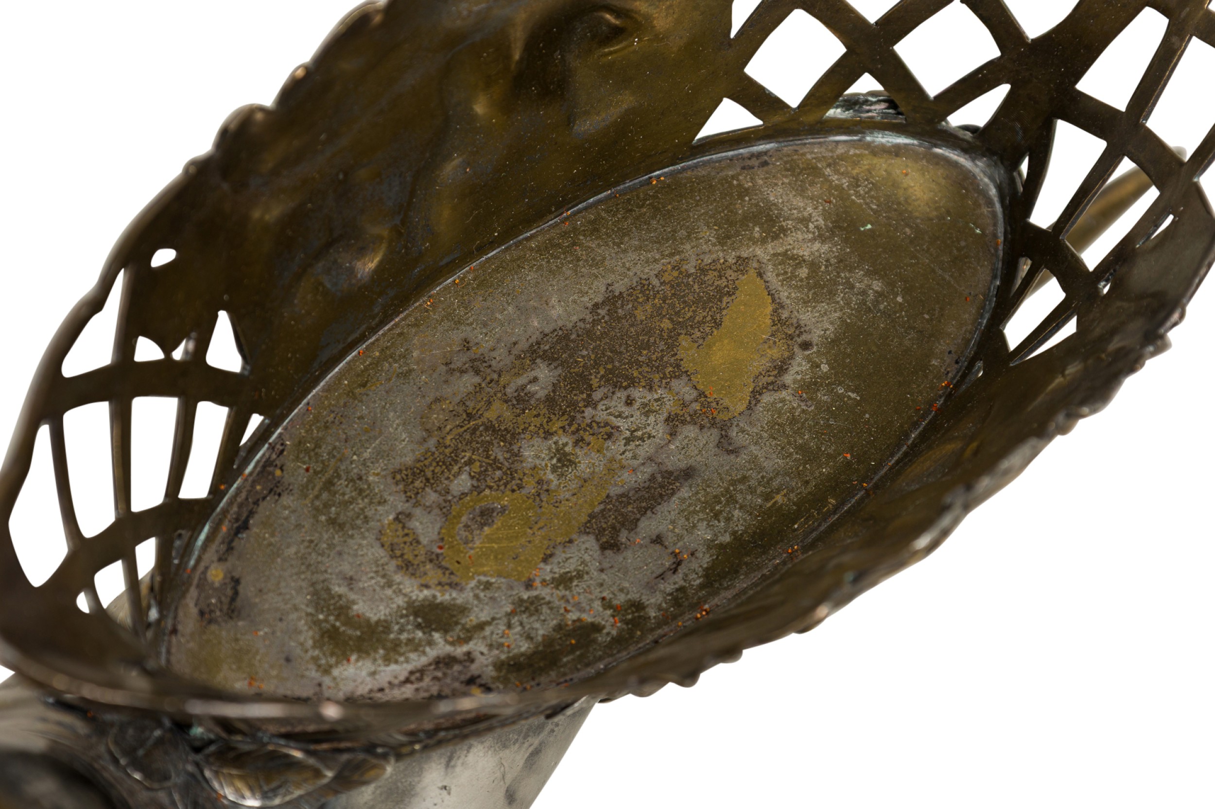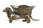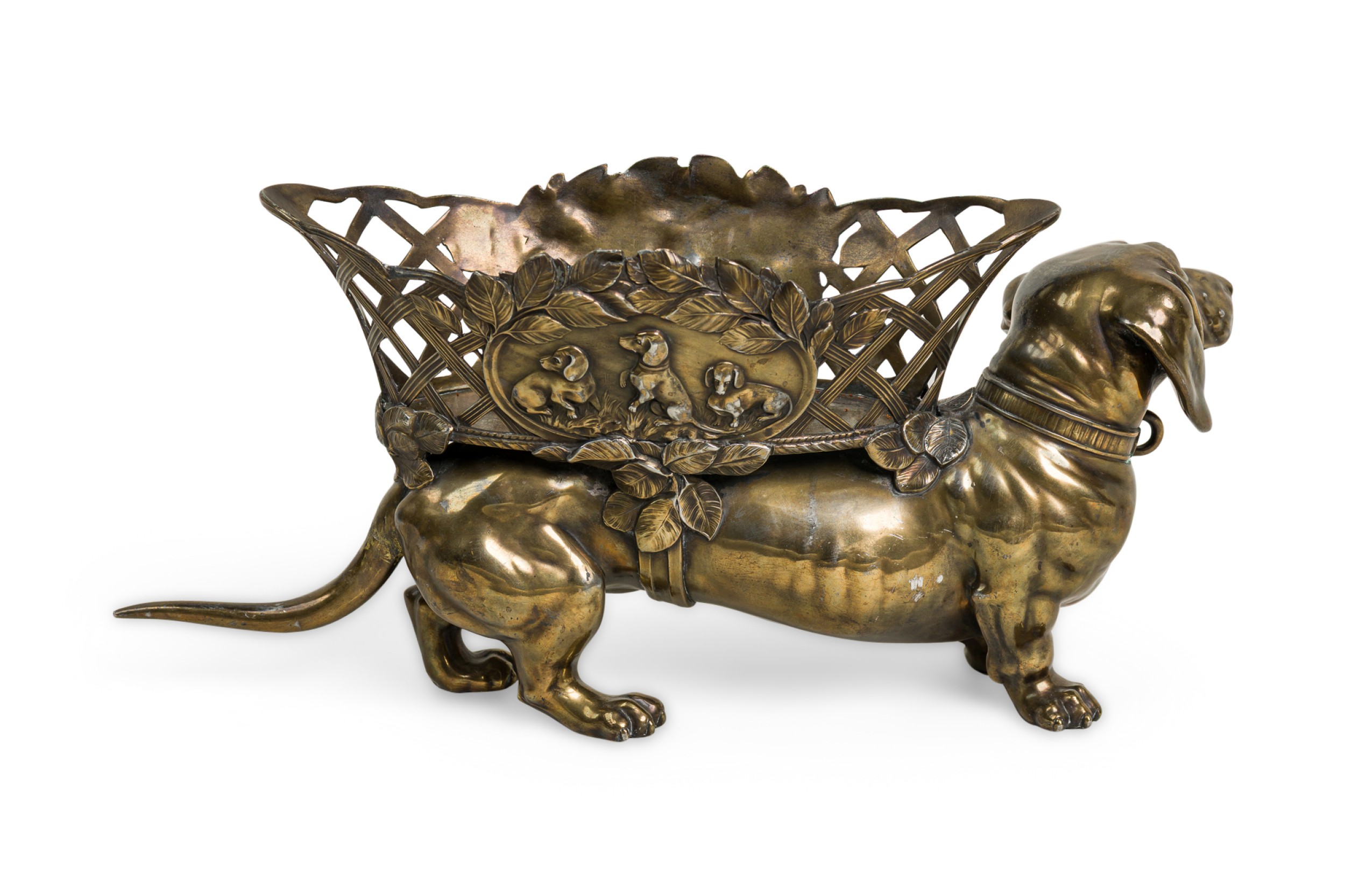 English Art Nouveau dachsund dog figure carrying a basket with a relief of three dachsunds playing on the open work design with wreath of leaves tied around his body