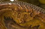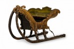 Russian (18/19th Cent) large painted and gilt trimmed carved sleigh with green velvet seat.