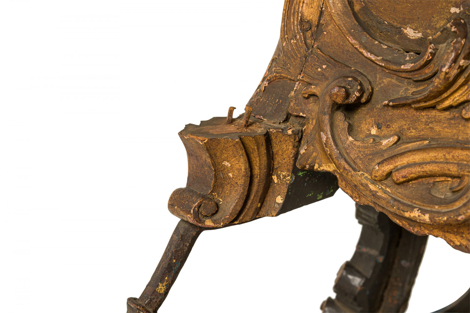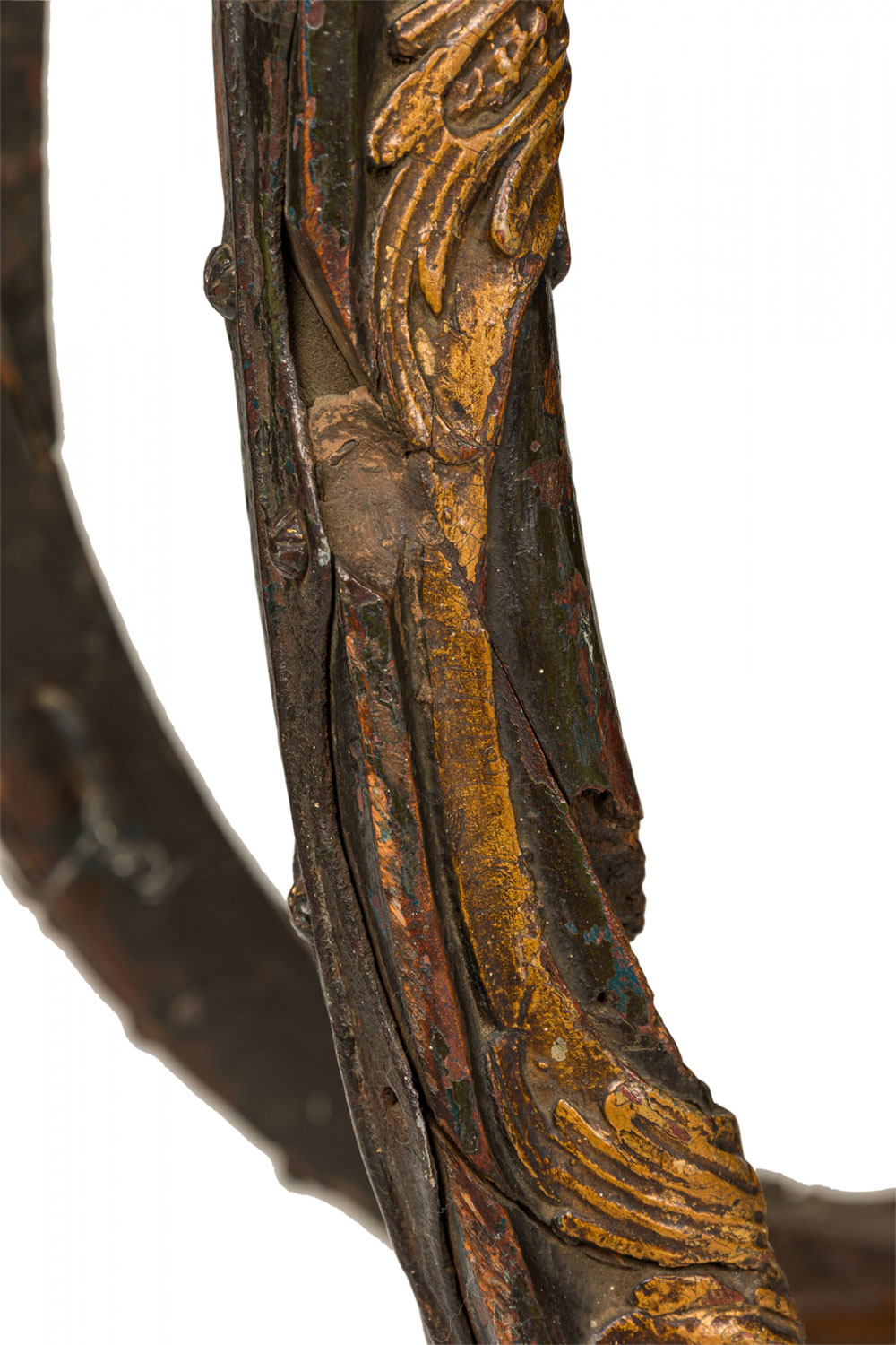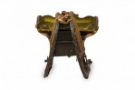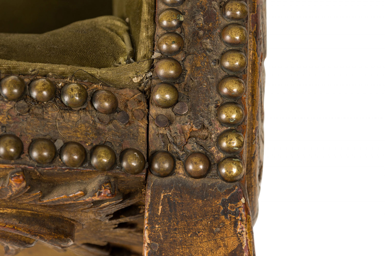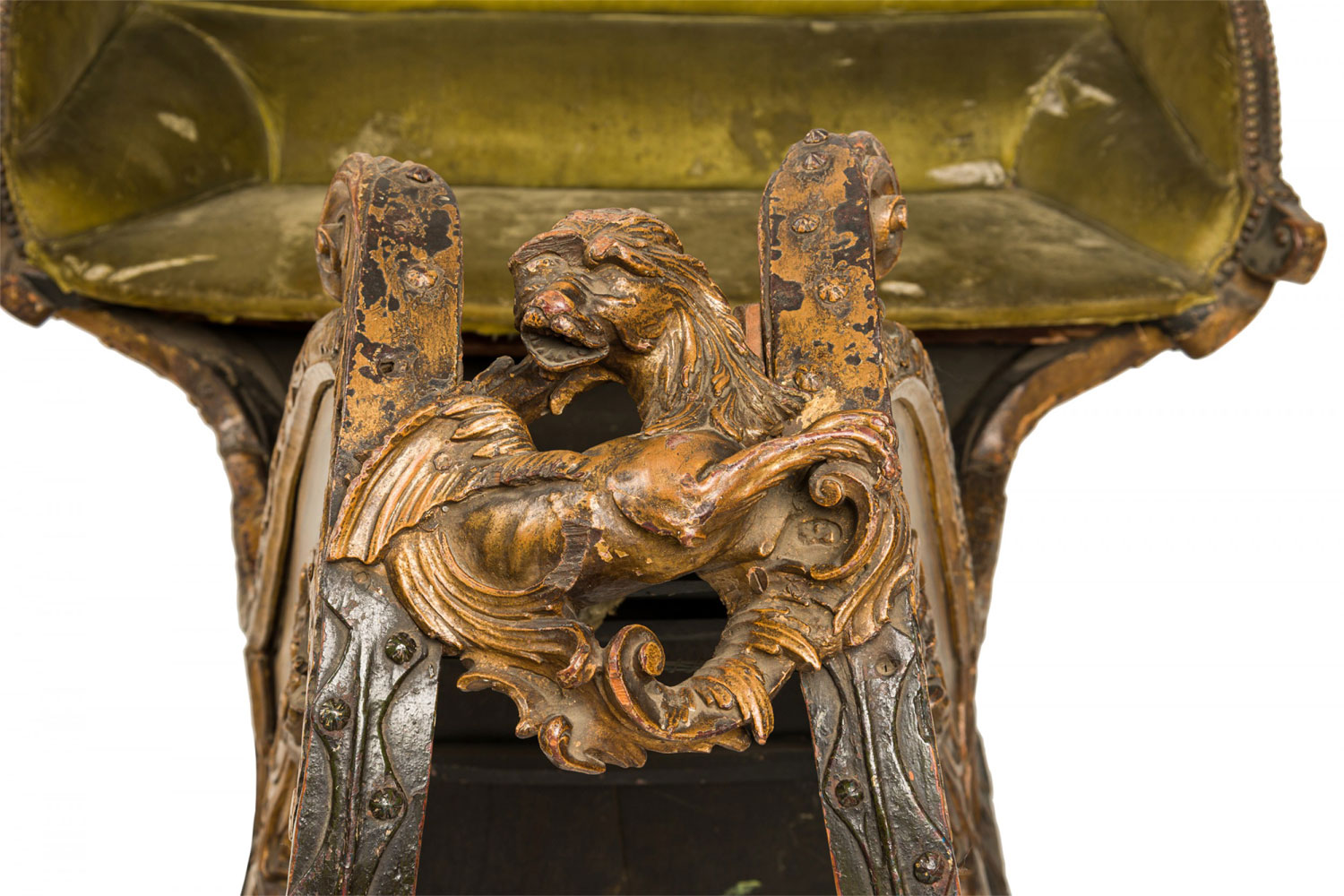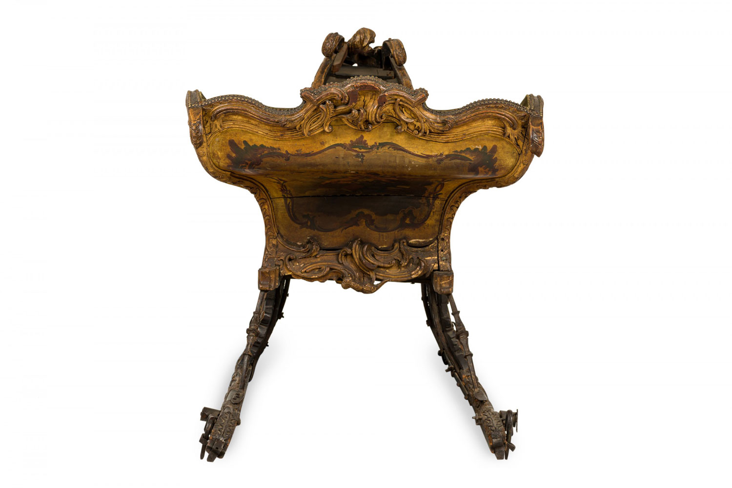 Style: Russian Materials & Techniques: Carved, painted, velvet Category: Accessories/Décor/Bric-a-Brac, Outdoor Condition: Velvet seat is very worn and threadbare in places. Losses to gilt trim and buckling in finish. Runners are loose. One runner has a structural crack. Not suitable for sitting, for display purposes only. Good; Wear consistent with age and use