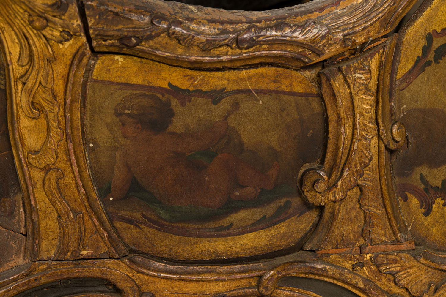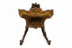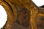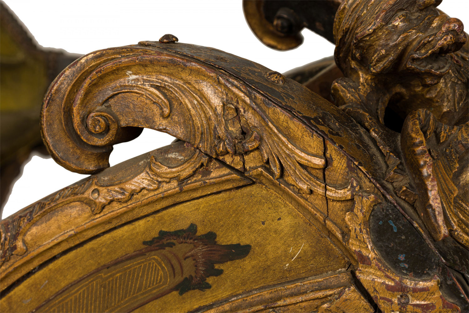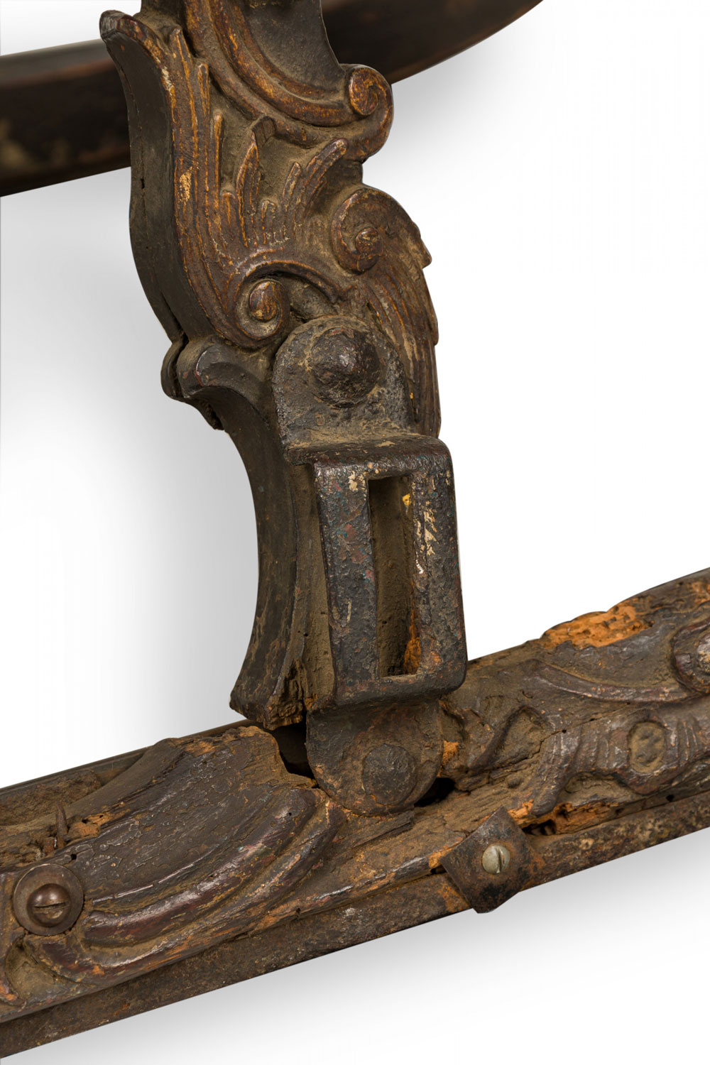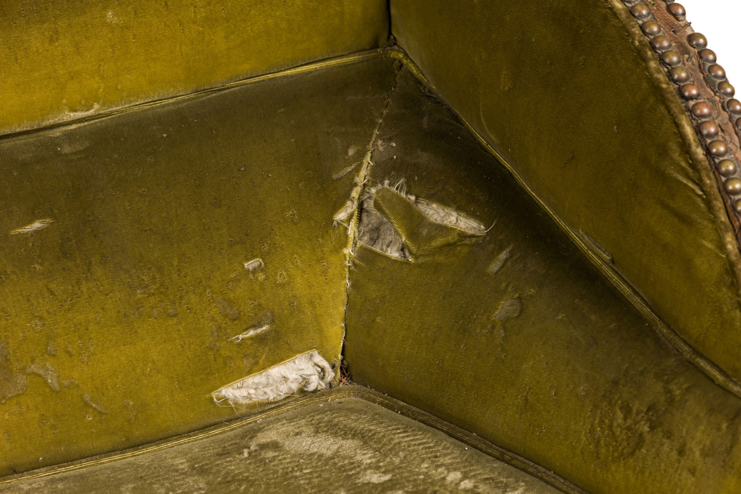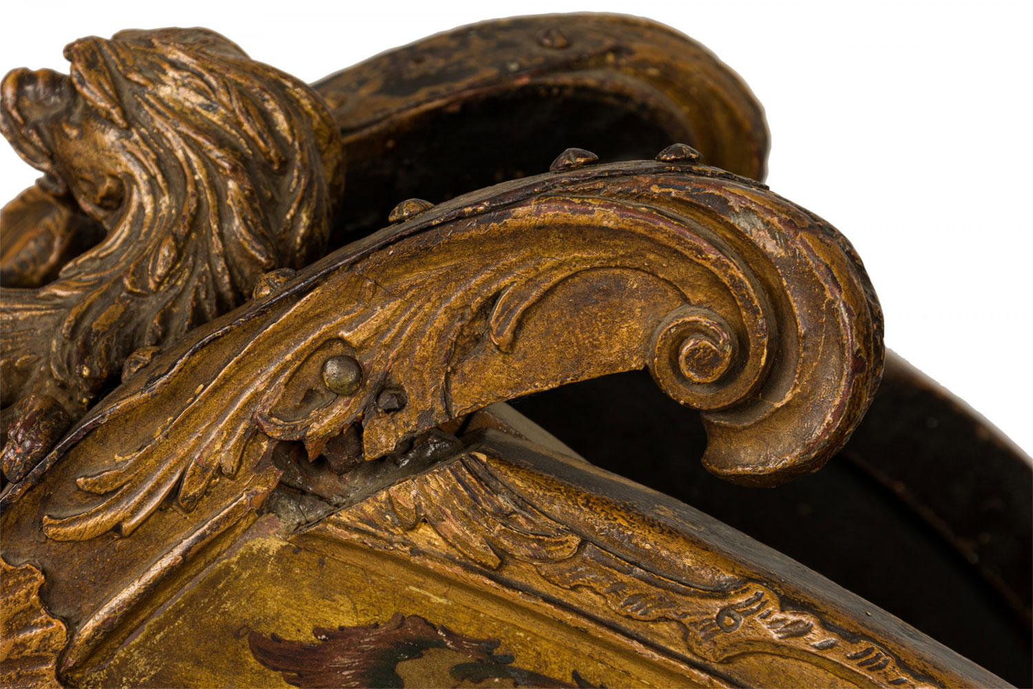 Style: Russian Materials & Techniques: Carved, painted, velvet Category: Accessories/Décor/Bric-a-Brac, Outdoor Condition: Velvet seat is very worn and threadbare in places. Losses to gilt trim and buckling in finish. Runners are loose. One runner has a structural crack. Not suitable for sitting, for display purposes only. Good; Wear consistent with age and use