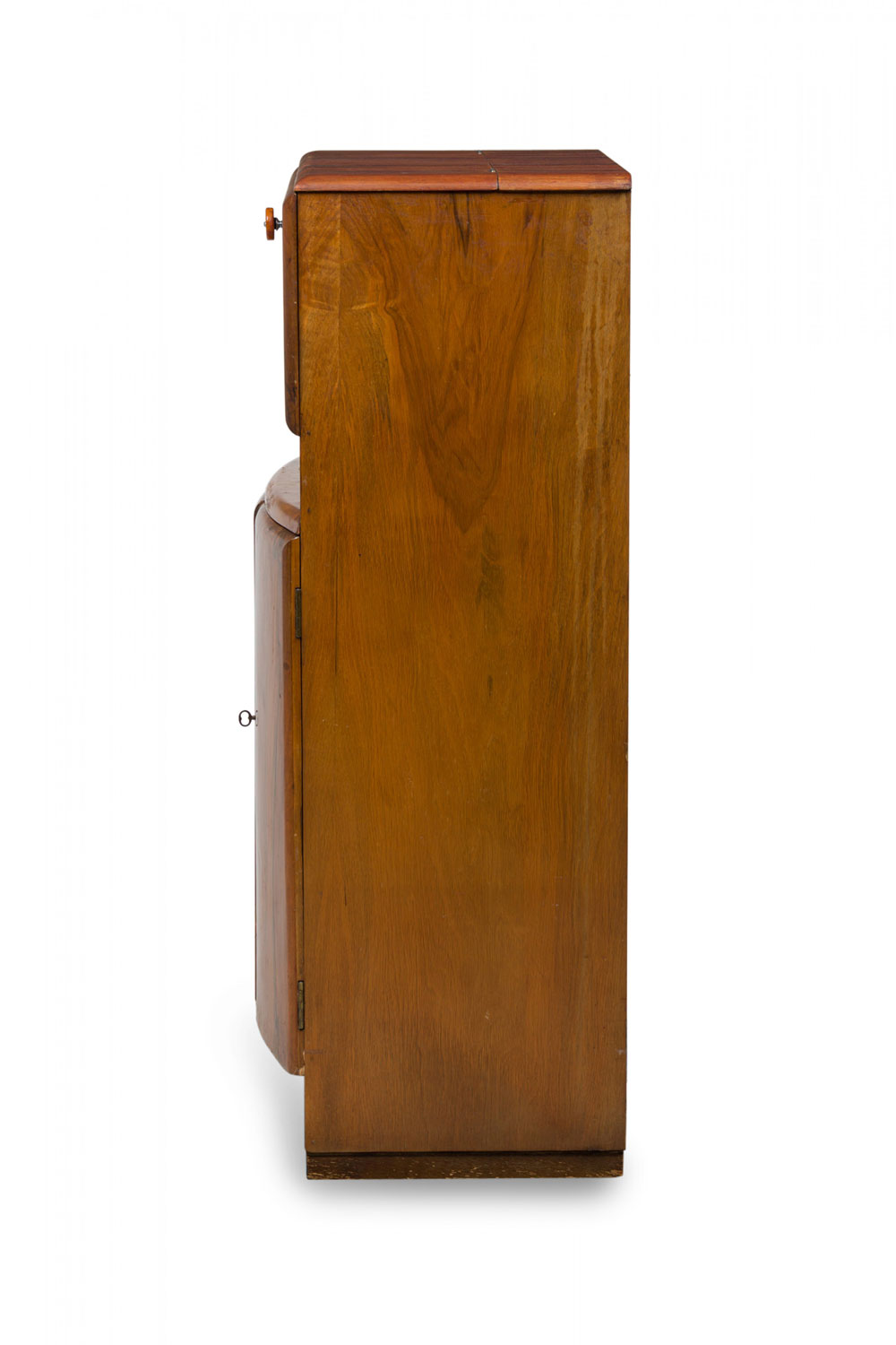 Art Deco American bow front matchbook veneered rectangular bar cabinet with a hinged top dropdown drawer (with scroll & foliate brass escutcheon plus original bakelite signature pull) over a drum bottom section's pullout doors hide