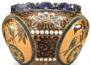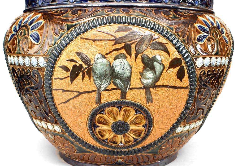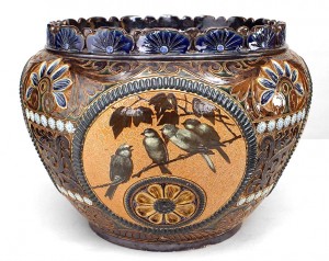 English Arts & Crafts Royal Doulton Lambeth stoneware jardiniere with 4 decorated panels depicting birds & incised with artist's marks for Florence Barlow & Frank Butler..