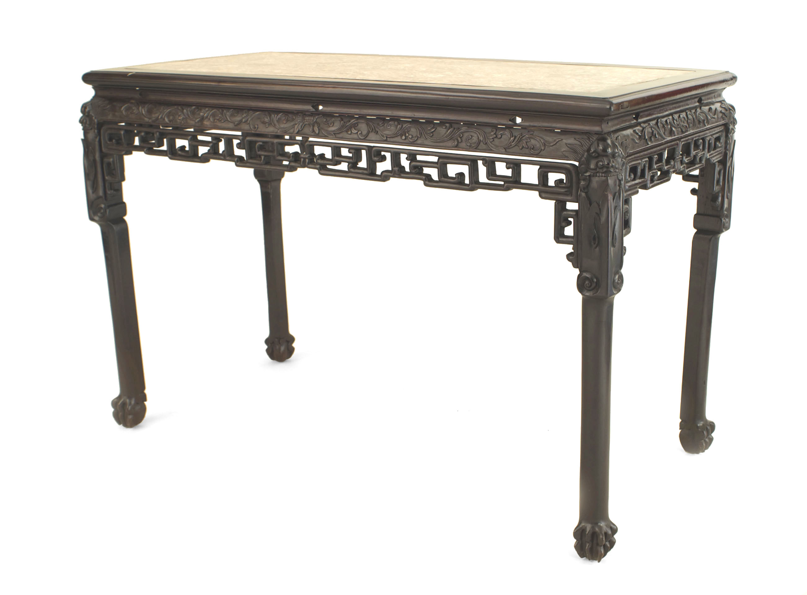 Asian Chinese style (18/19th Century) hardwood rectangular center table with a carved apron having a filigree bottom edge with an inset marble top..