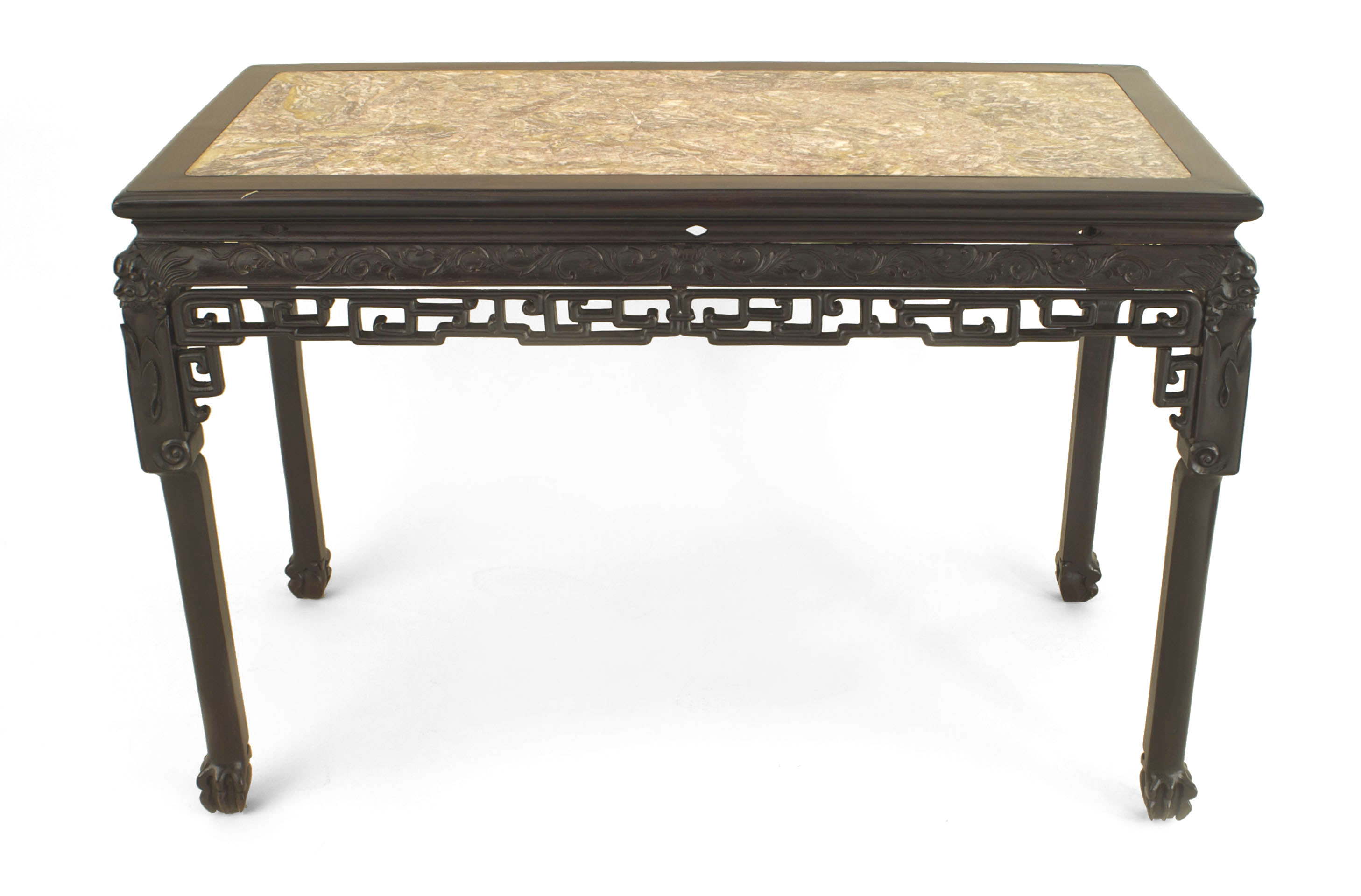Asian Chinese style (18/19th Century) hardwood rectangular center table with a carved apron having a filigree bottom edge with an inset marble top.