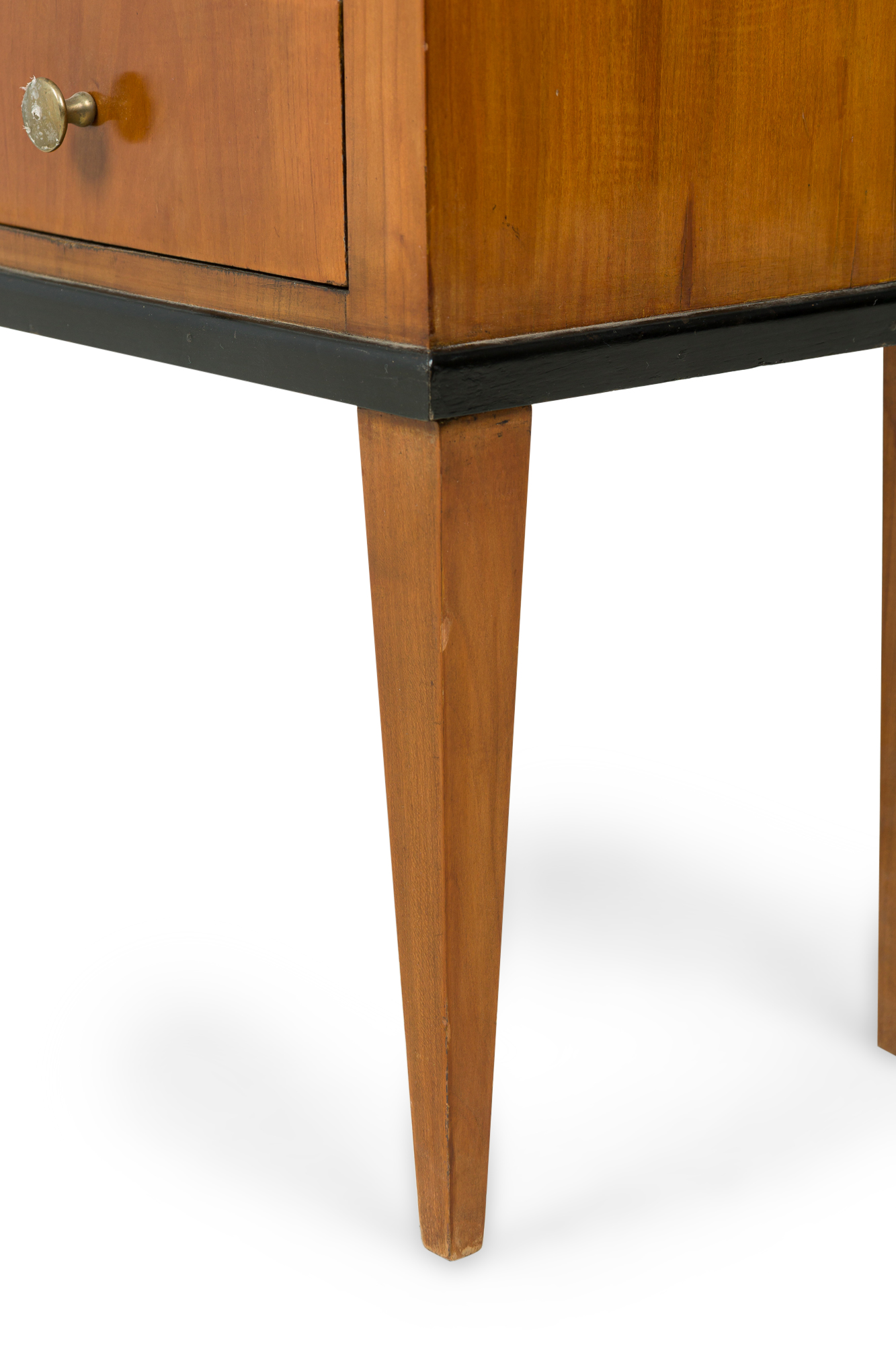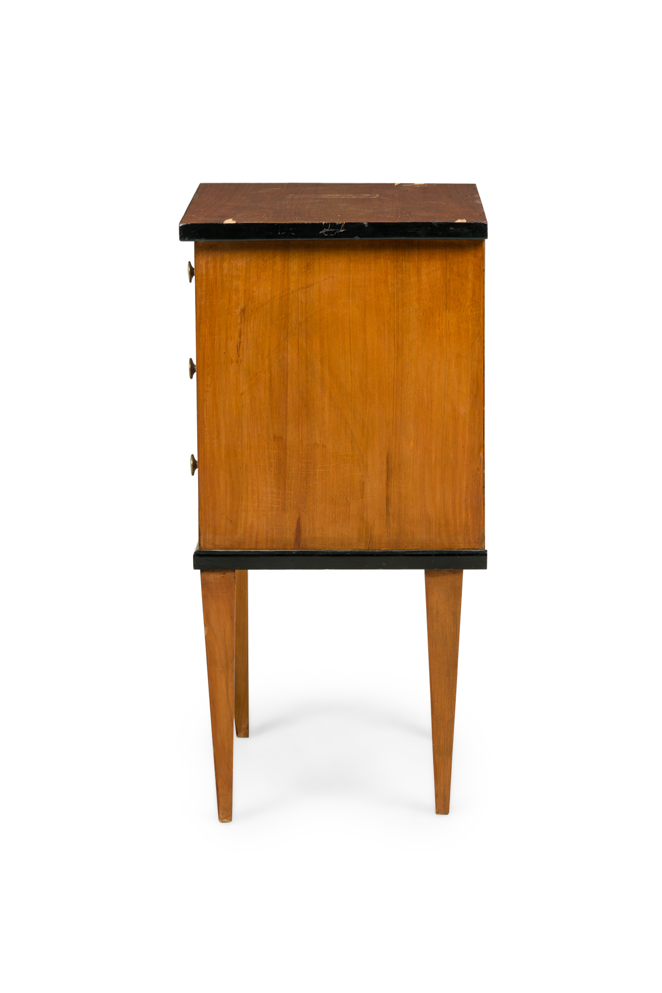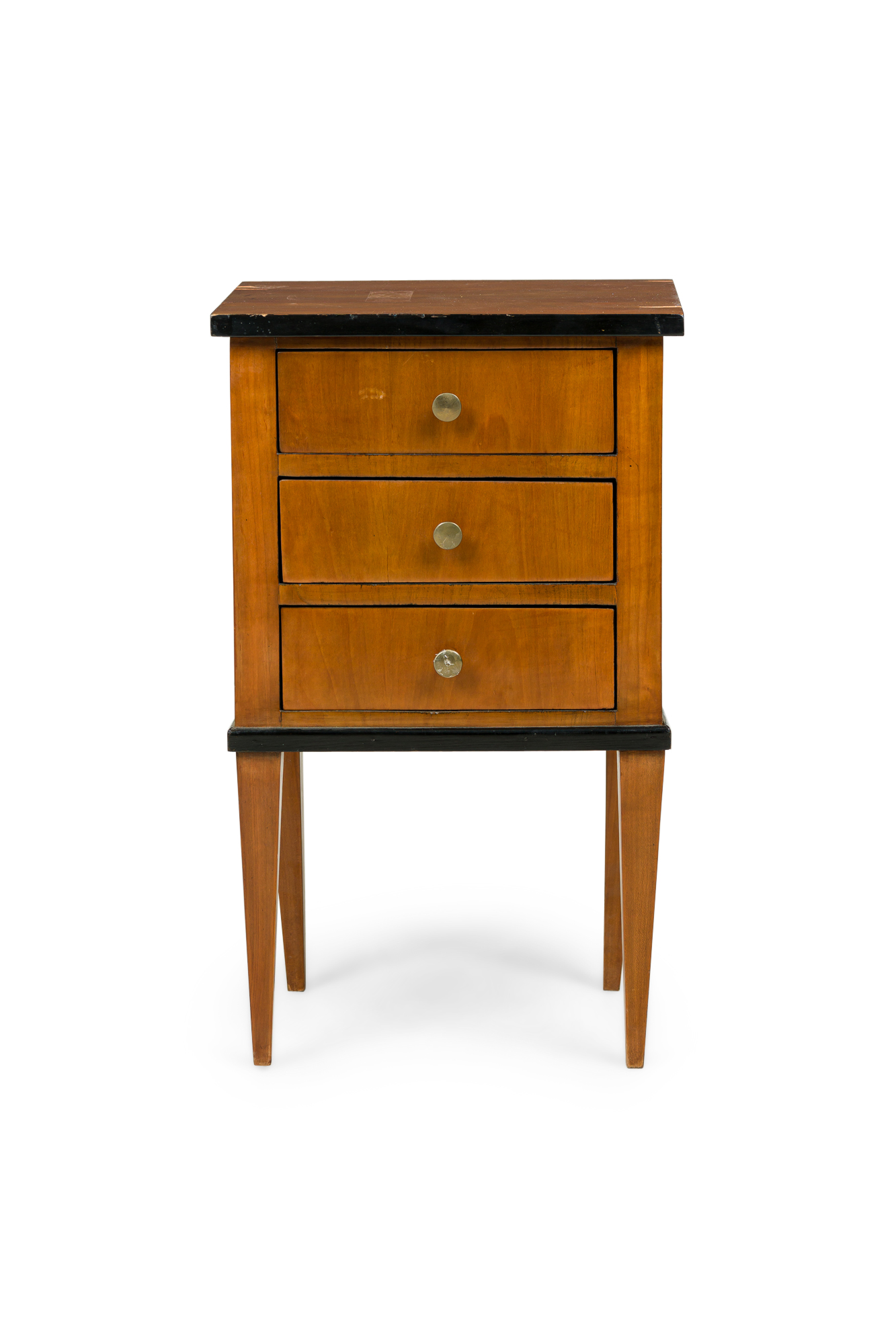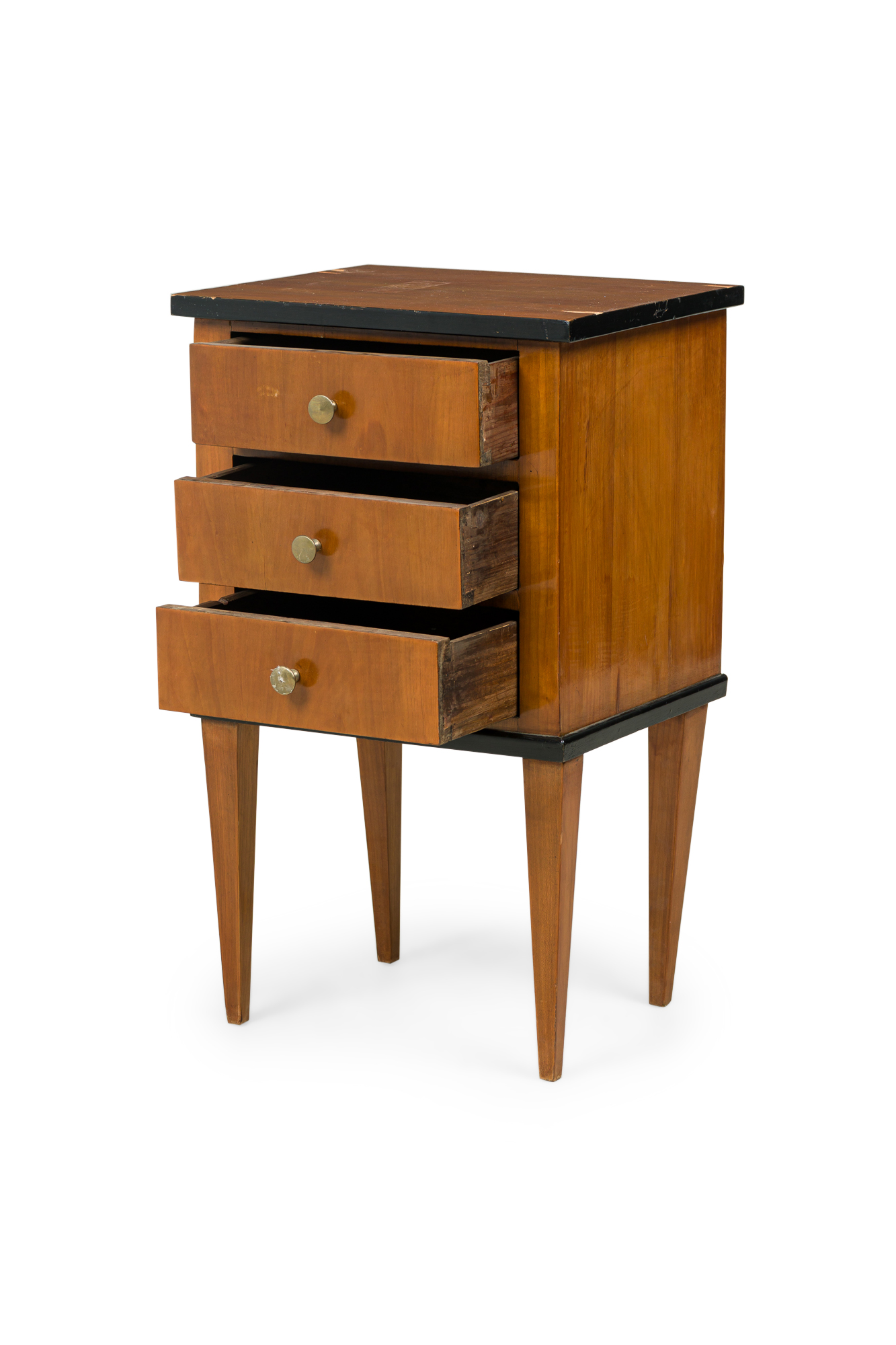 Austrian Biedermeier cherrywood bedside commode with black trim and 3 drawers with brass round drawer pulls (veneer issues on top)