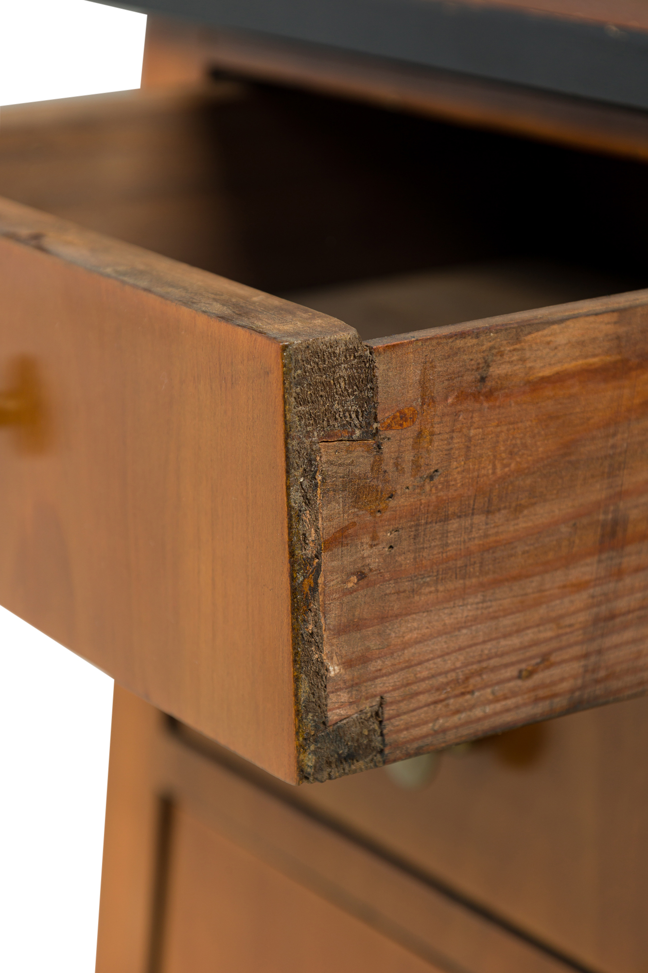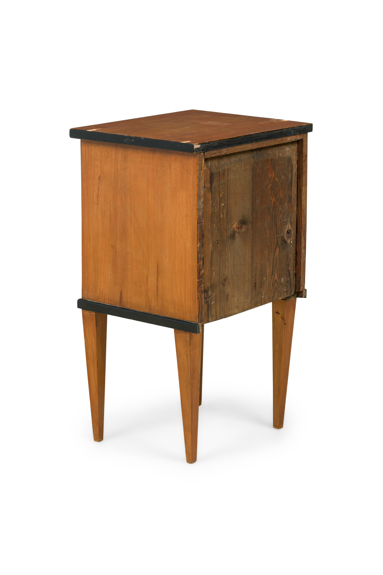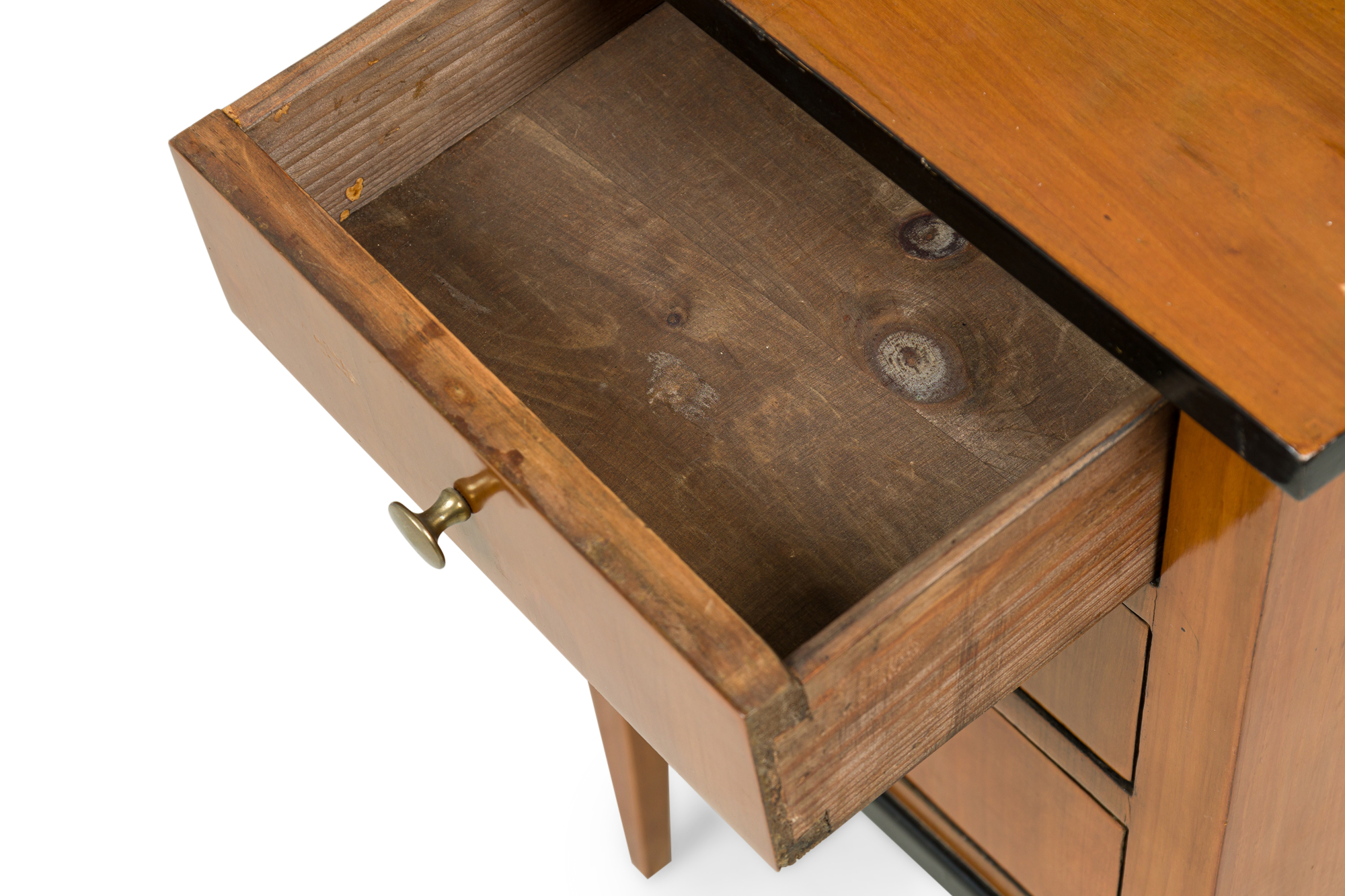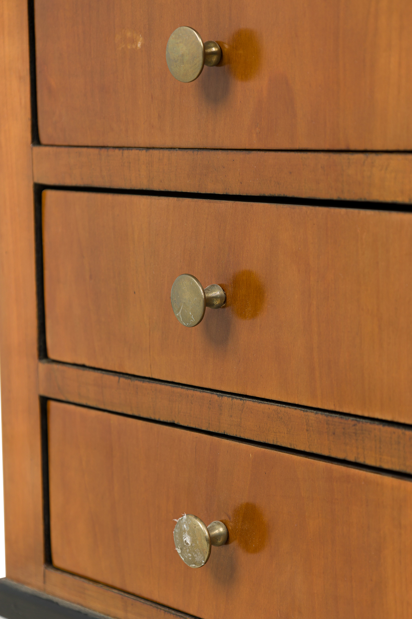 Austrian Biedermeier cherrywood bedside commode with black trim and 3 drawers with brass round drawer pulls (veneer issues on top)