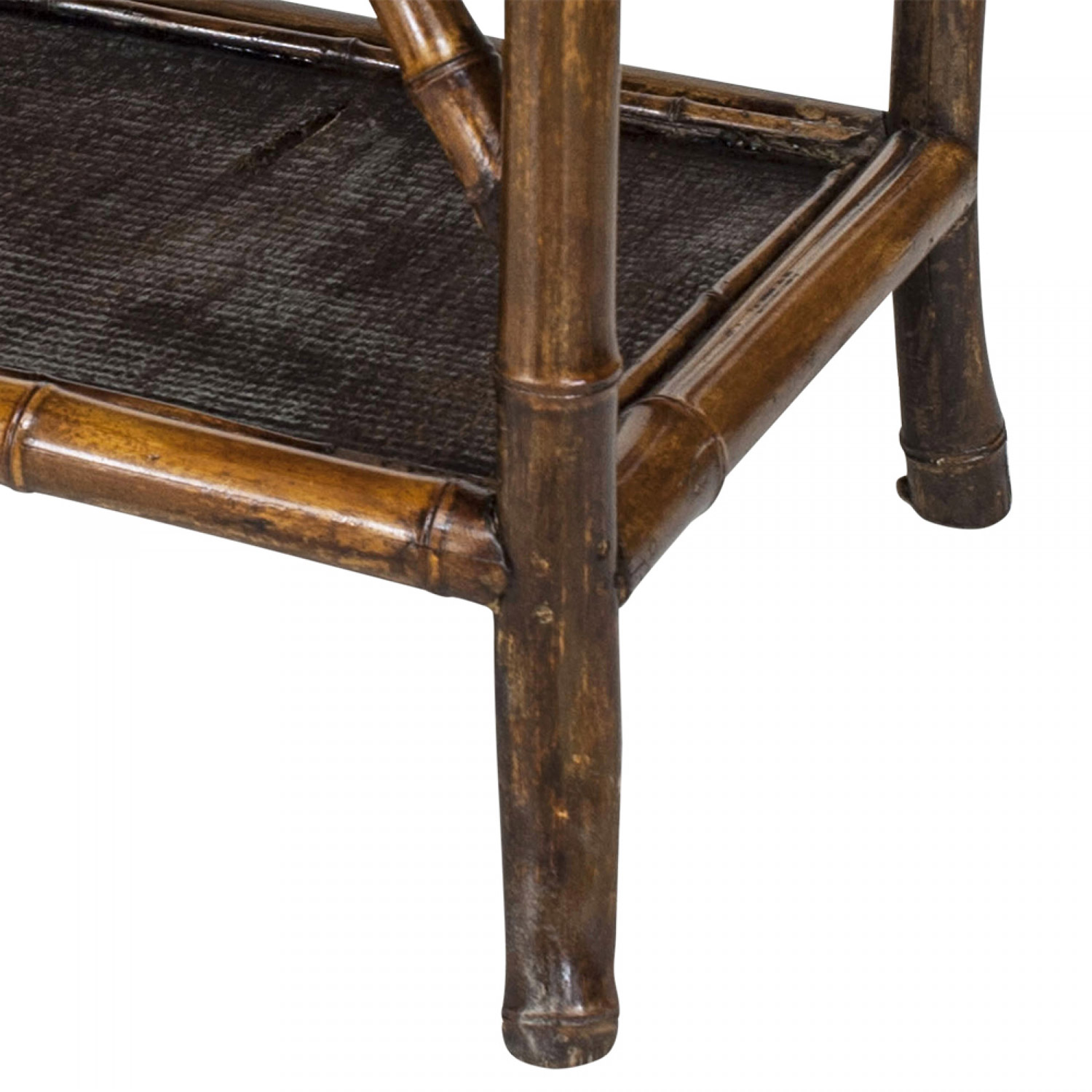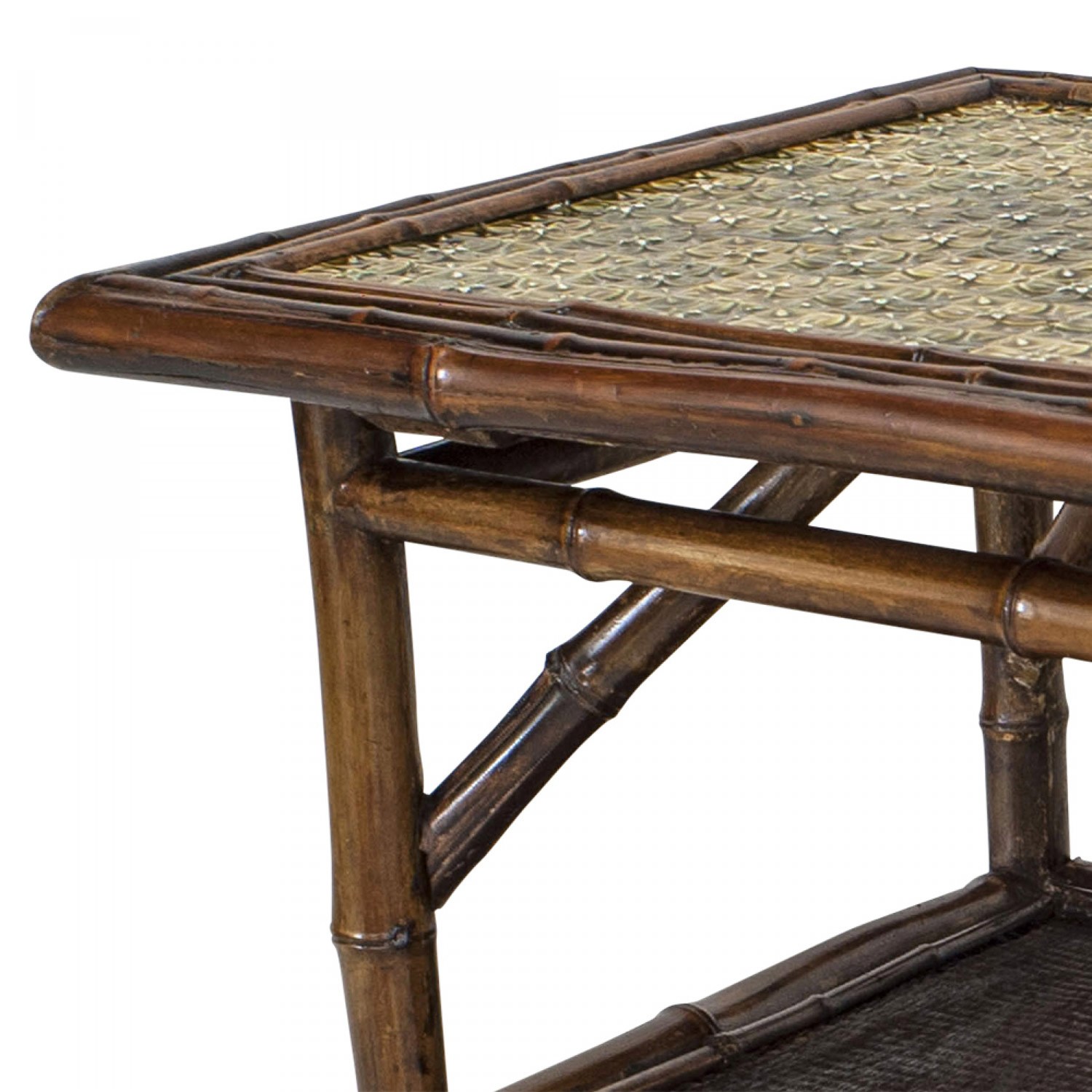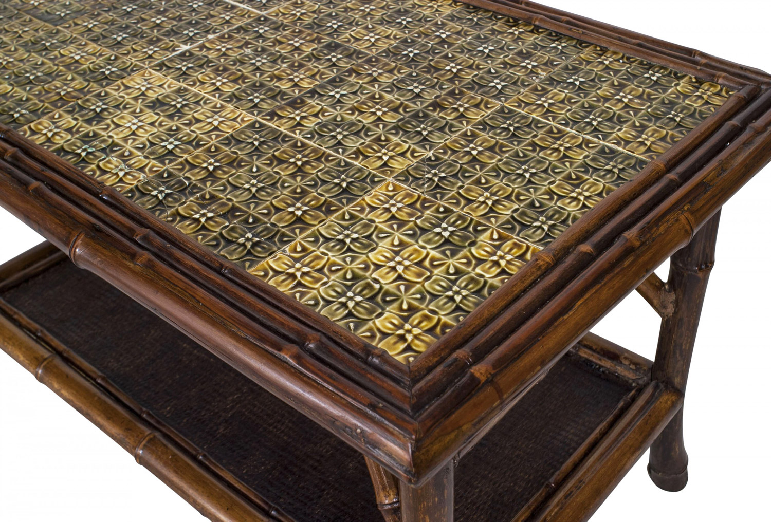 English Bamboo (19th Century) rectangular coffee table with a green tile top and a rush covered lower shelf..
