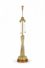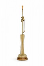 Mid-Century Italian glass table lamp in twisted column form with an extended brass stem topped by an upturned cupped finial, two functioning light sockets with beaded pulls, and scalloped dome foot, mounted on a beveled circular giltwood base. (BAROVIER AND TOSO)