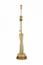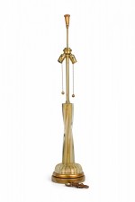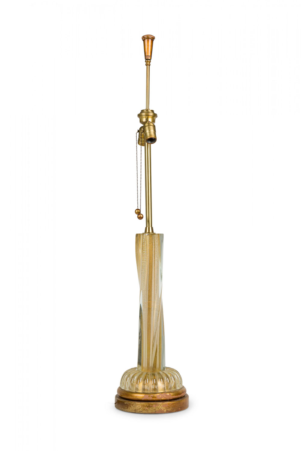 Mid-Century Italian glass table lamp in twisted column form with an extended brass stem topped by an upturned cupped finial, two functioning light sockets with beaded pulls, and scalloped dome foot, mounted on a beveled circular giltwood base. (BAROVIER AND TOSO).