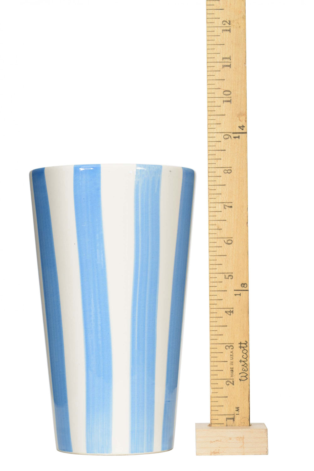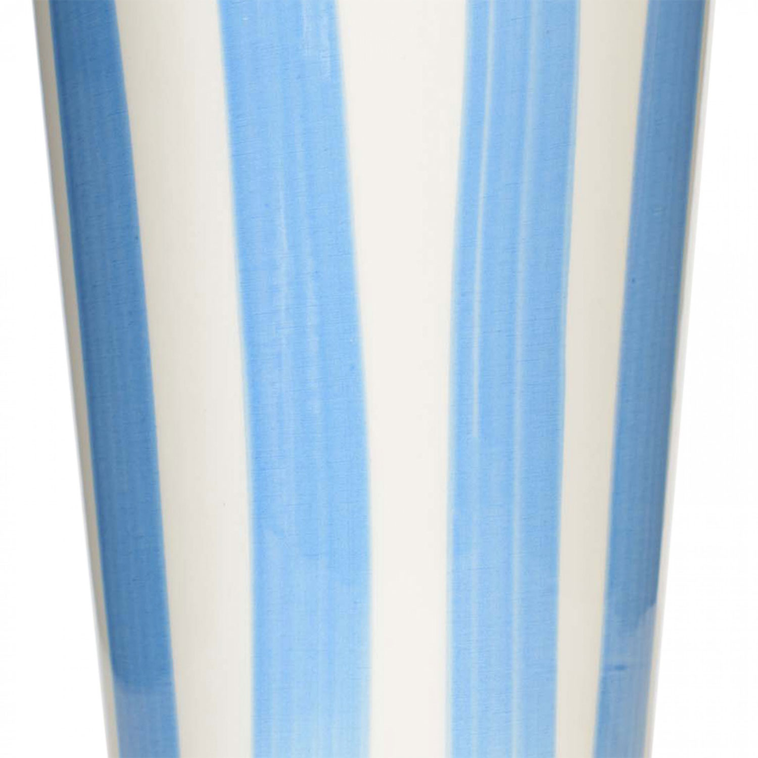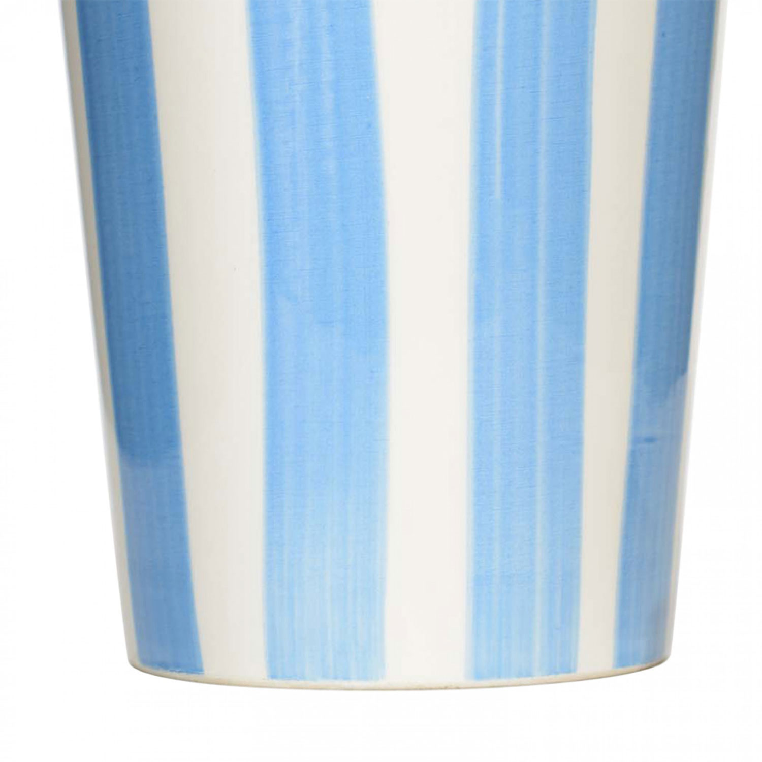 Tall-bodied, tapered glazed ceramic vase with vertical stripes in blue and white.