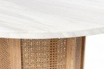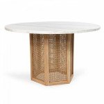 7 Contemporary center /dining tables supported on a 6 sided cerused oak pedestal base with cane panels supporting a round white marble veneer top (PRICED EACH).