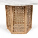 7 Contemporary center /dining tables supported on a 6 sided cerused oak pedestal base with cane panels supporting a round white marble veneer top (PRICED EACH)..