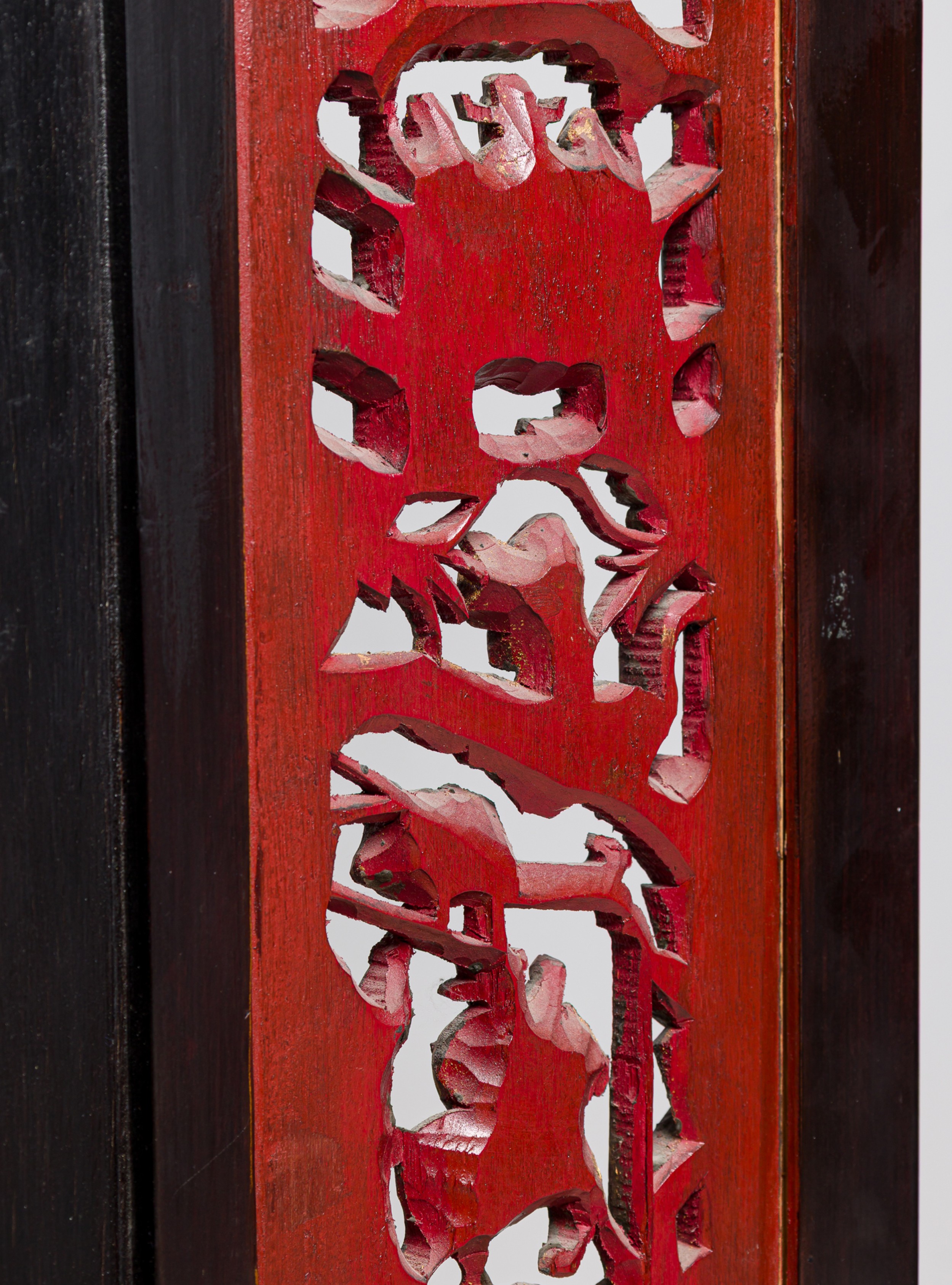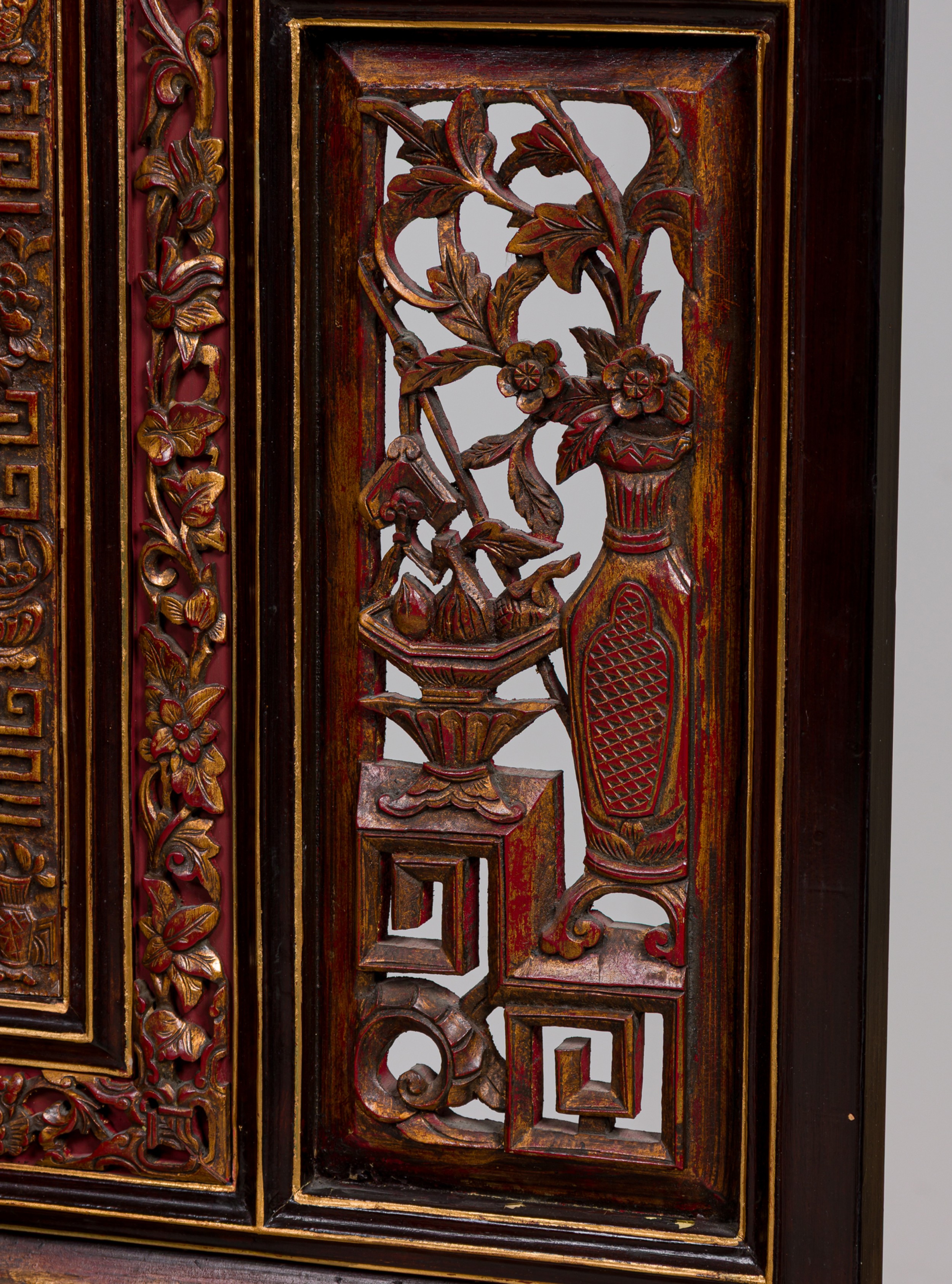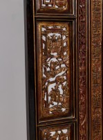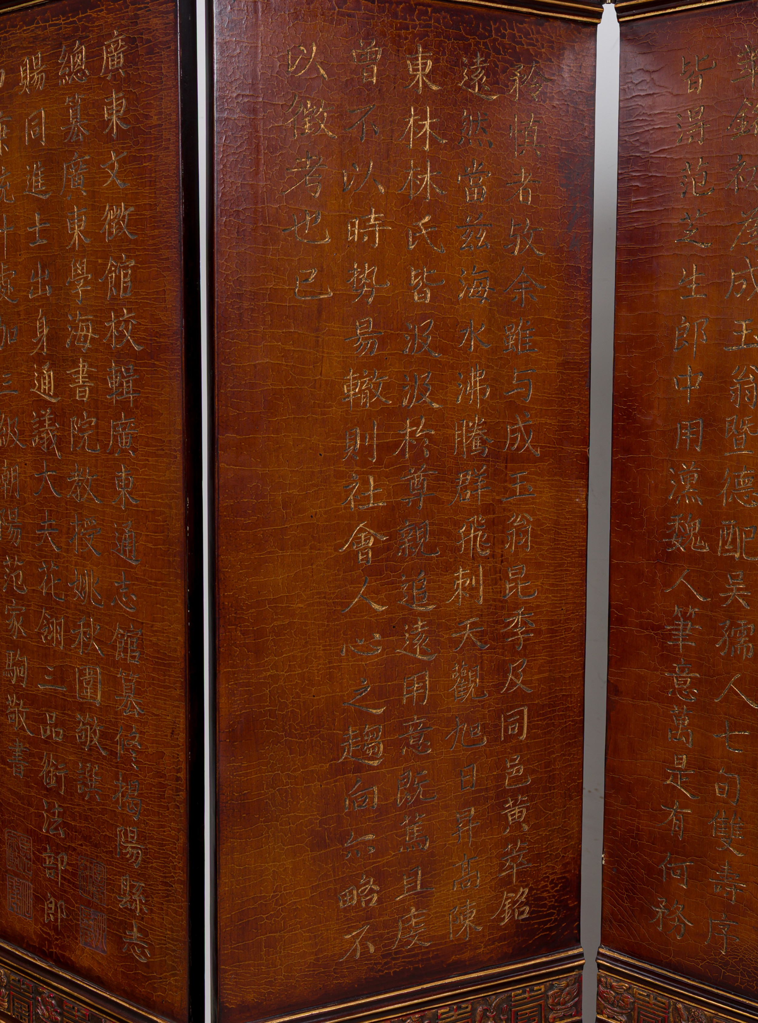 Canton (Guangdong) style 8 panel dark wood screen with a brown lacquer finish screen, low-relief carvings featuring vases, birds, flowers, and monkeys and gilt calligraphy in the central section.