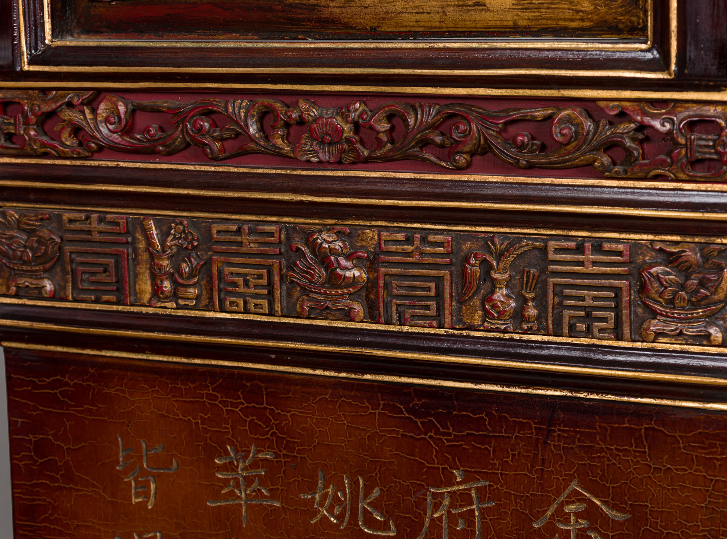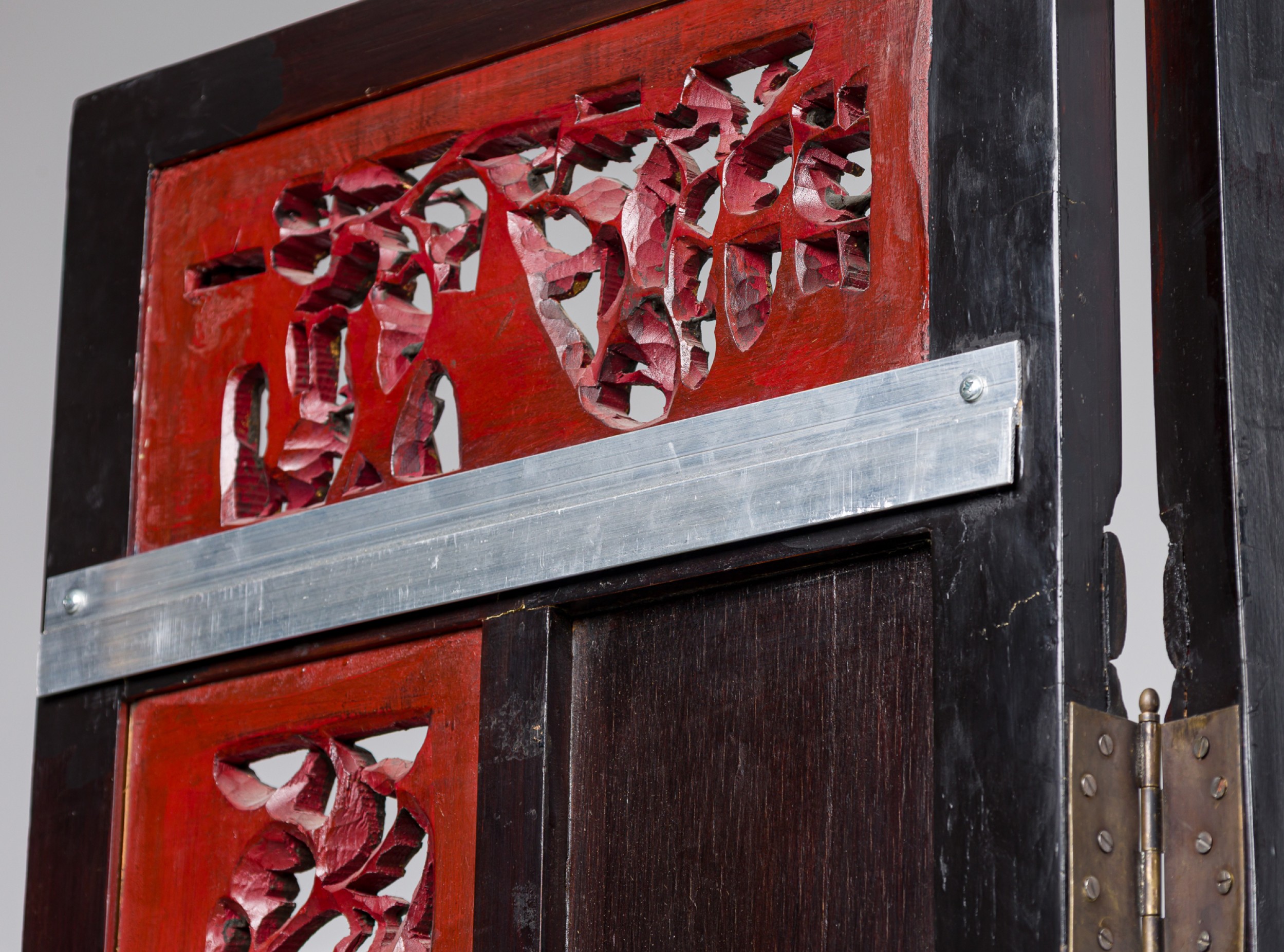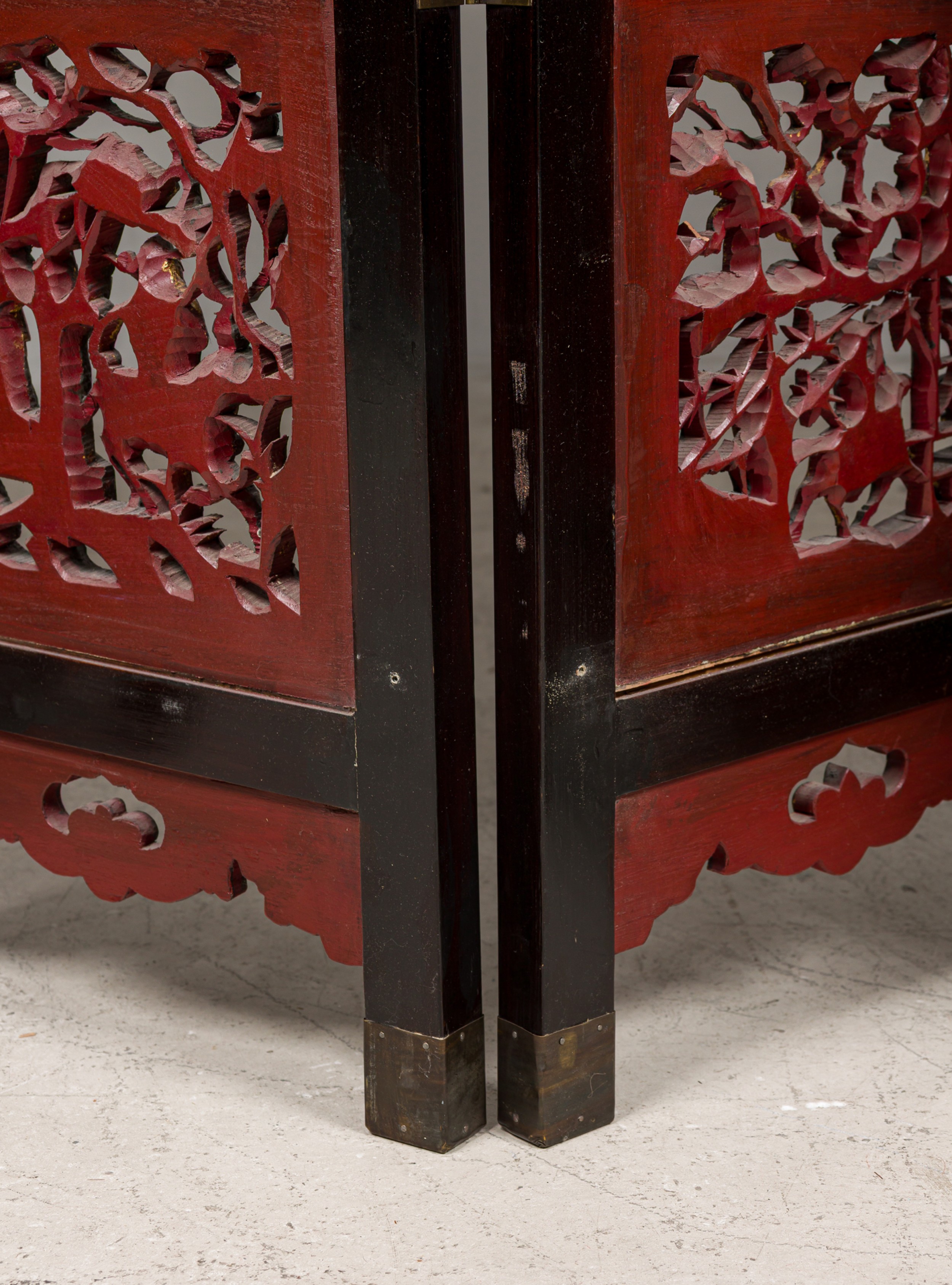 Canton (Guangdong) style 8 panel dark wood screen with a brown lacquer finish screen, low-relief carvings featuring vases, birds, flowers, and monkeys and gilt calligraphy in the central section.