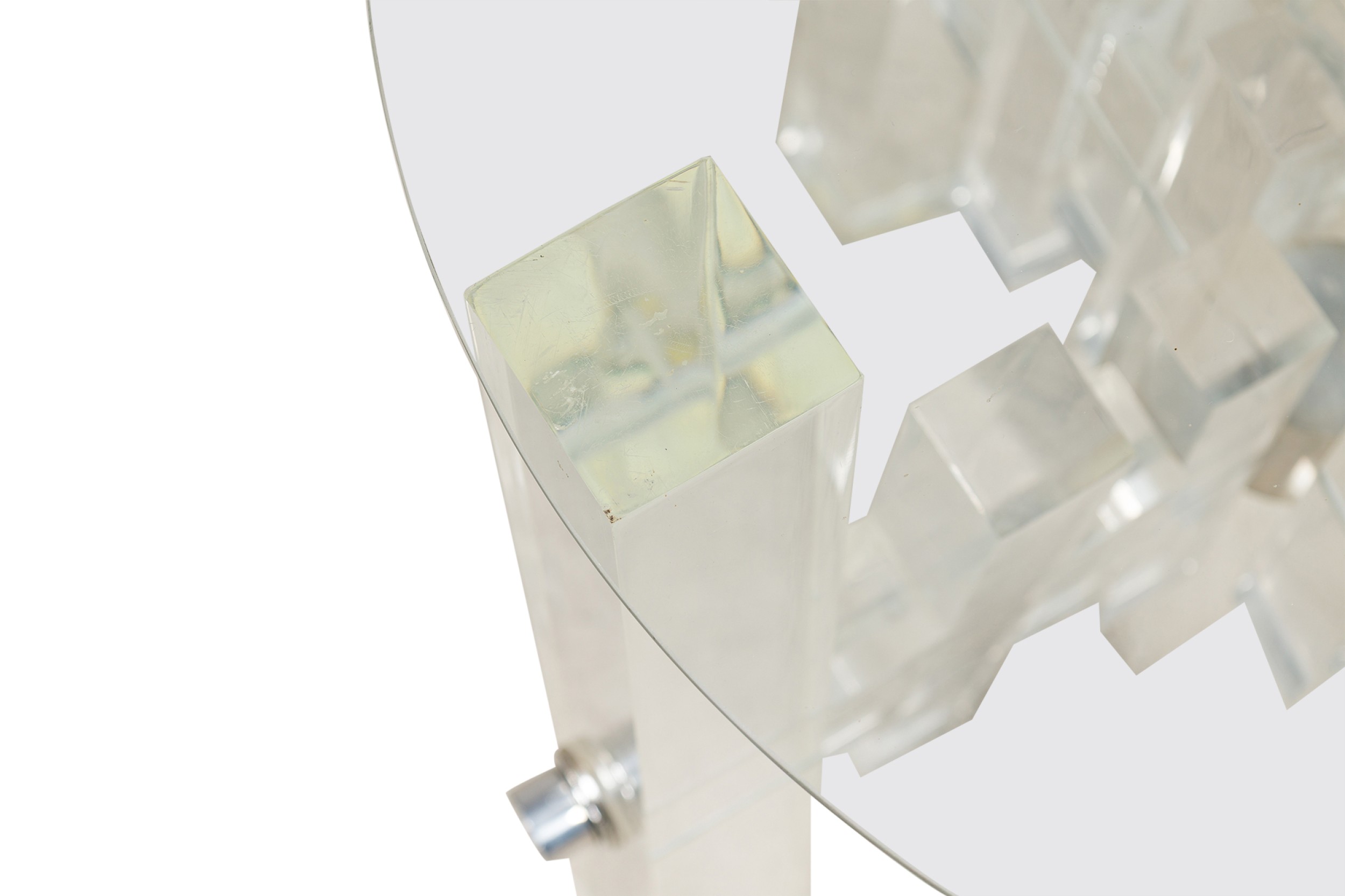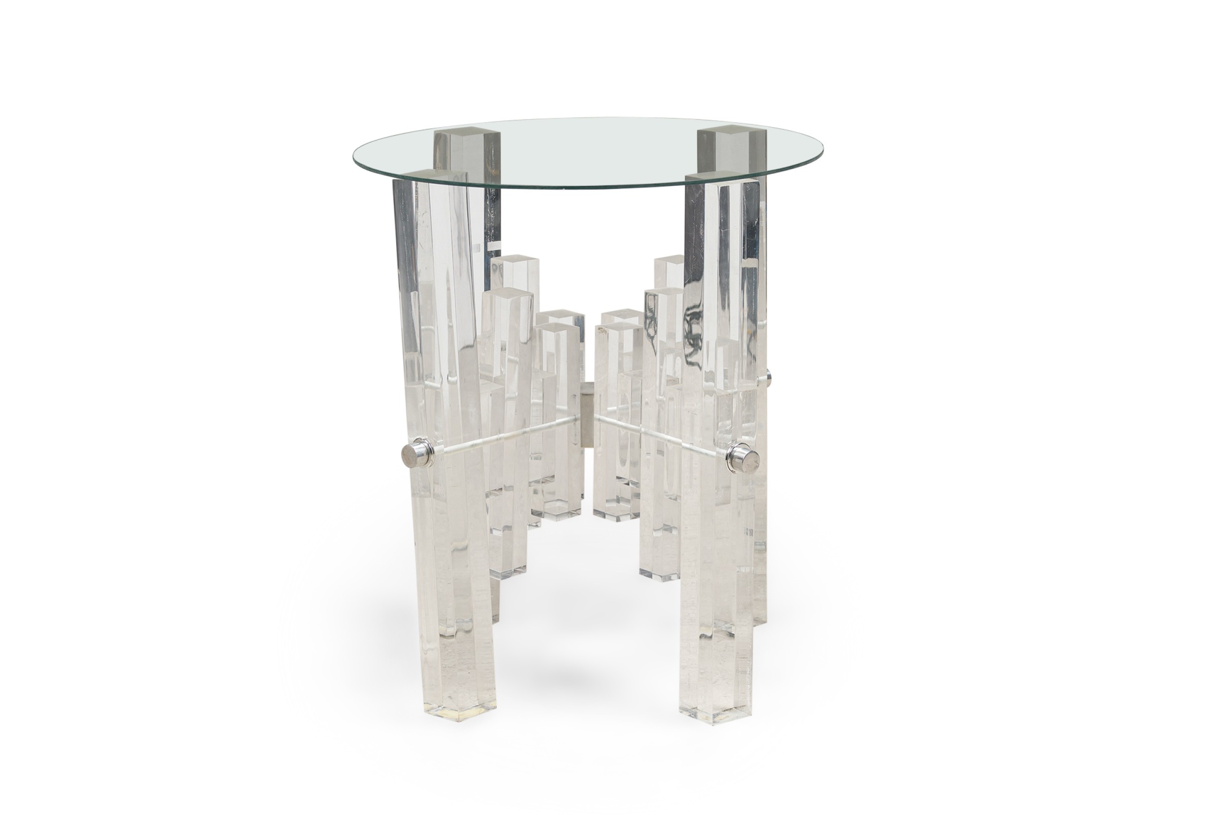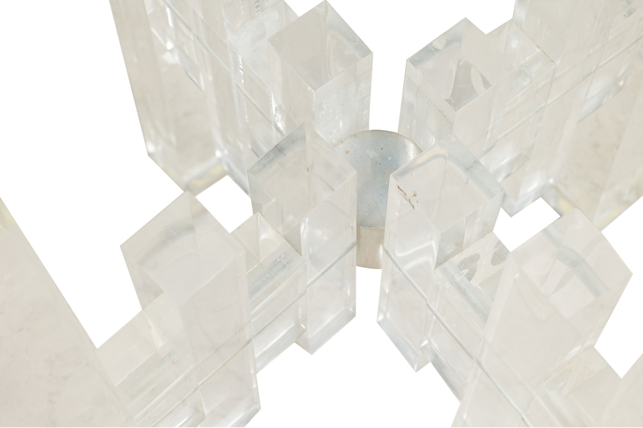 Mid-Century American Lucite geometric table base with 4 rectangular column legs connected with an X-form vertical block stretcher having a metal crossbar and a polished nickel cylindrical center supporting a round glass top (NOTE: a top can be cut to larger size or shape). (CHARLES HOLLIS JONES)