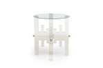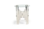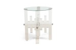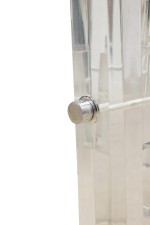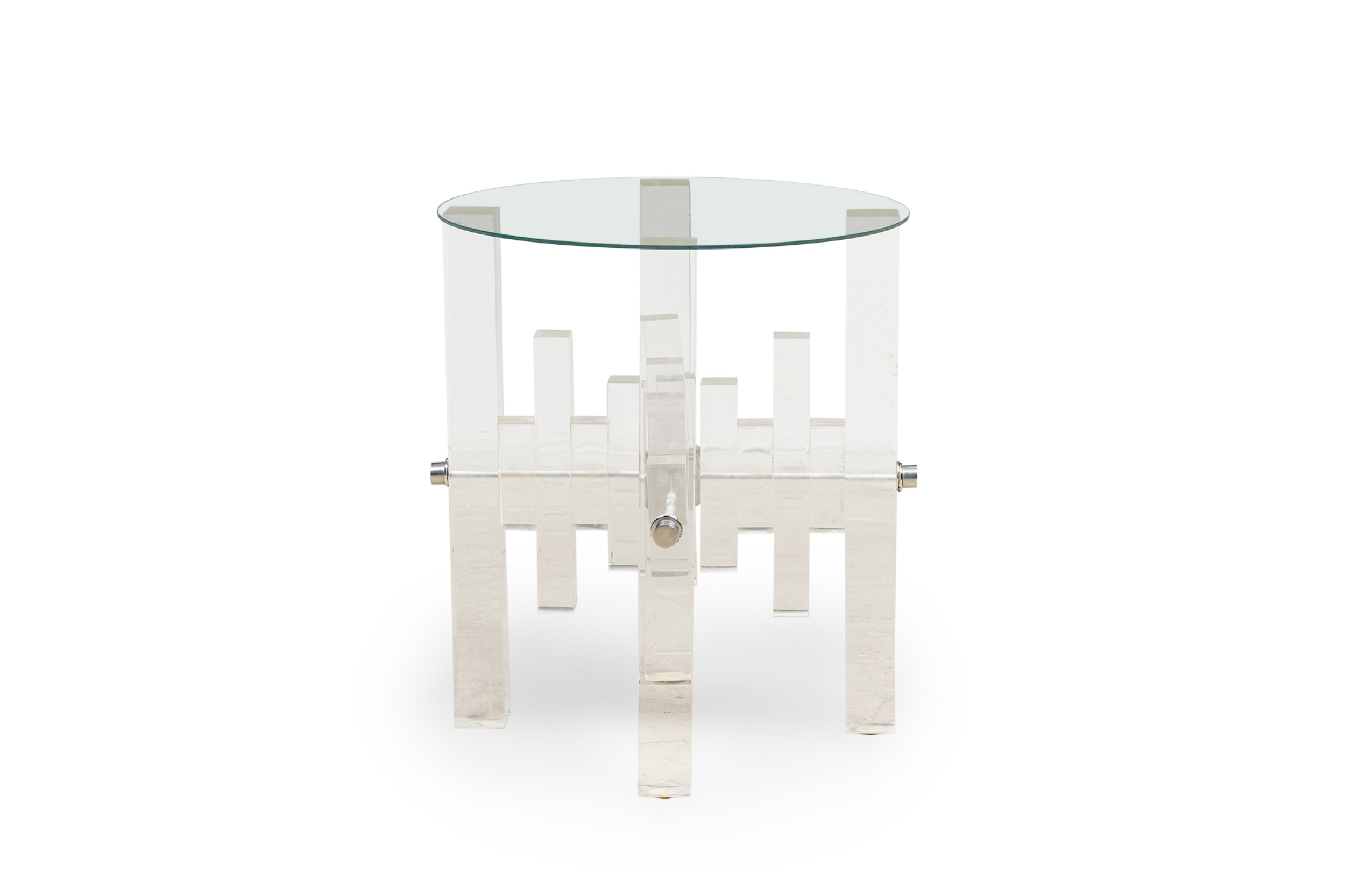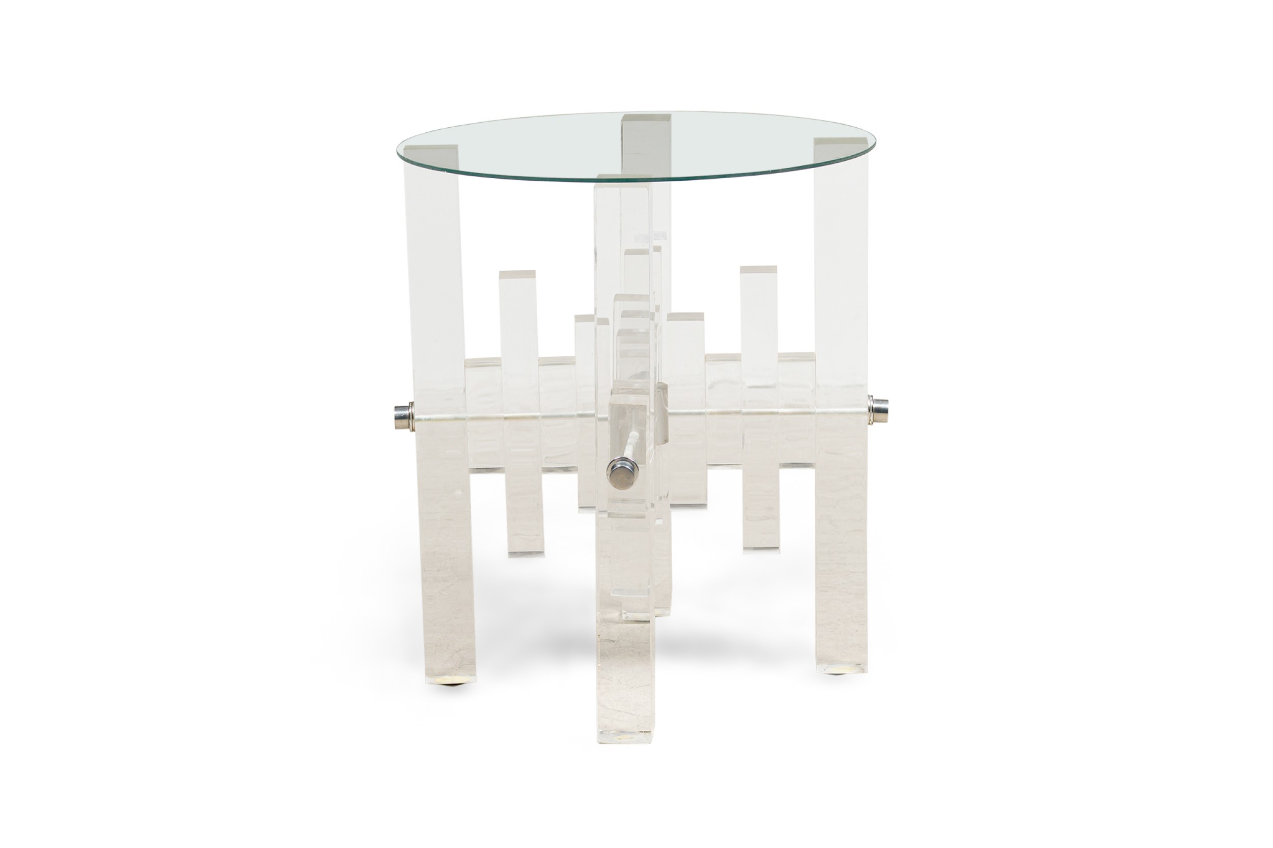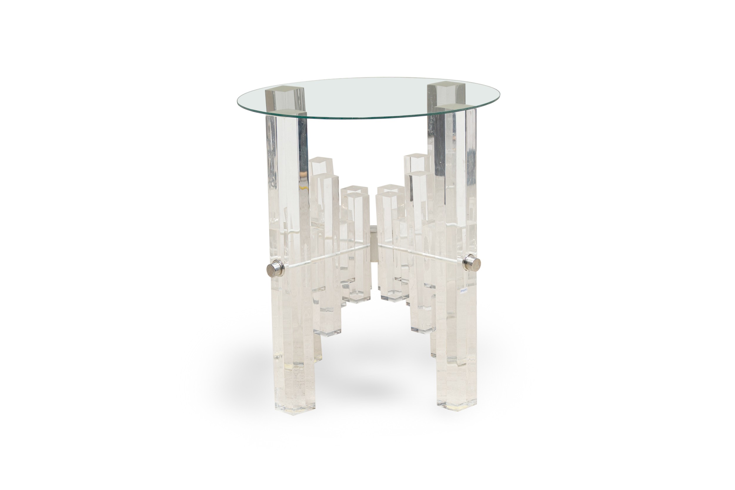 Mid-Century American Lucite geometric table base with 4 rectangular column legs connected with an X-form vertical block stretcher having a metal crossbar and a polished nickel cylindrical center supporting a round glass top (NOTE: a top can be cut to larger size or shape). (CHARLES HOLLIS JONES)